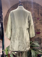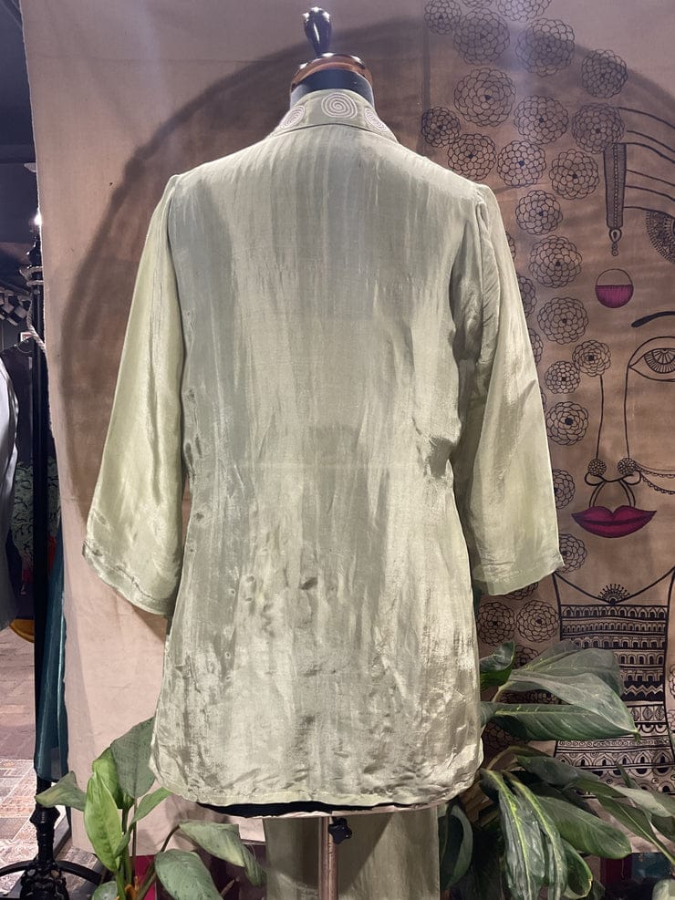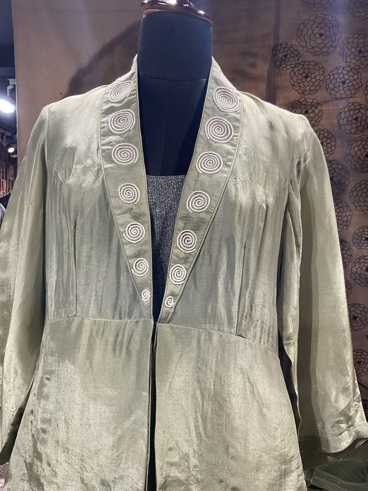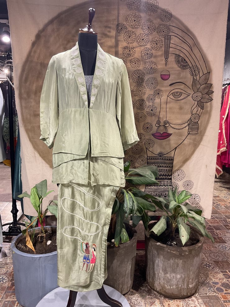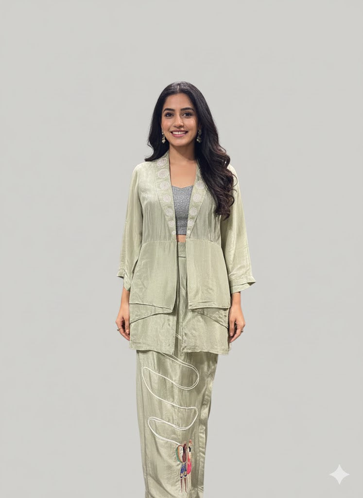 Description: The embroidery coord set is a lce blue, two-piece outfit consisting of a jacket,bustier and pant. The jacket has a V-neckline and is adorned with intricate white embroidery along the neckline and possibly other parts of the garment. The overall look is elegant and sophisticated, with the embroidery adding a touch of traditional or ethnic charm.
