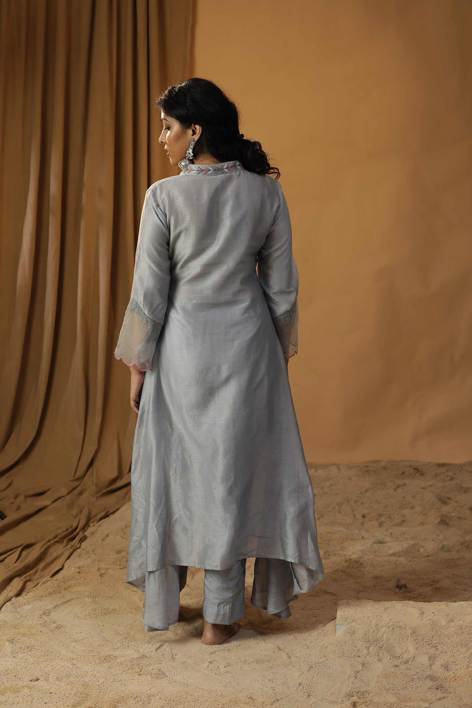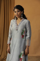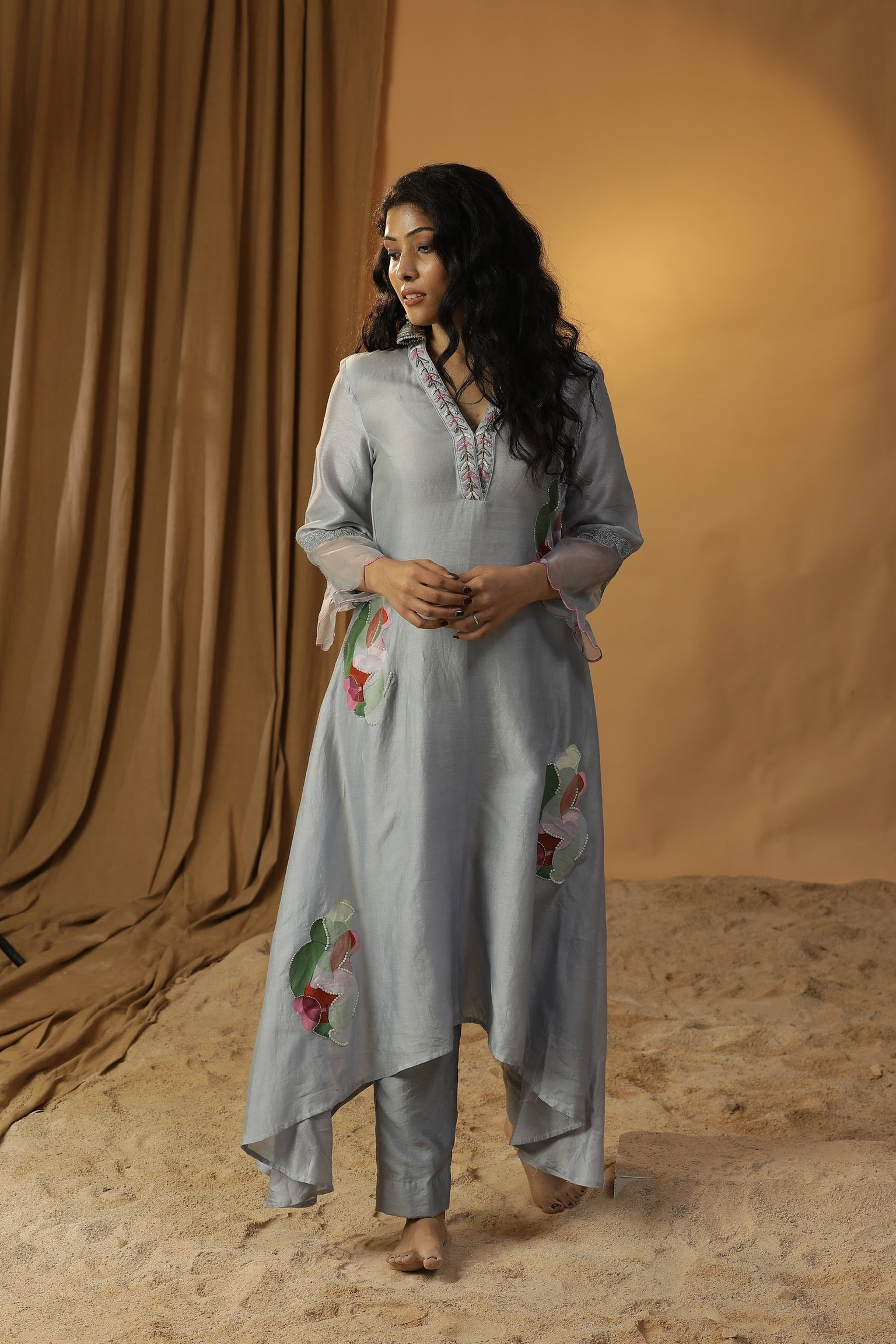 Description: The kurta set is a sky blue colour with handpainted embroidery details. The kurta is long, with 3/4 sleeves and has floral motifs painted on the sides. The kurta is a v-neck with embroidery details on the collar and features floral motifs a mix of pink, green, and red handpainted kurta set. The kurta is long bell sleeves, paired with matching ice blue pants. The overall look is elegant and traditional, perfect for a special occasion.