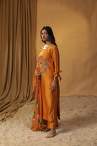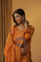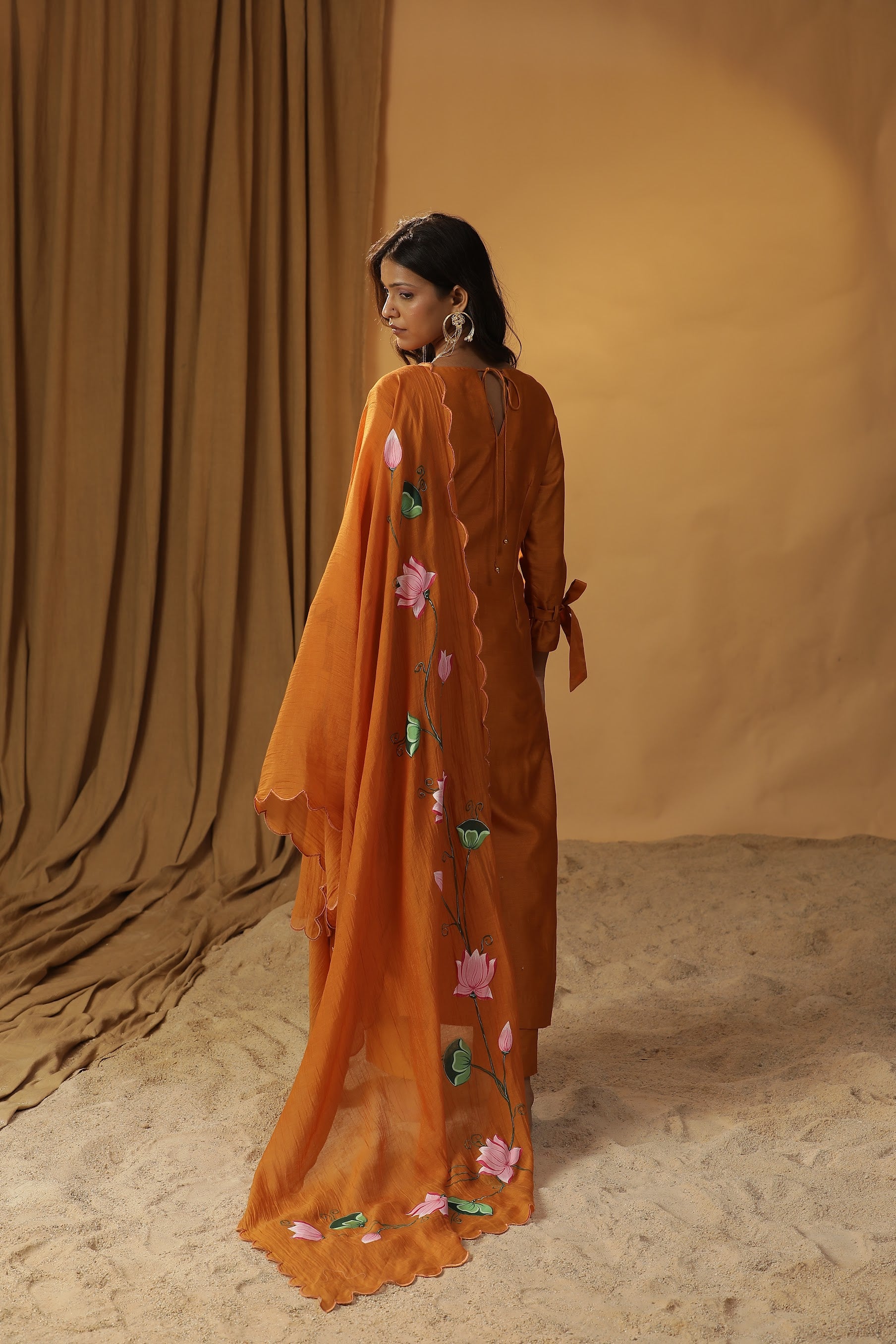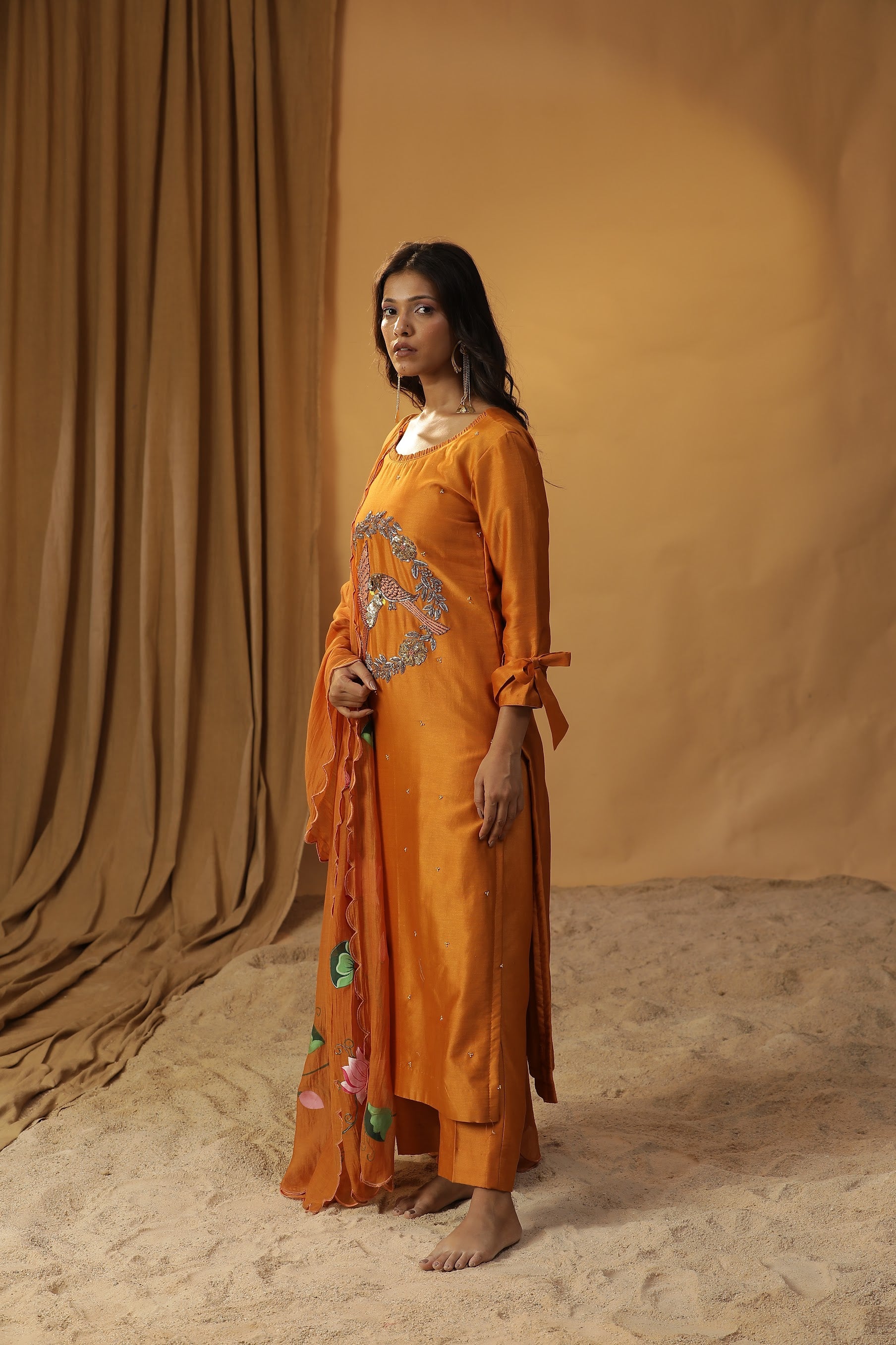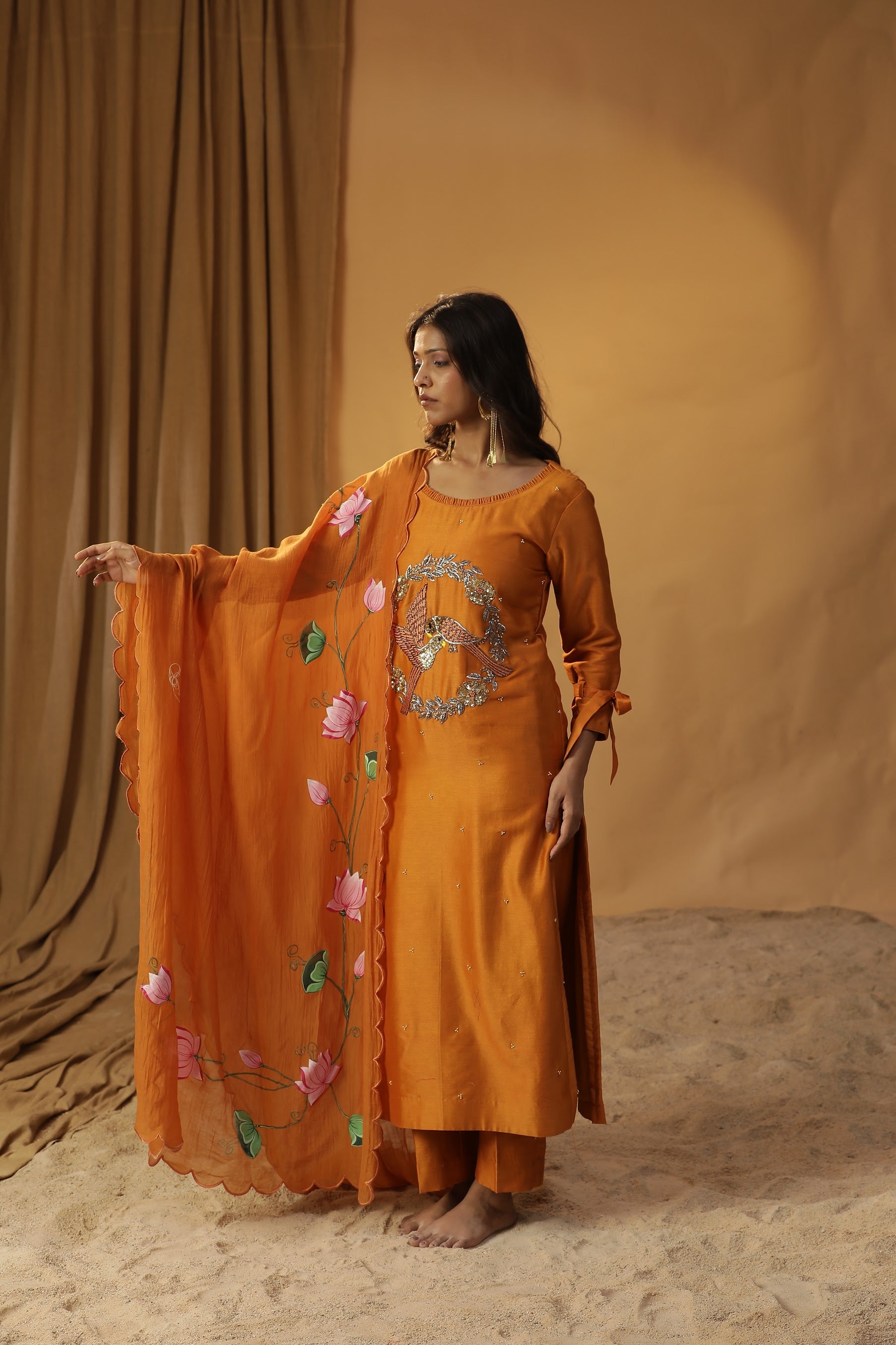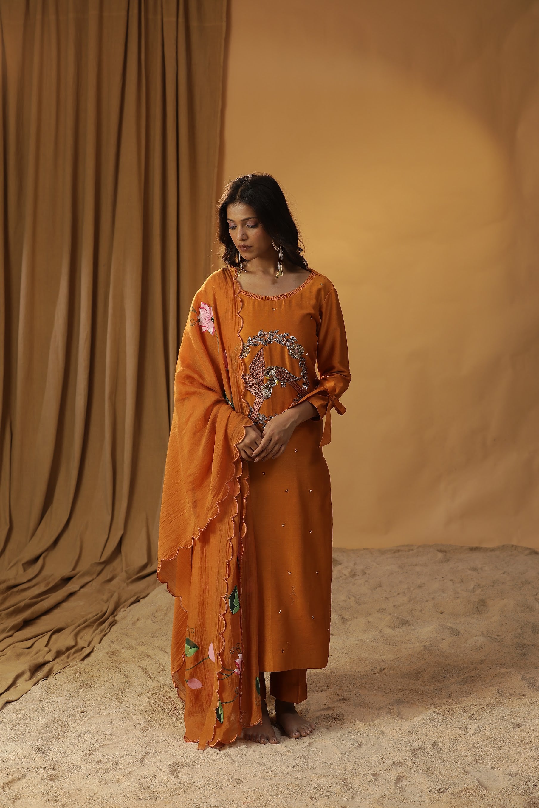 Description: The outfit is a stunning burnt orange suit with a beautiful bird motif embroidered in the center of the kurti. The bird is intricately done in shades ,adding a lovely contrast to the outfit. The kurti has delicate scalloped edges, giving it an elegant touch. A matching pichwai dupatta with floral motifs and scalloped edges complements the suit perfectly. The overall look is ethnic and elegant, making it perfect for festive or traditional occasions in India.