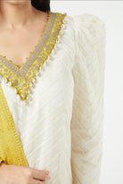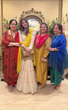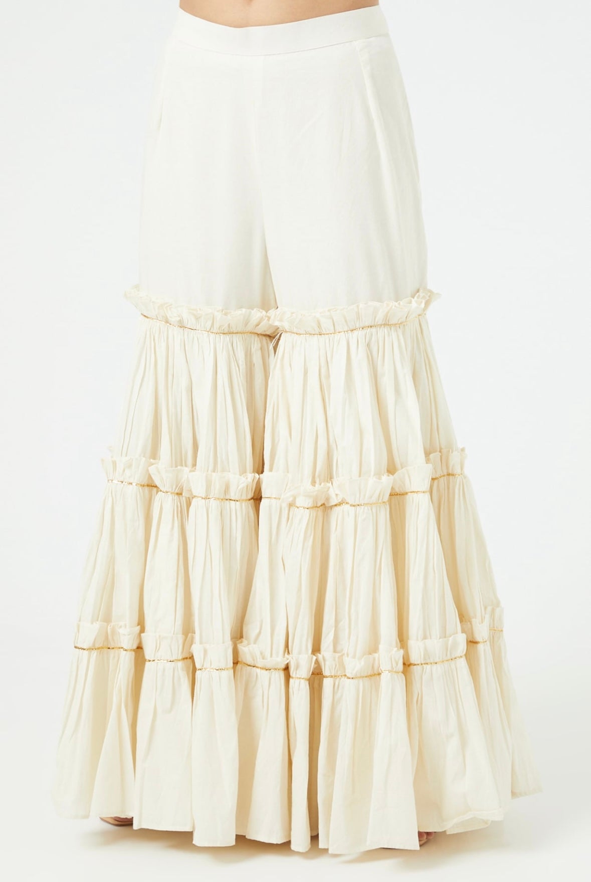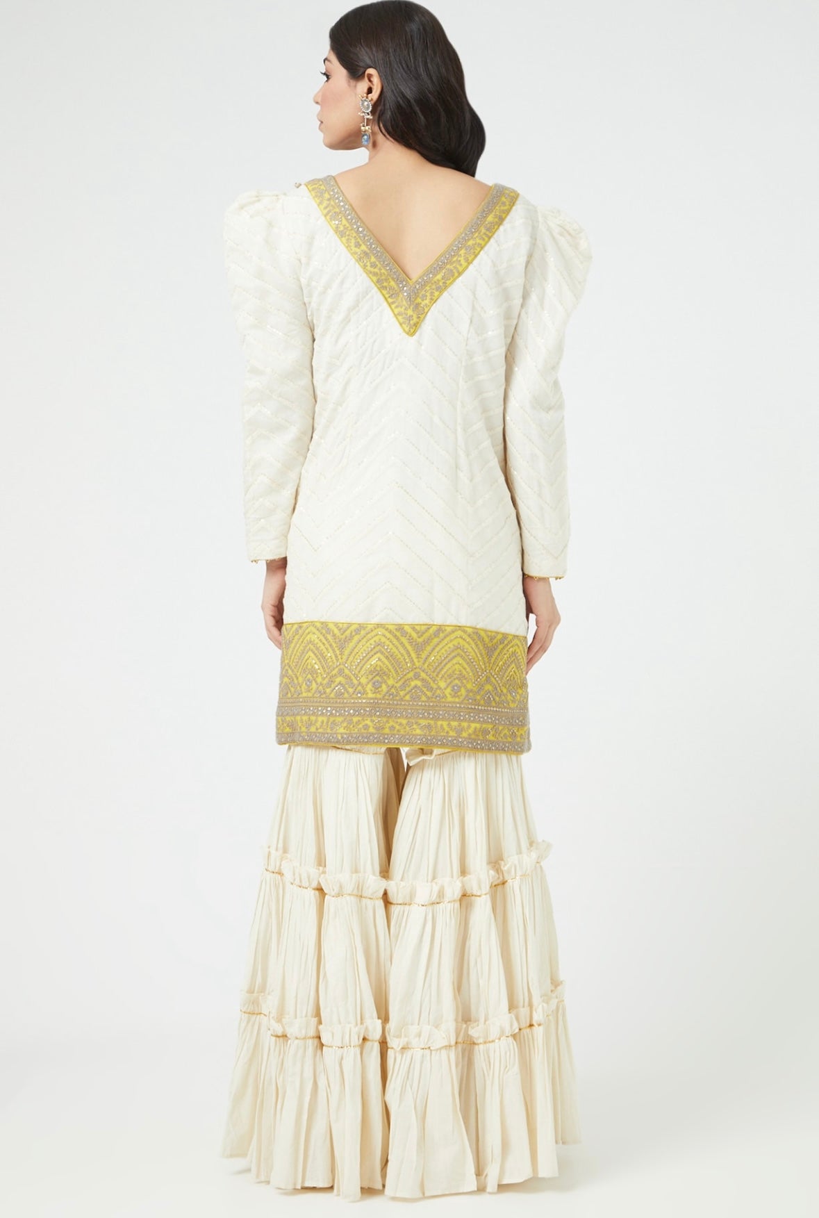 Description: This outfit is a stunning embroidered sharara set! 😍 It's a beautiful combo of white and yellow. Comes with patra dupatta in contrasting yellow color. The kurta is a white with gold embroidery around the V-neck and at the bottom hem. The sharara is exactly a traditional sharara but seems to be a modern interpretation. The bottom part a sharara typically would be, but it looks like the outfit is more of a kurti with a dupatta. The overall look is elegant and traditional, perfect for a festive occasion like a wedding or Diwali function.