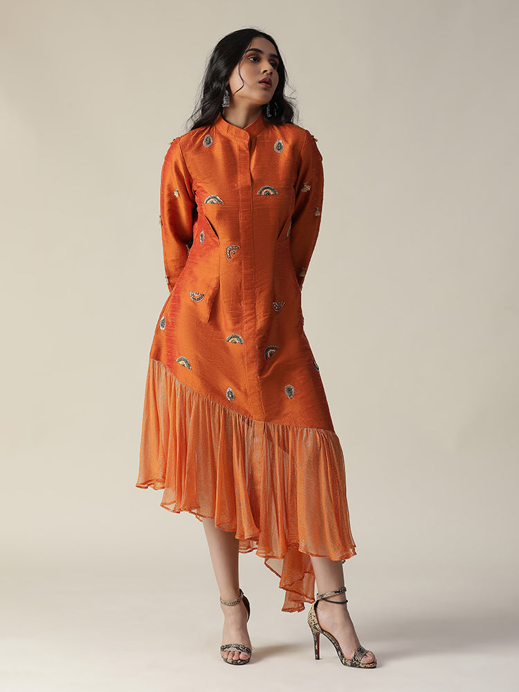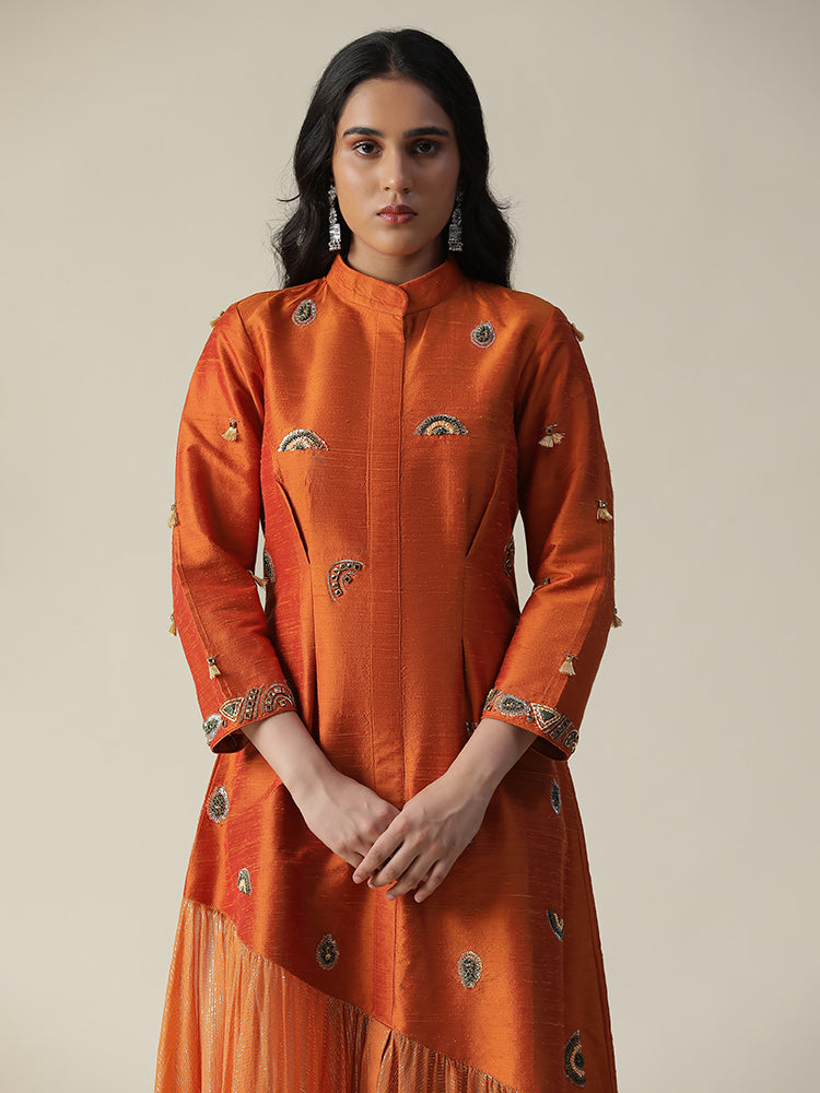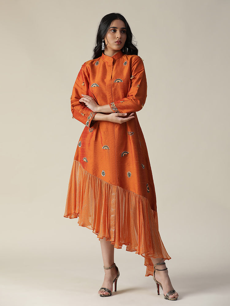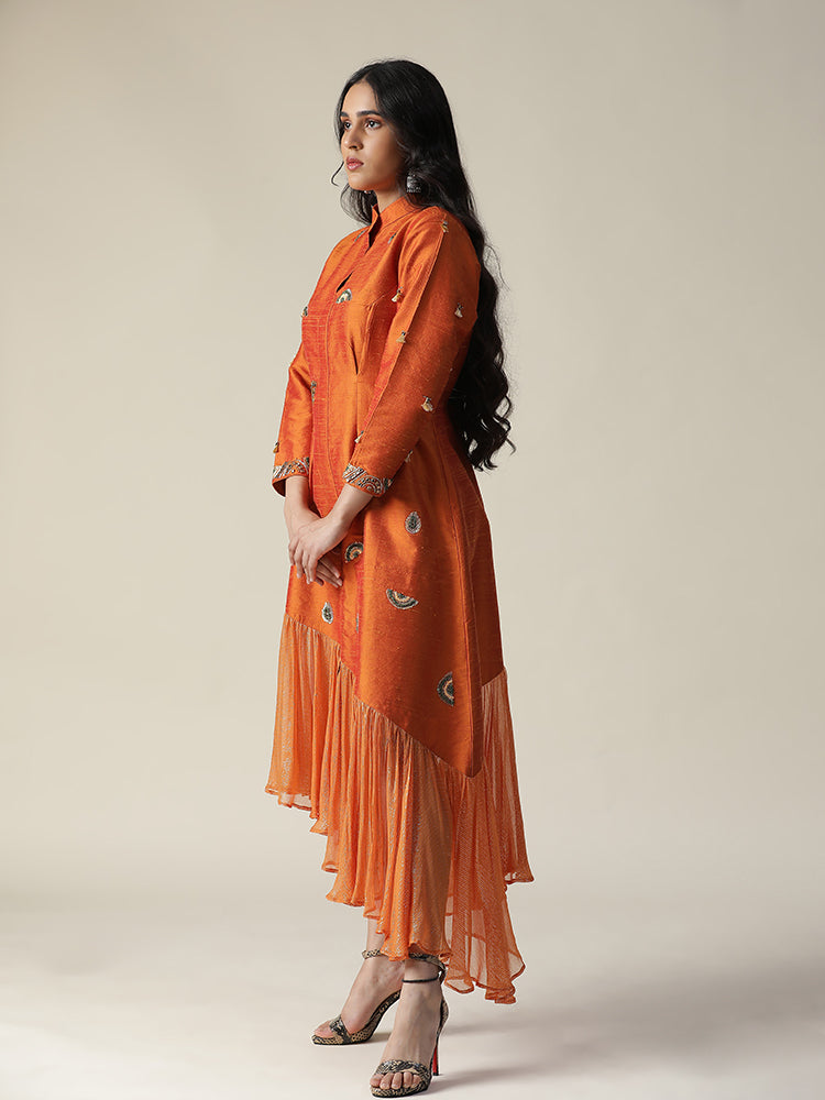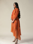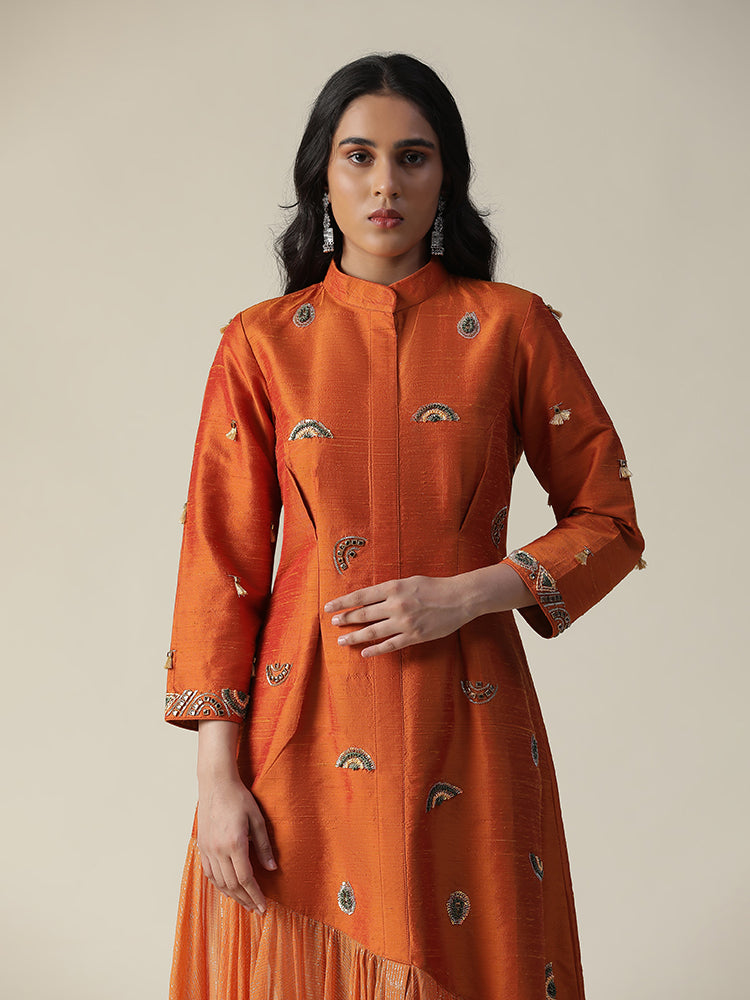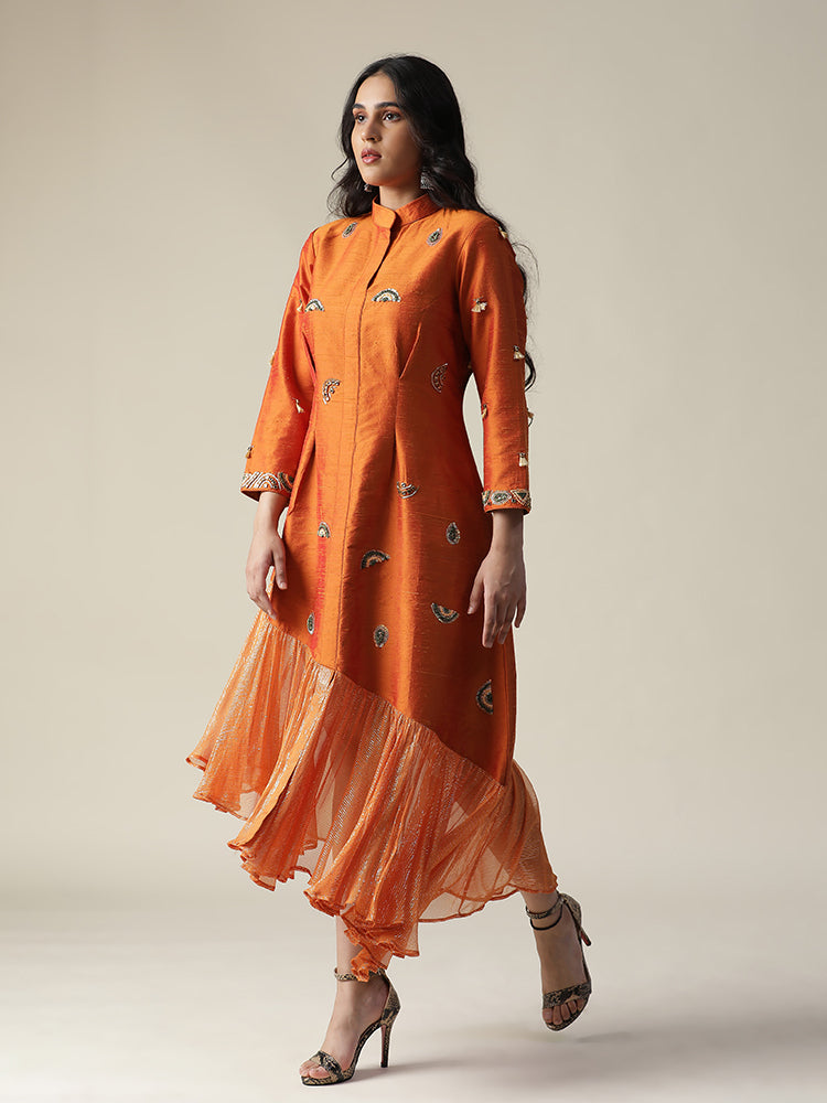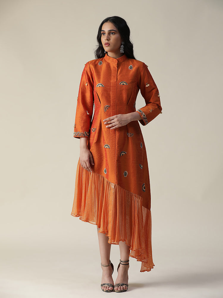 Description: Featuring our burnt orange raw silk tunic. Comes with unique styled gathers/flare of organza at the hemline. stones, sequence works all over the dress and tassels on sleeves (3/4th sleeve). The dress made of a lightweight fabric, possibly raw silk, and features embroidery details on the front and possibly sleeves. The model is wearing it with heels, giving the outfit a stylish and elegant look.