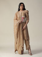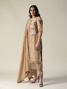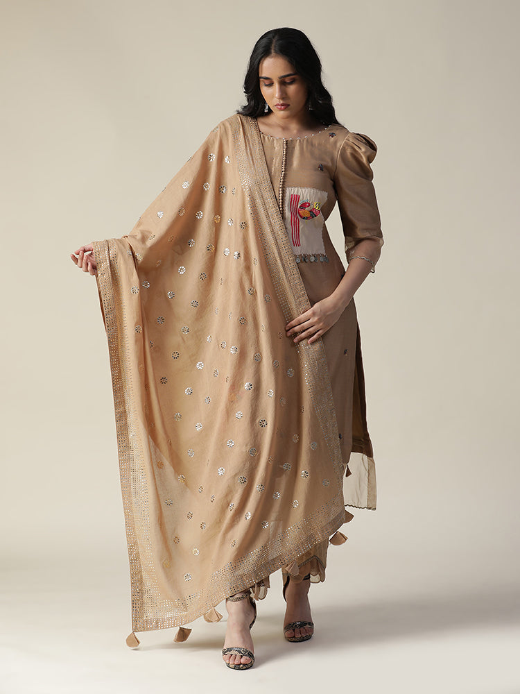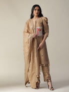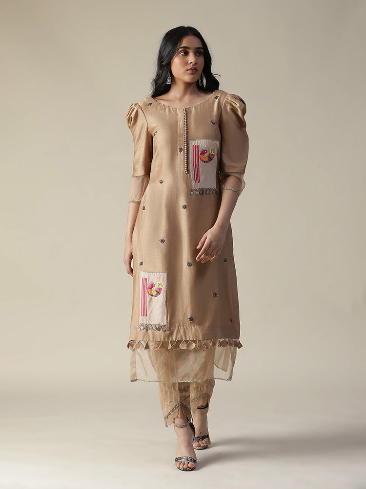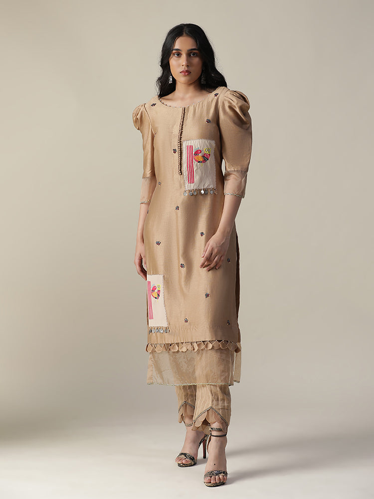 Description : Featuring our chanderi hand painted beige suit set. comes with a straight kurta with hand painting patch work & puff sleeves, straight pant with patra dupatta. Handpainted golden kurta with puff sleeves. Comes with ankle length pants and dupatta.The suit in the image is actually a traditional Indian outfit, likely a kurta or pant with a dupatta.