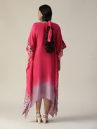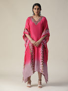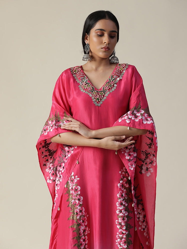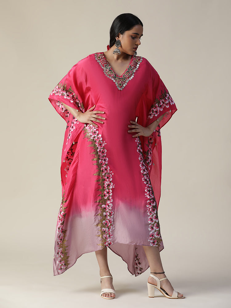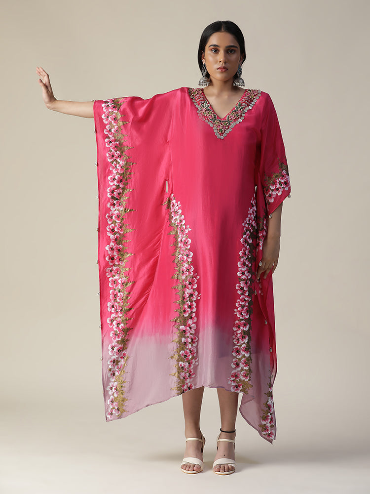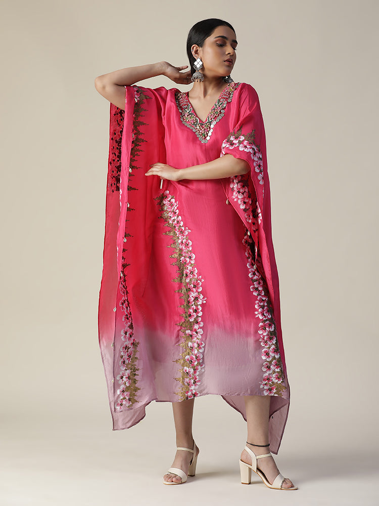 Description: Featuring our hot pink hand painted kaftan with heavy cut-dana work at neck(v-neck). That outfit š„! The hot pink kaftan with floral embroidery by Arpita Sulakshana looks super š. The ombre effect from hot pink to light pink is giving major fashion goalsĀ