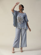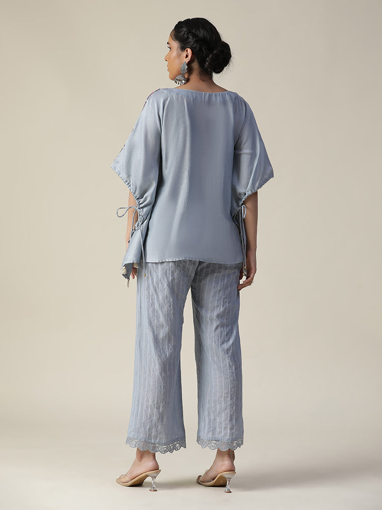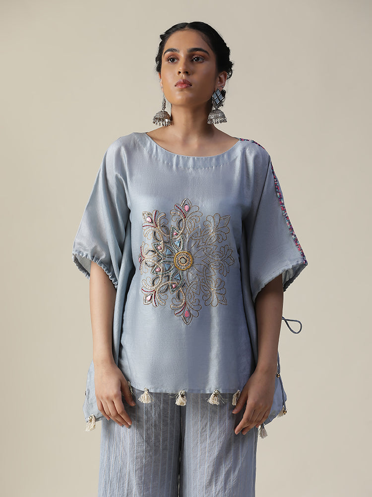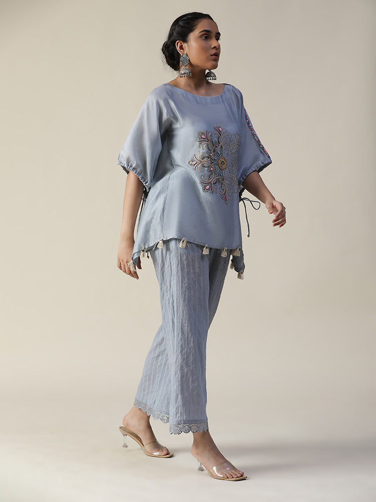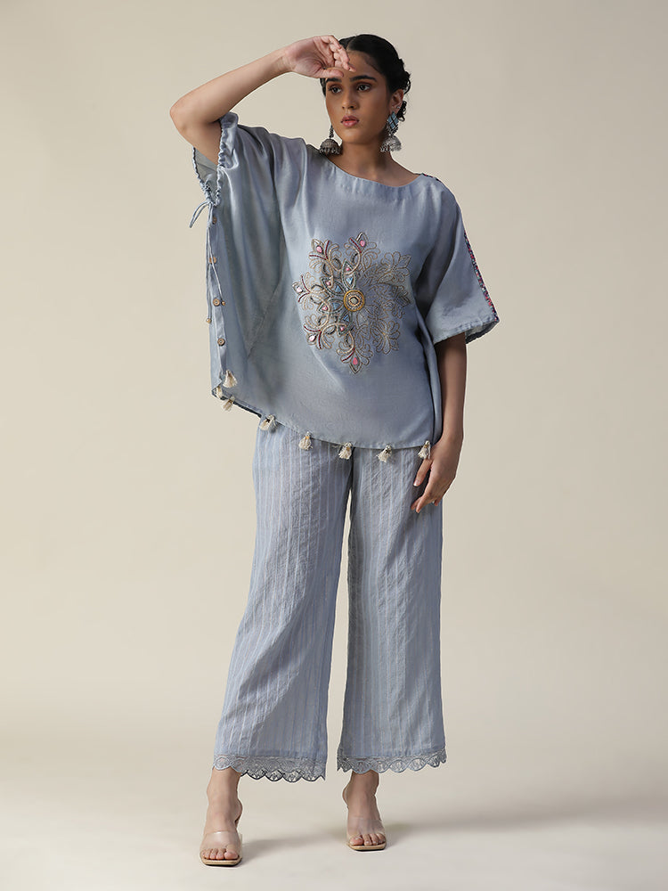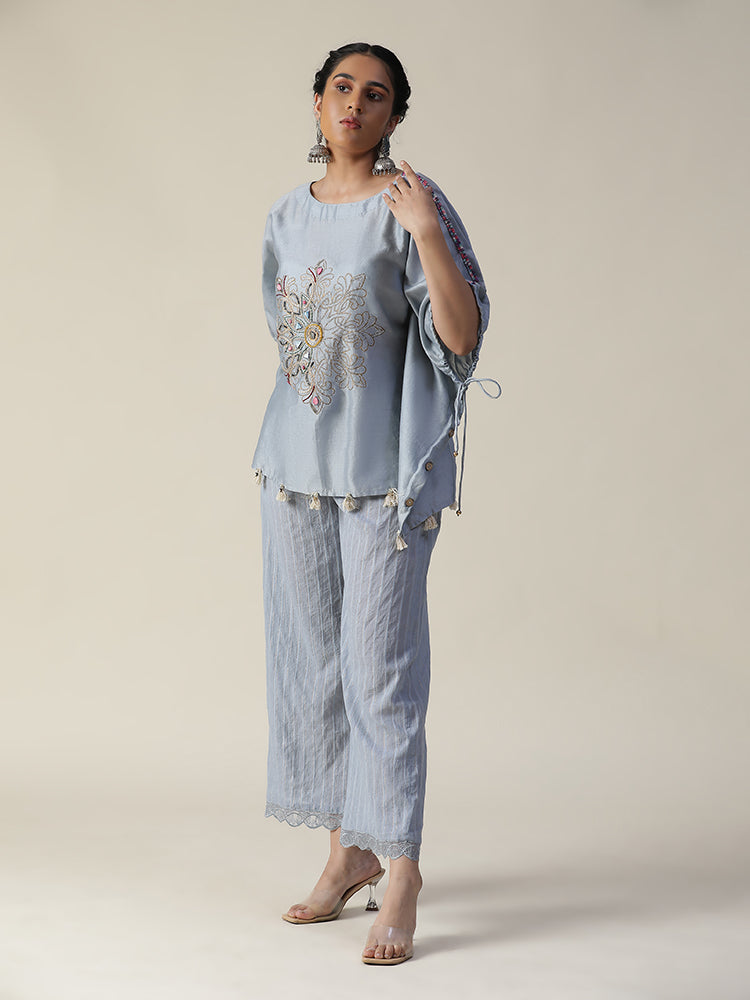 Description: Featuring our ice blue embroidered short kaftan cord set. Comes with an ankle length lurex trouser pant with lace detailing at hem and a hip length boat neck short kaftan with a single golden printed motif on front decorated with silver zari thread, stones, resham thread, cut-dana & sequence. Wooden buttons at sideseam, tassels at hemline & lace detailing on sleeve.