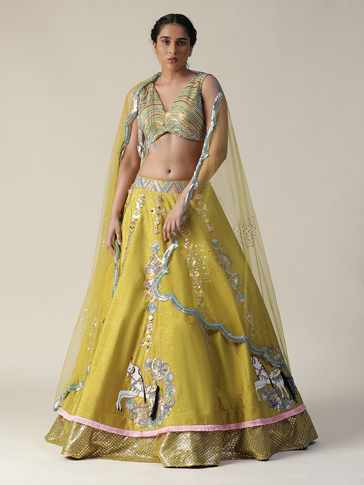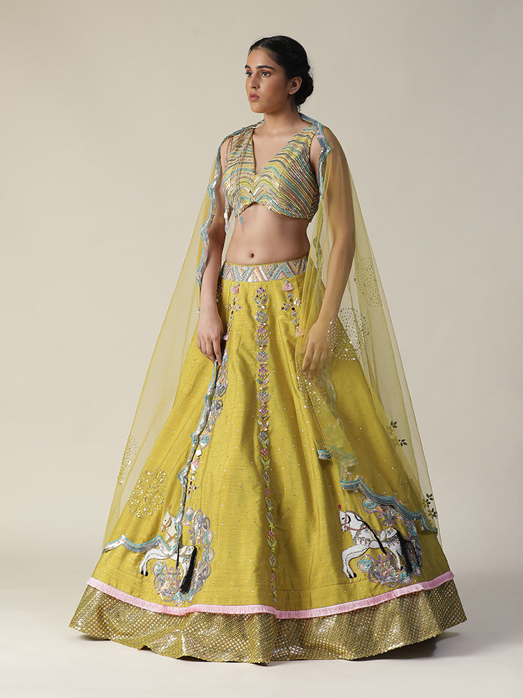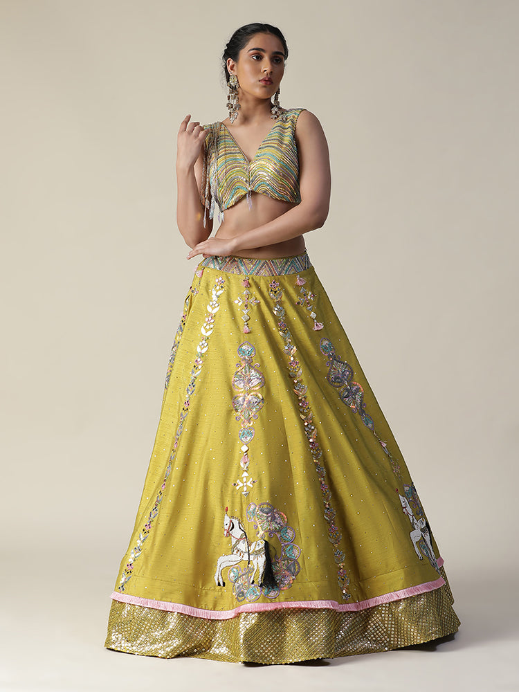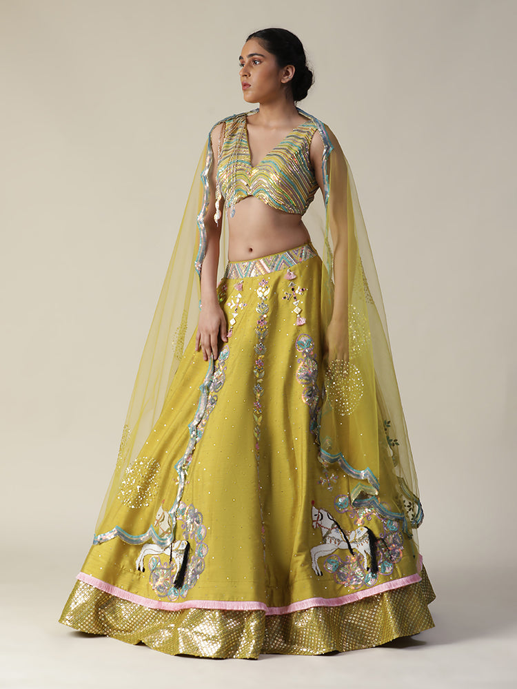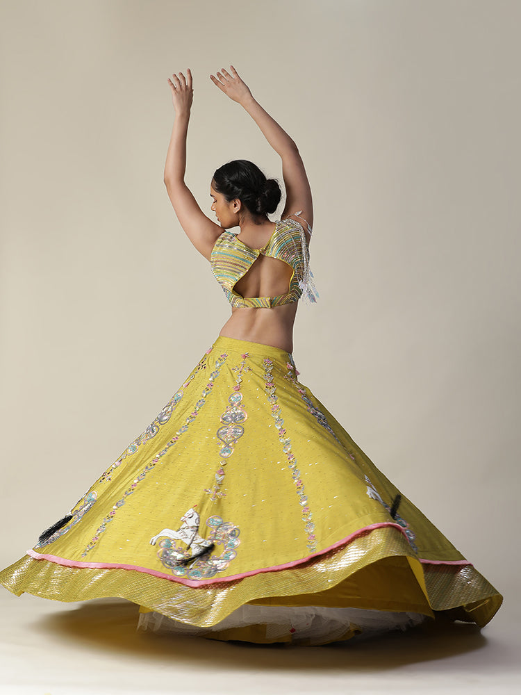 Description: Featuring our yellow raw silk heavy embroidered lehenga set. The lehenga comes with beautiful beaded horse motif, where the kali's are embroidered using sequin, mirrors, tassels and leather patches.The blouse is embellished using sequins with beaded fringe on the shoulder. And a net dupatta with mirror motifs and cutwork at edges with sequin work.