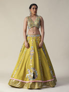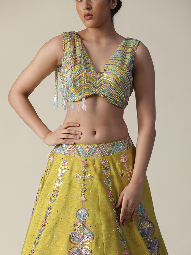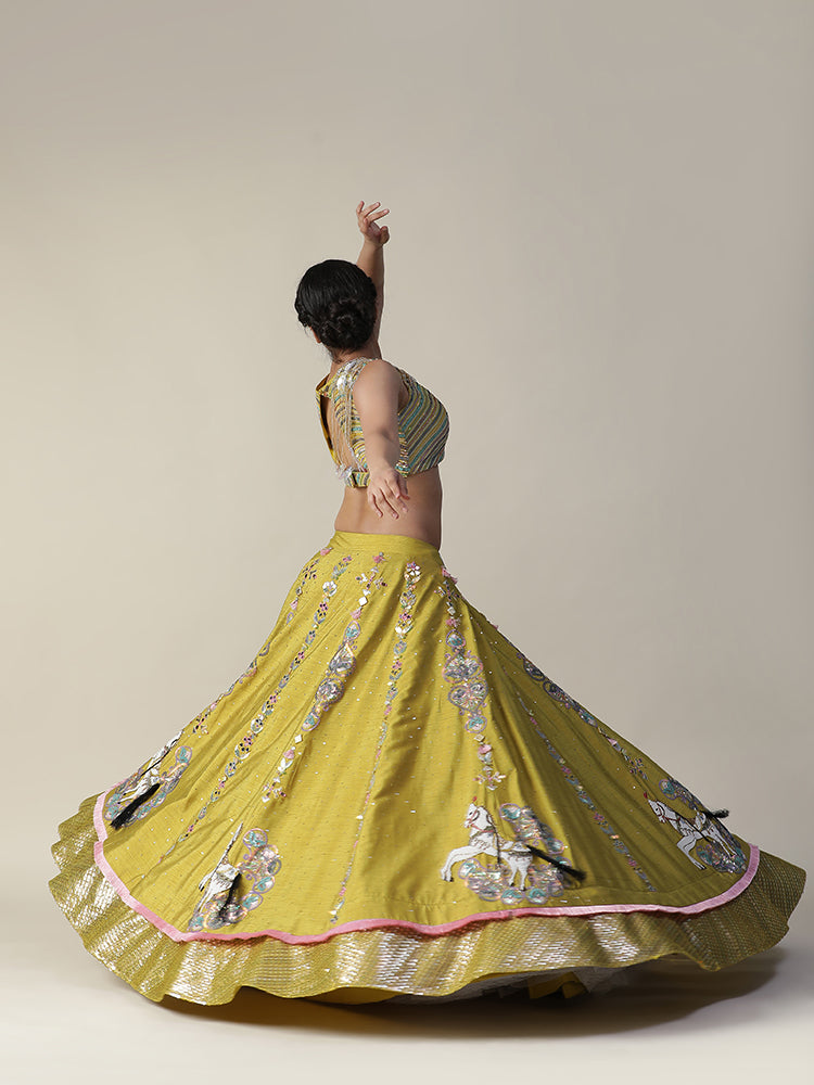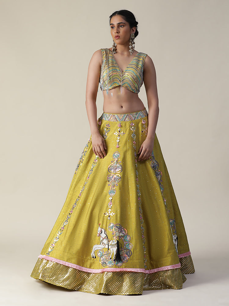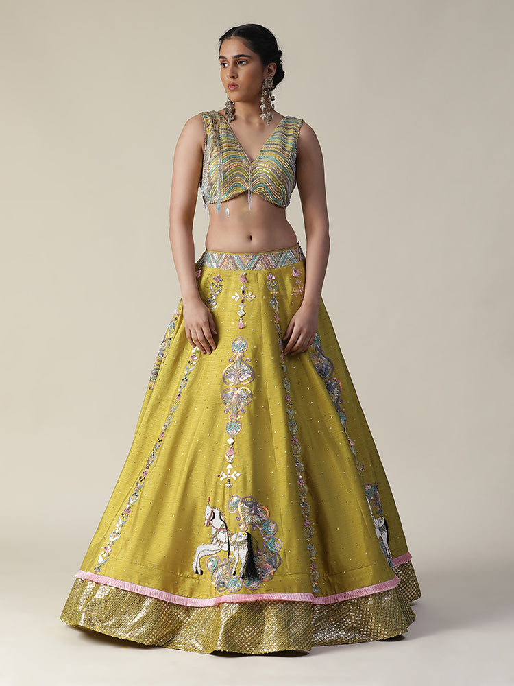 Description: Featuring our yellow raw silk heavy embroidered lehenga set. The lehenga comes with beautiful beaded horse motif, where the kali's are embroidered using sequin, mirrors, tassels and leather patches.The blouse is embellished using sequins with beaded fringe on the shoulder. And a net dupatta with mirror motifs and cutwork at edges with sequin work.