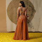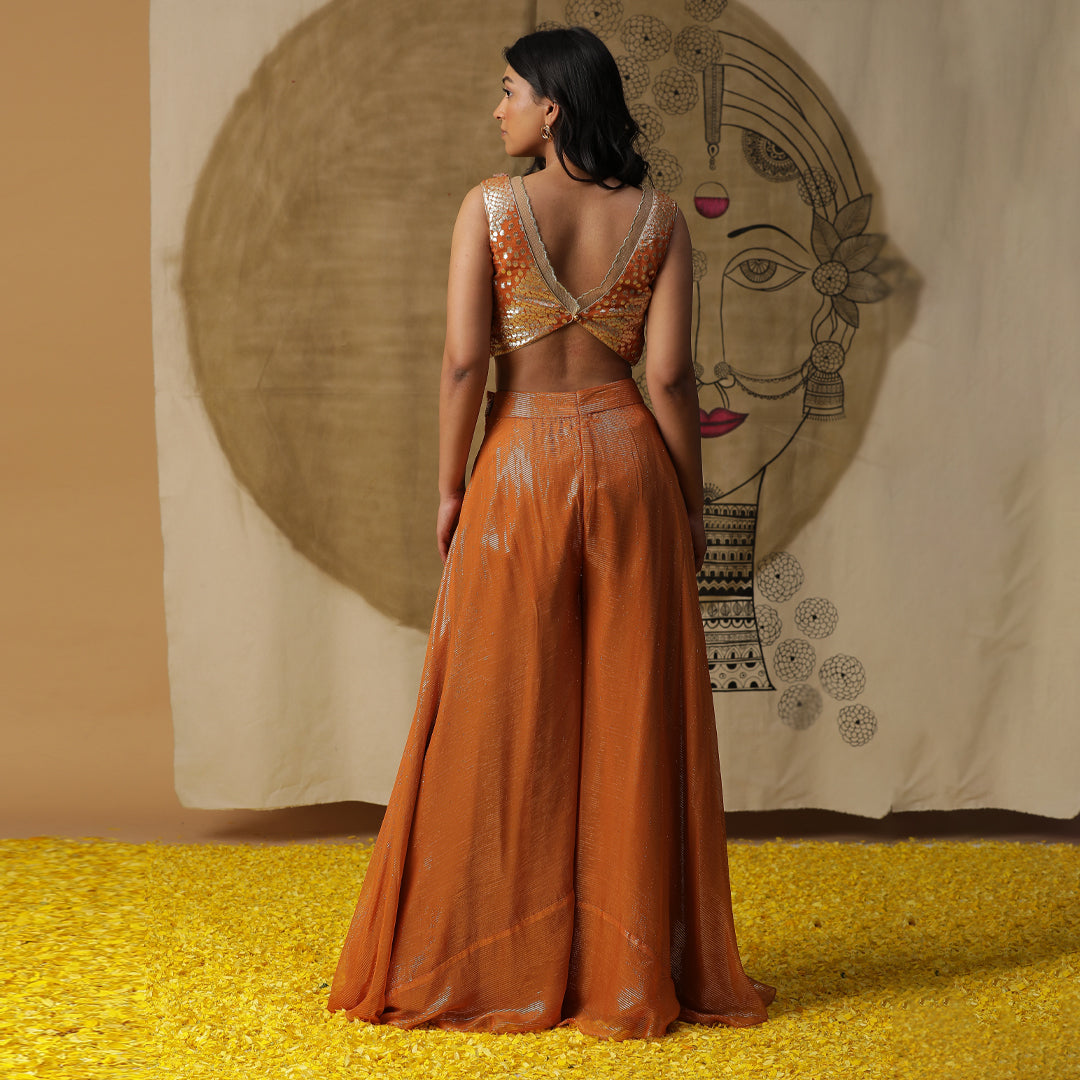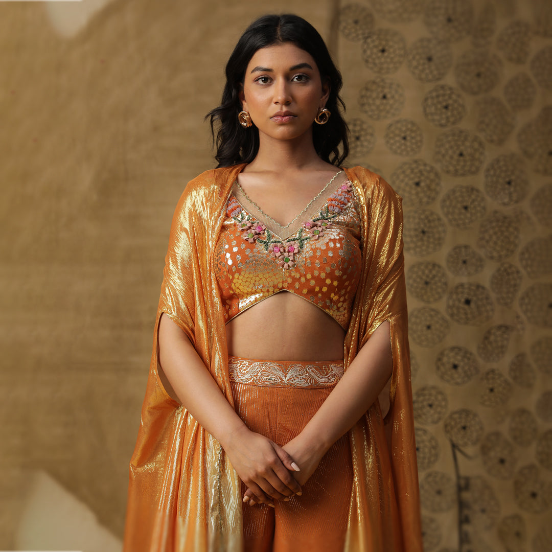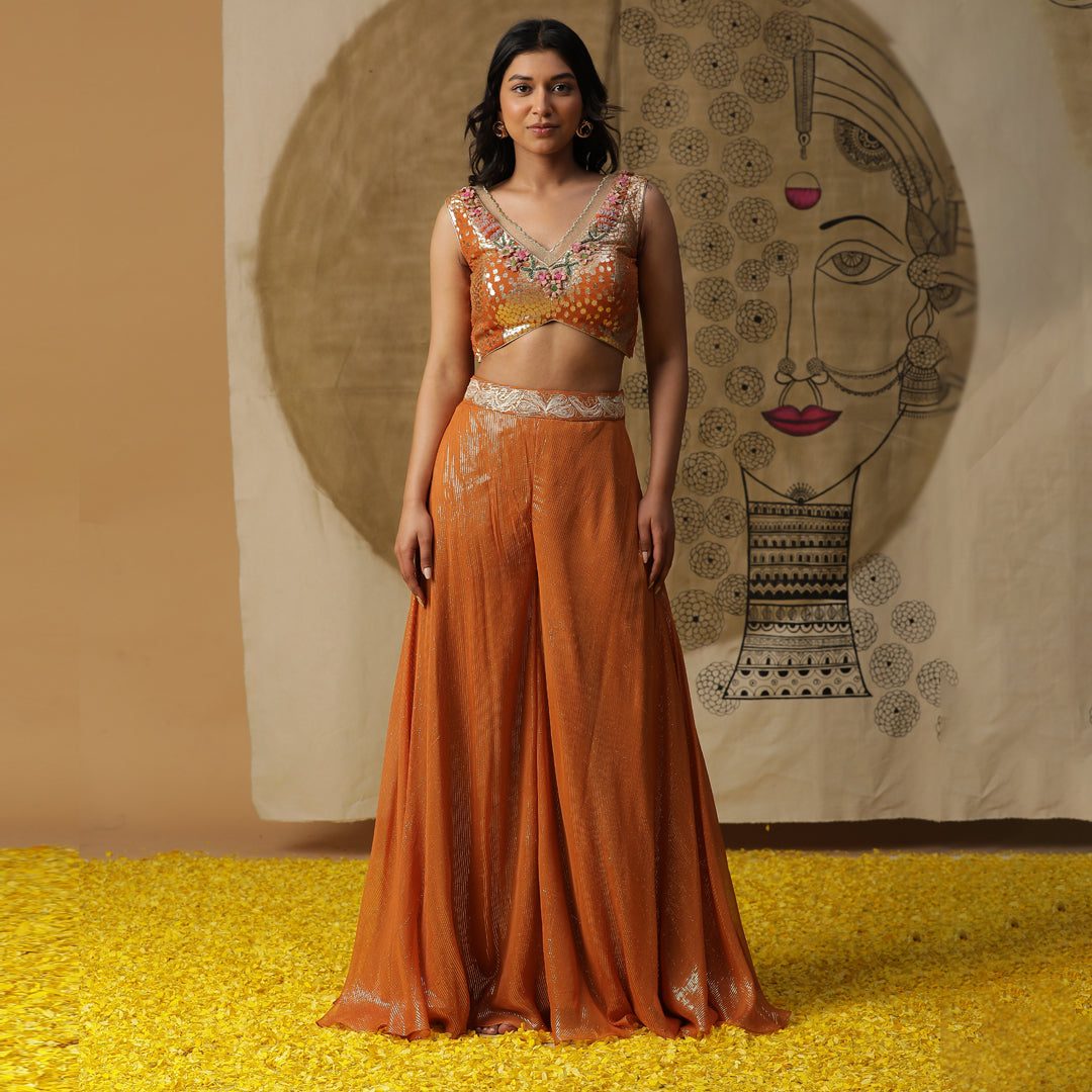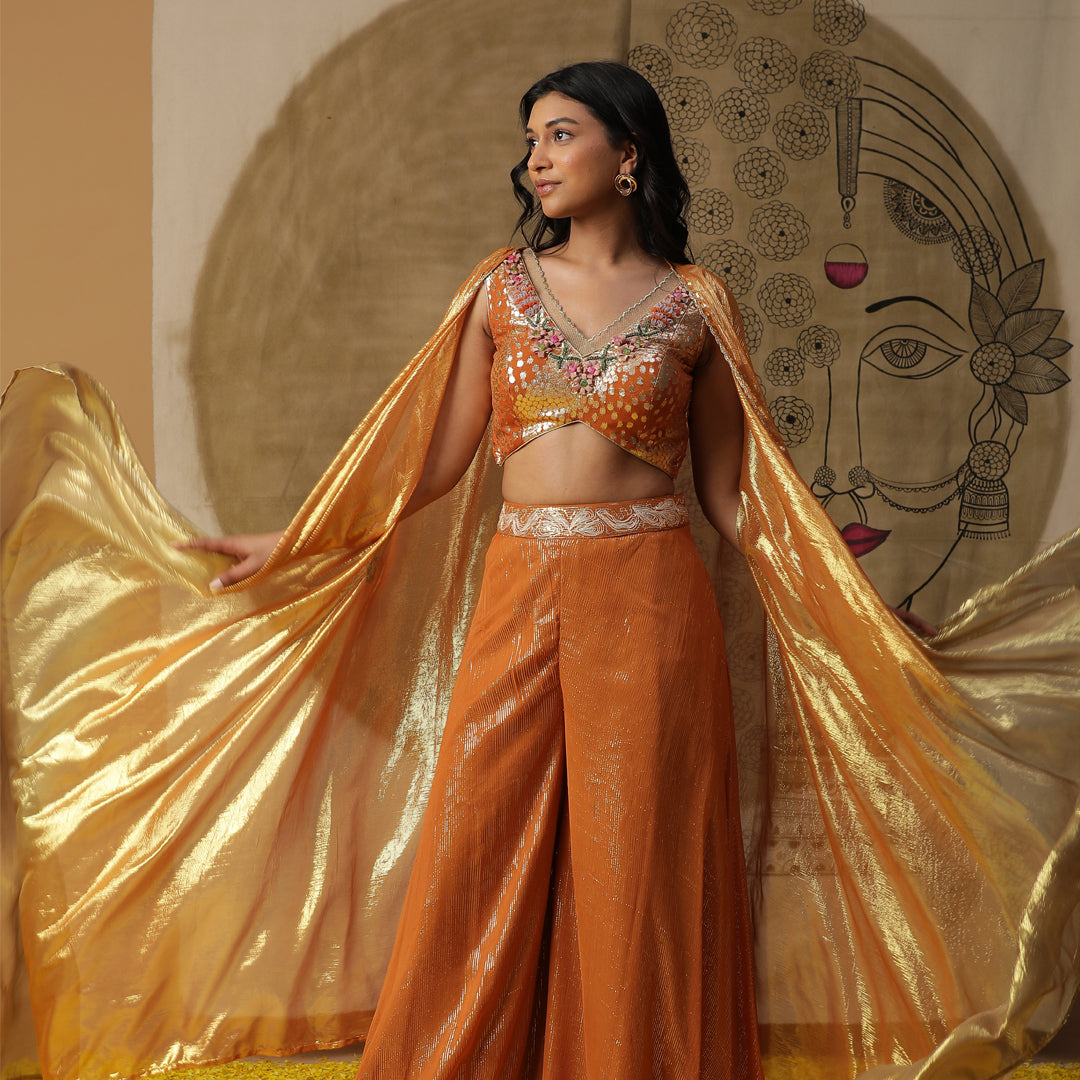 Description: Orange blouse in sequin with palazzo pants and cape set.The sharara set in the image is a stunning outfit! 😍 It's a three-piece ensemble consisting of a crop top and sharara pants.- The crop top is sleeveless with a V-neckline and is adorned with intricate silver embroidery or sequins, giving it is a festive look.The sharara pants are orange-colored with a flowy, flared design and have silver detailing or embroidery accents, matching the top's theme. The outfit looks perfect for a festive occasion or a fashion-forward event!