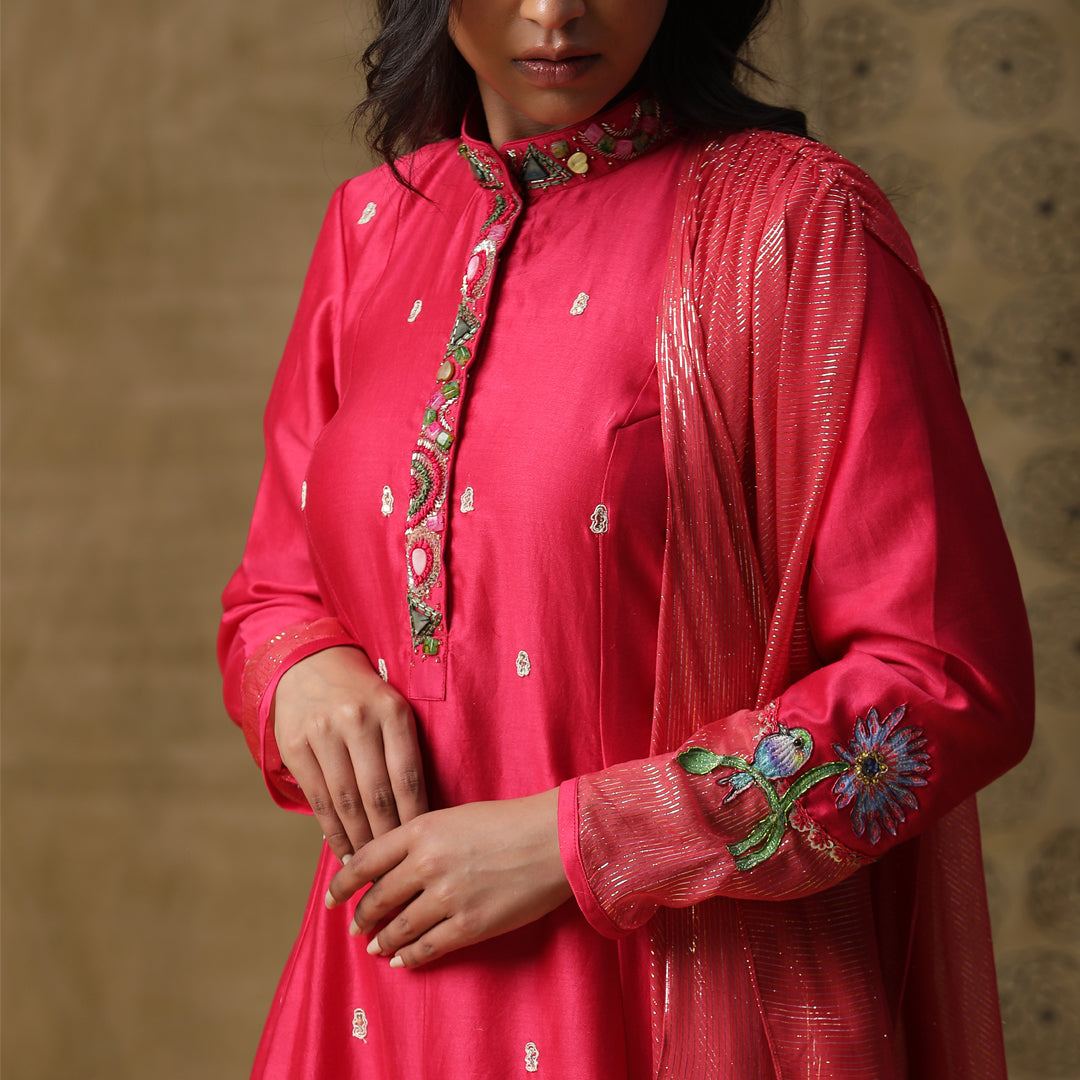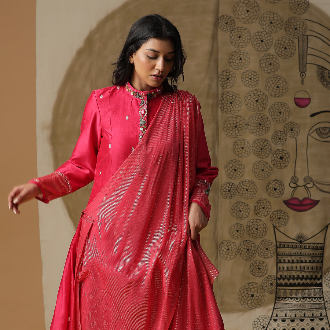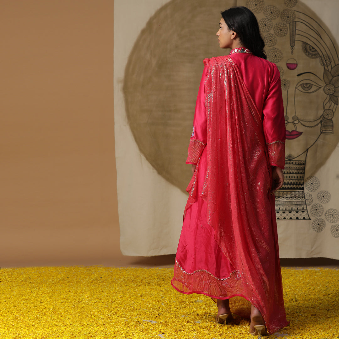 Description: The image shows a woman wearing a pink dress, with a drawing of a woman's face and neck visible behind her. The dress is long-sleeved and has a high neckline, featuring intricate embroidery along the front and around the cuffs. The dress is made of a lightweight material, possibly cotton or silk, and has a flowing design that drapes elegantly around the woman's body.Dusty Red cowl drape dress with handpainted flowers on the cuffs. Comes with handwork on collar.