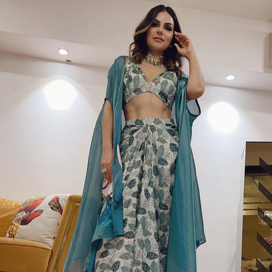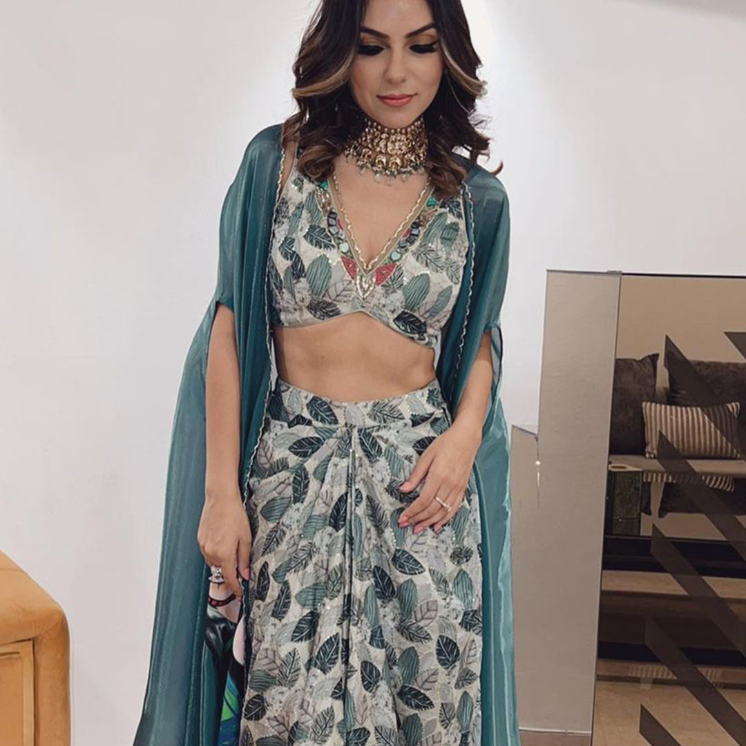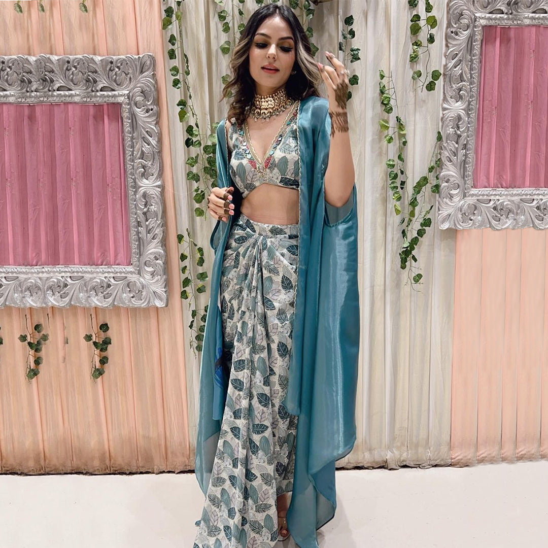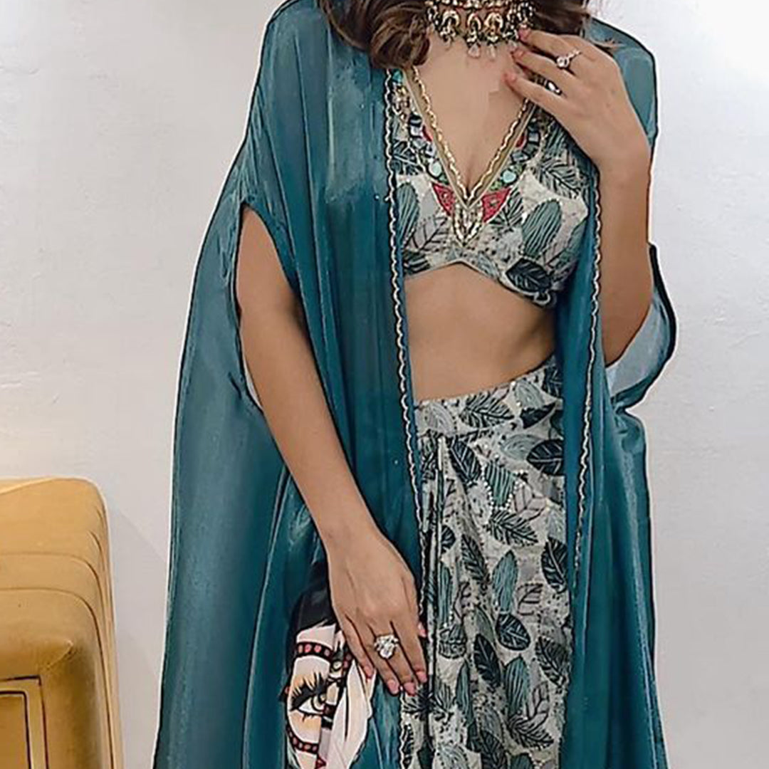 Description: Printed indo set in turquoise blue. Comes with a sequin embroidered blouse and wrap skirt with handpainted cape in organza.The plazoo set in the image is a stunning teal and white ensemble.The overall look is complemented by jewelry like a deep v necklace and henna designs on the hands.The outfit looks like it's for a festive or traditional occasion, maybe a wedding or a function like Navratri or Diwali.