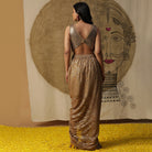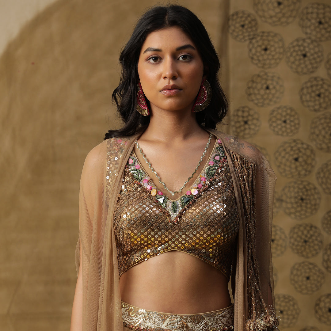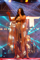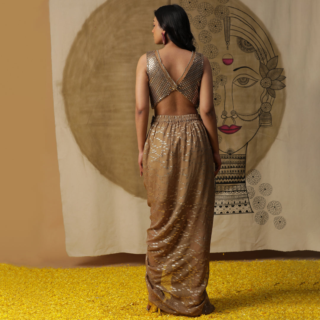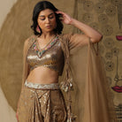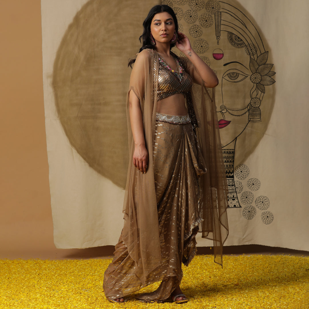 Description: The dhoti set in the image is a fusion of traditional and contemporary styles. Dhoti set in golden with a sequined blouse and net cape.The outfit is in shades of gold and bronze, giving it a metallic sheen.It consists of a dhoti-style skirt with a metallic gold fabric and silver accents. The top is a metallic bronze bralette or crop top with sequins or coins-like details.A sheer gold cape or shawl is draped over the shoulders, adding a dramatic touch.The overall look is stylish and glamorous, blending elements of Indian fashion with a modern twist.
