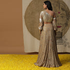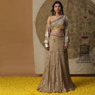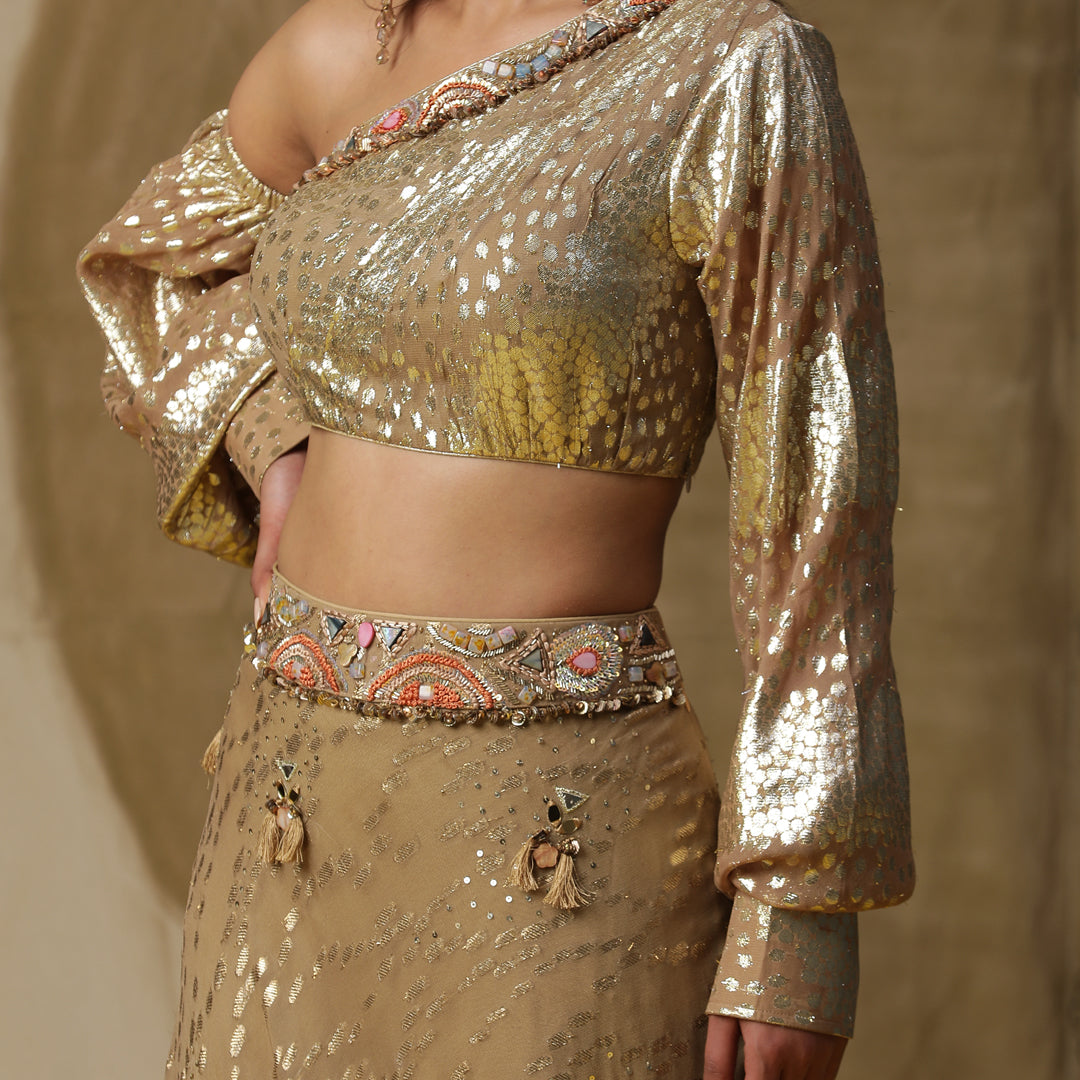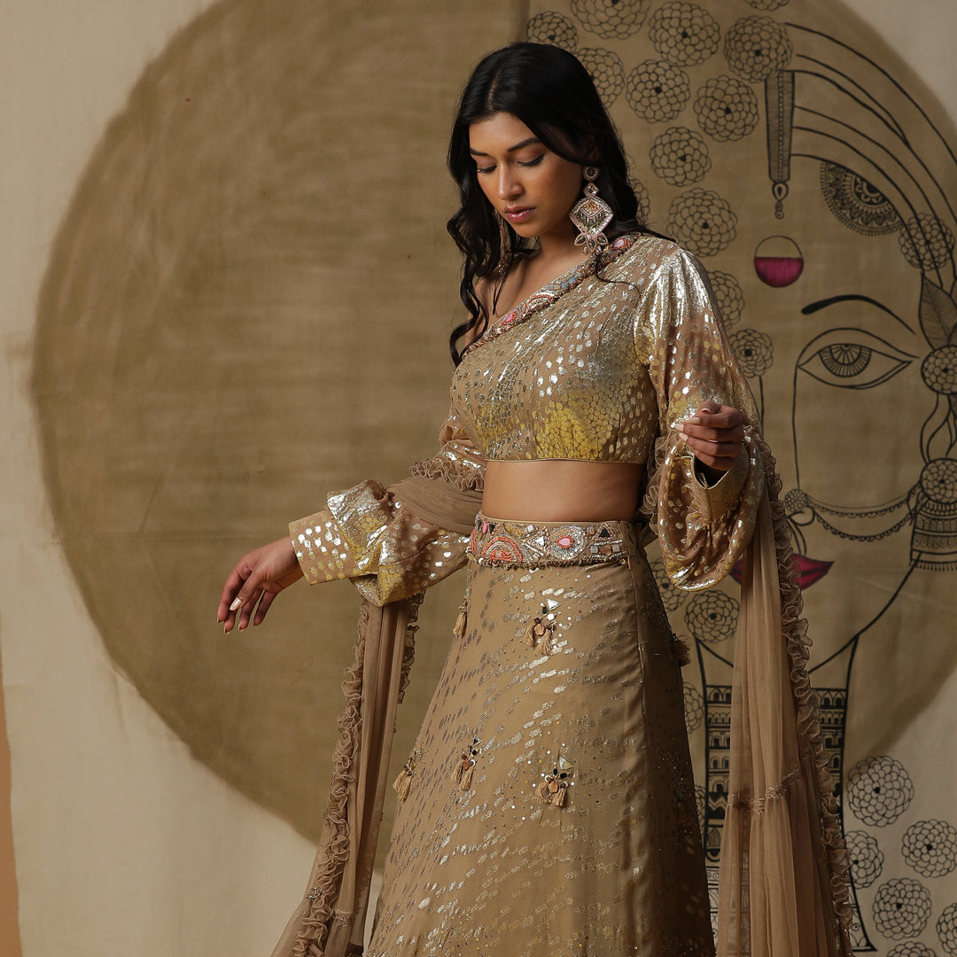 Description: OMG, that lehenga is stunning 😍! The golden lehenga has a beautiful flowy lehenga with intricate patterns and designs in silver/gold. It's paired with a matching teal blue blouse that's got some bling with silver/gold detailing. Golden one shoulder blouse with skirt and ruffled net dupatta. There's also a dupatta draped over one shoulder, adding an extra touch of elegance. The whole outfit looks super festive and perfect for a special occasion like a wedding or Diwali function.