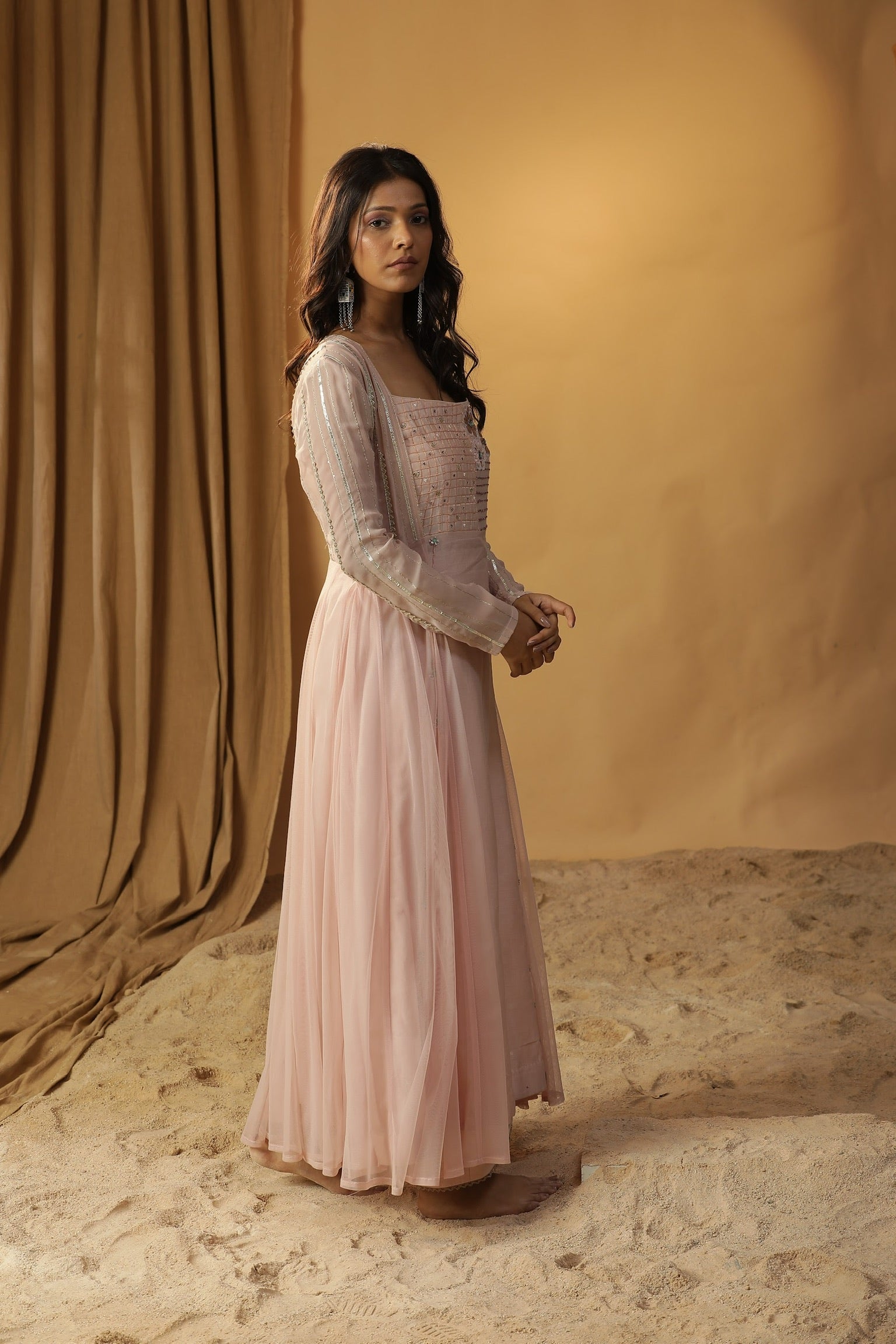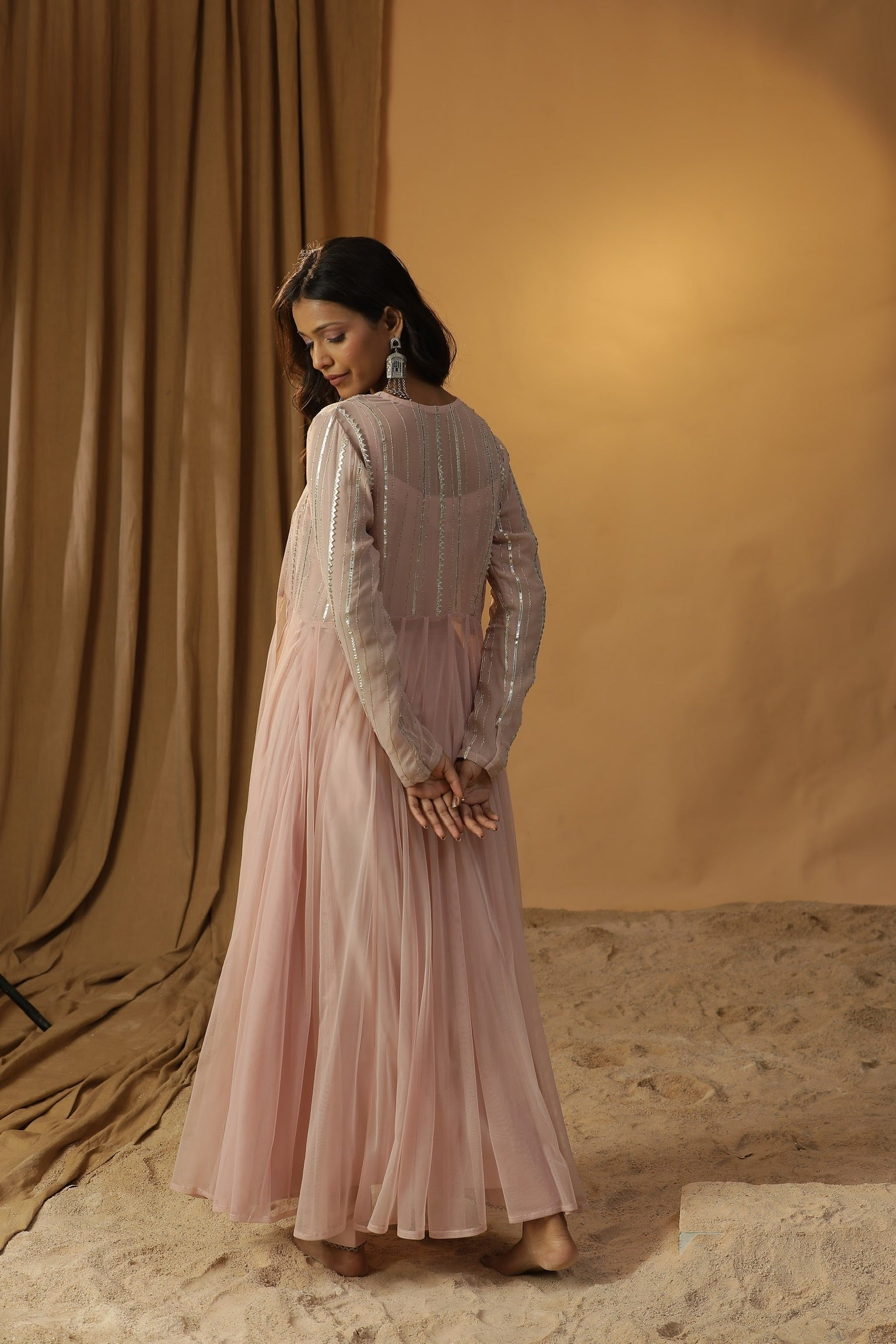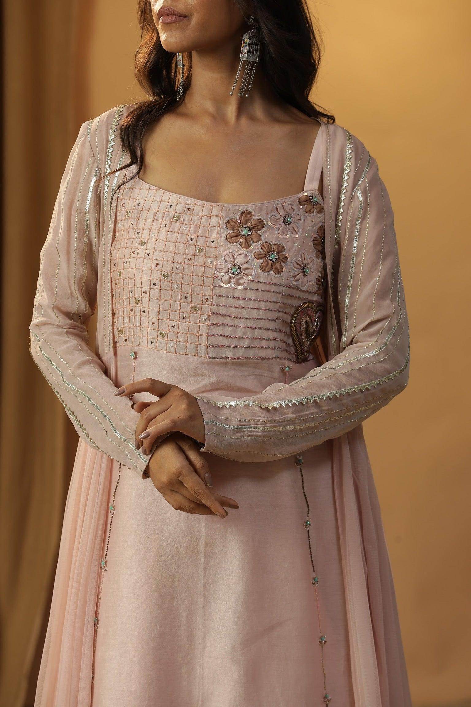 Description: The kurta set is a stylish and sophisticated outfit, suitable for formal occasions such as weddings or festivals. The use of powder pink as the color gives the outfit and elegant look, while the embroidery or embellishments add a touch of luxury and sophistication.our pink jacket dress with embroidery all over the yolk. Comes with a net jacket and a chanderi tunic.