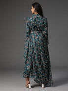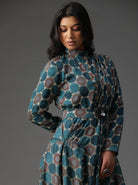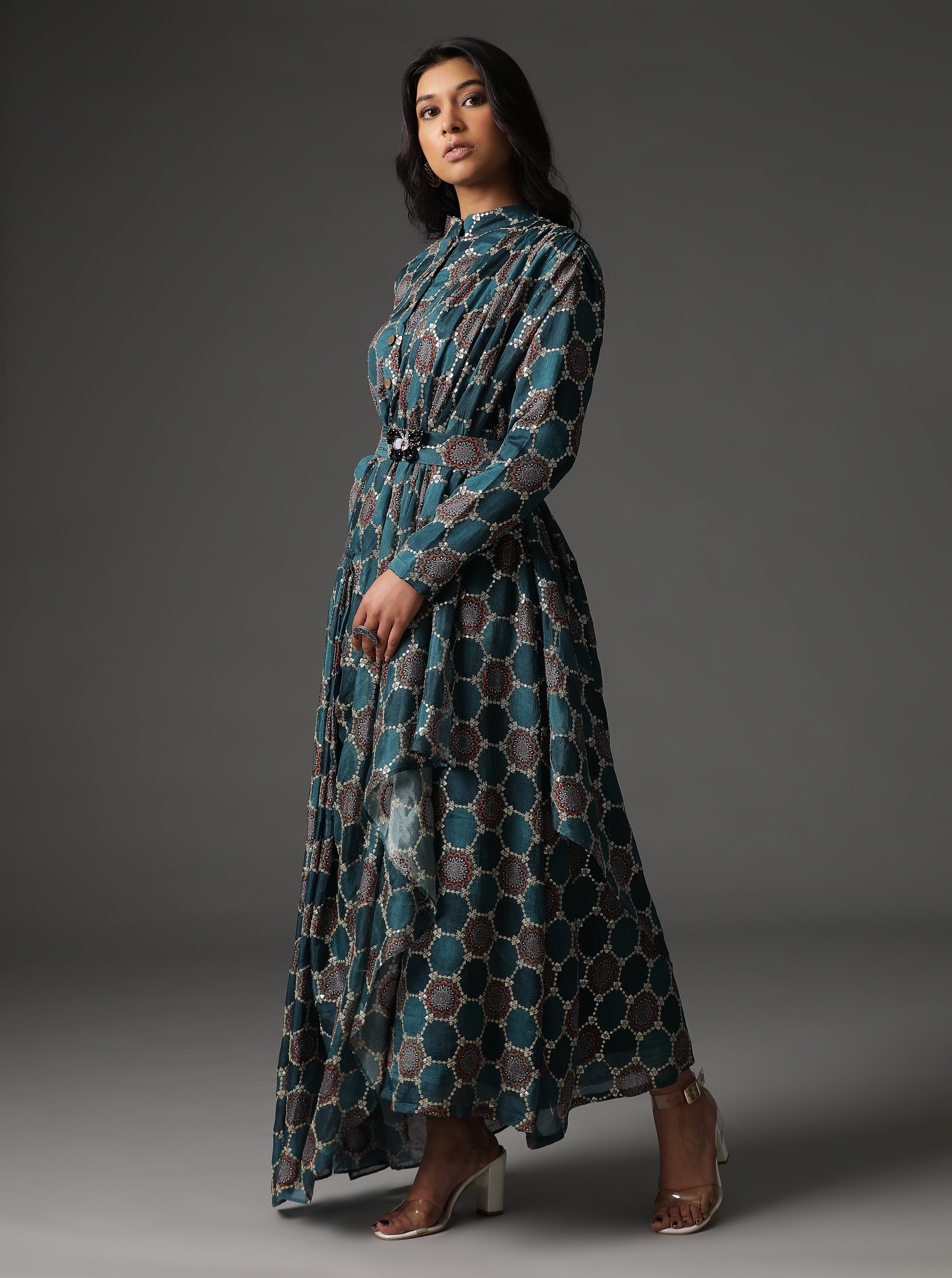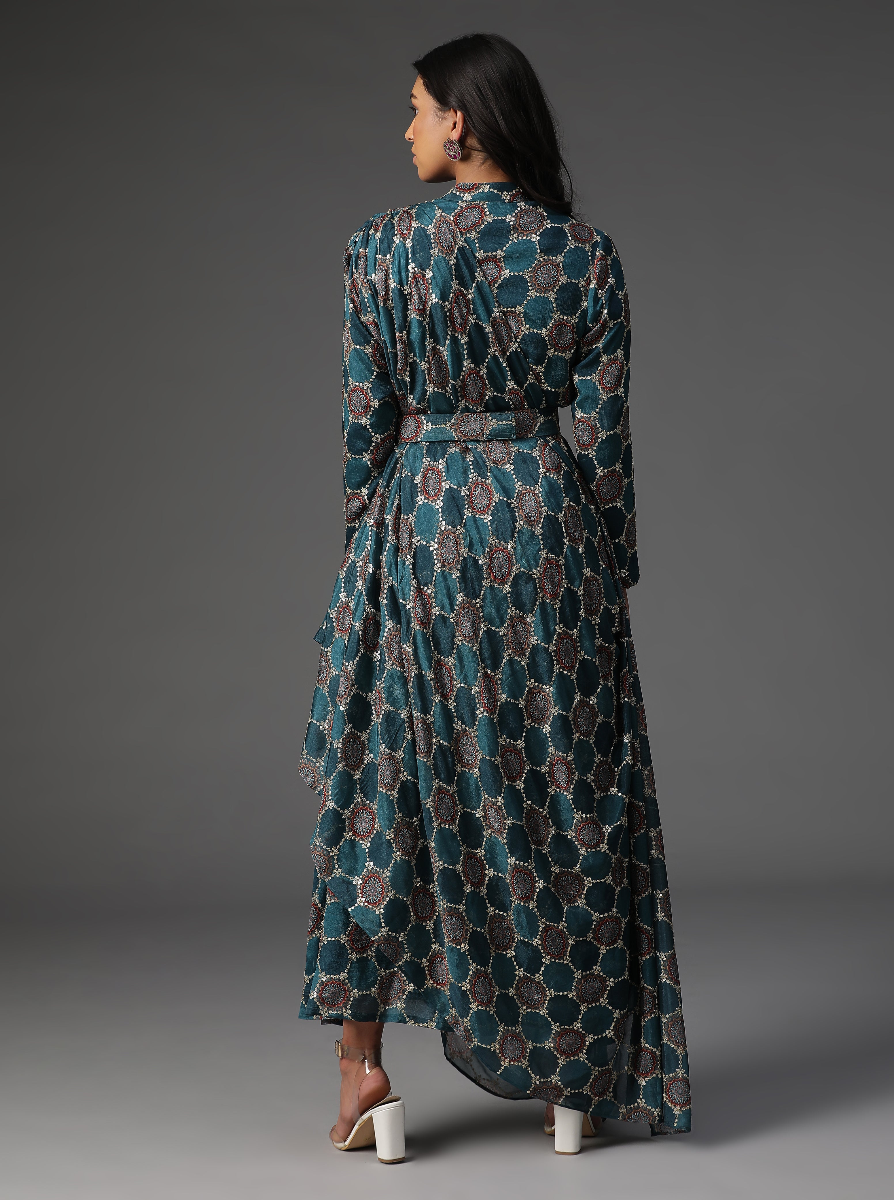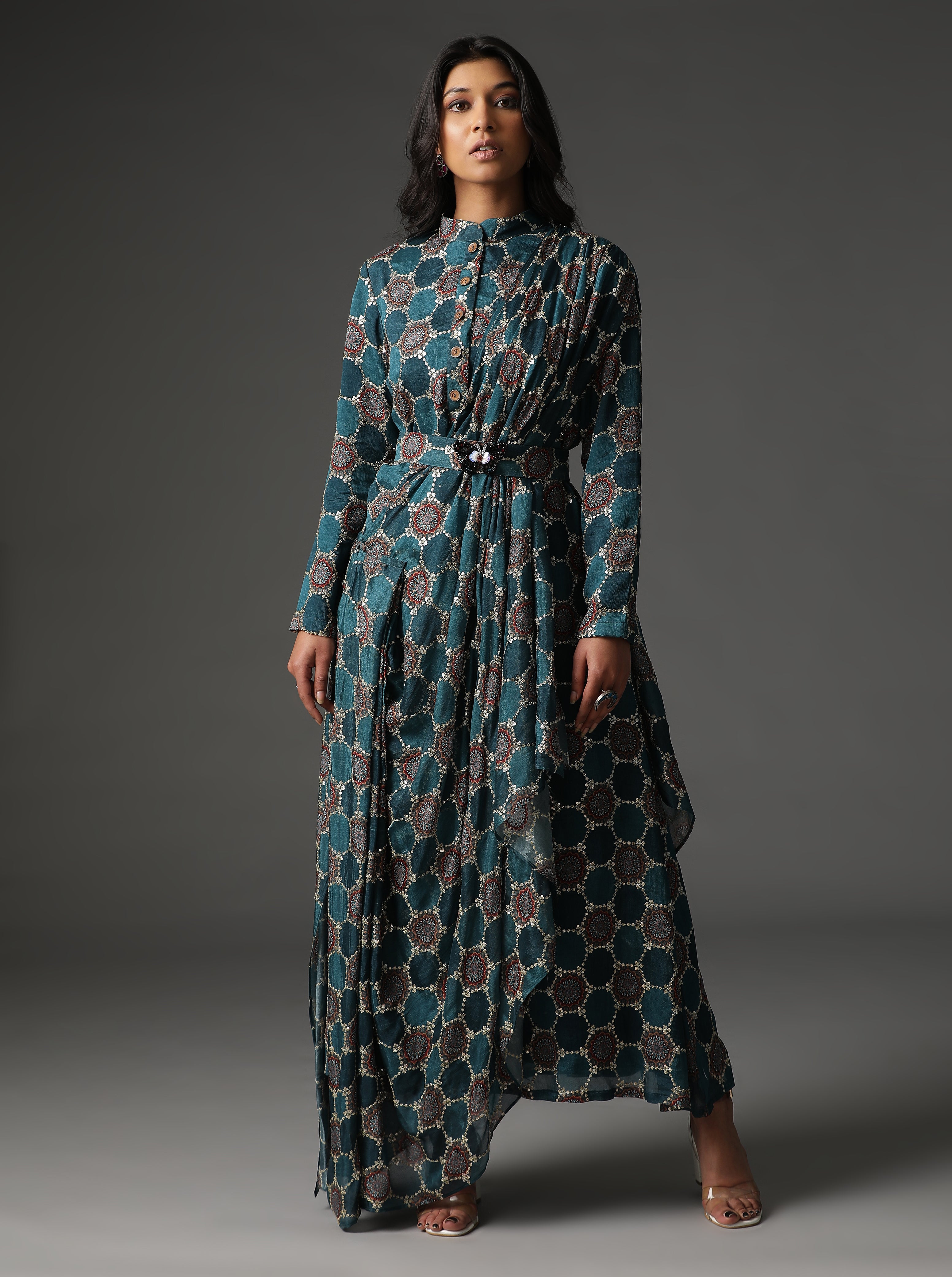 Description: Teal blue cowl drape in crepe material. Comes with a signature butterfly belt.that dress 🔥! The printed cowl dress is a stunning piece. It's a long dress with a high neck and long sleeves, featuring a bold red and grey pattern with a honeycomb-like design. The dress has a cinched waist with a belt that adds some definition. The cowl detail is super obvious in the photo but the dress looks like it'll flow nicely.