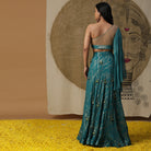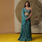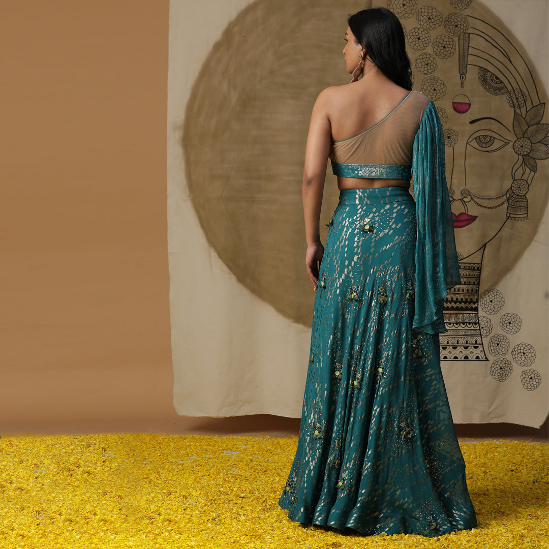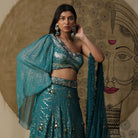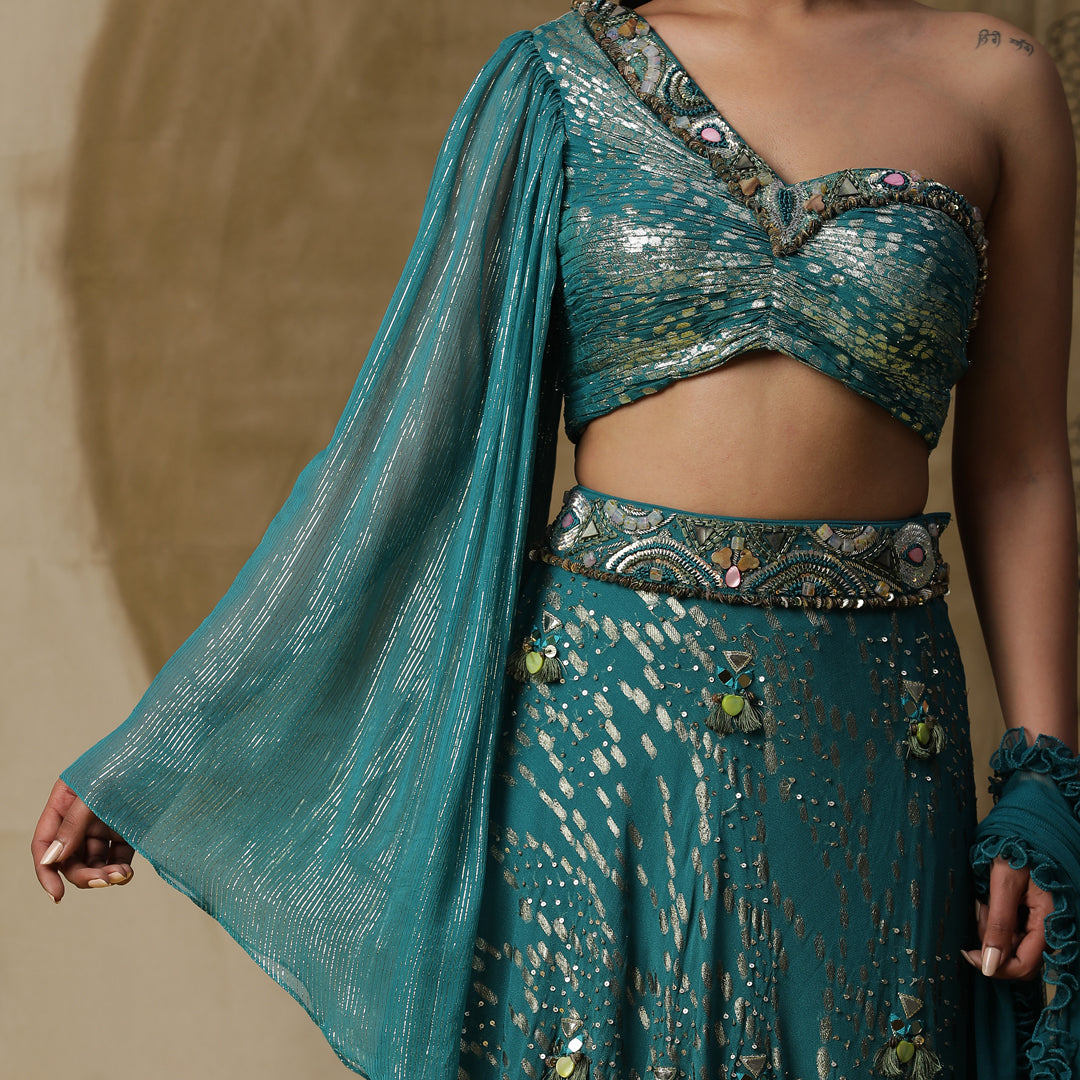 Description: OMG, that lehenga is stunning 😍! The teal blue lehenga has a beautiful flowy lehenga with intricate patterns and designs in silver/gold. It's paired with a matching teal blue blouse that's got some bling with silver/gold detailing. Teal blue one shoulder blouse with skirt and ruffled net dupatta. There's also a dupatta draped over one shoulder, adding an extra touch of elegance. The whole outfit looks super festive and perfect for a special occasion like a wedding or Diwali function.