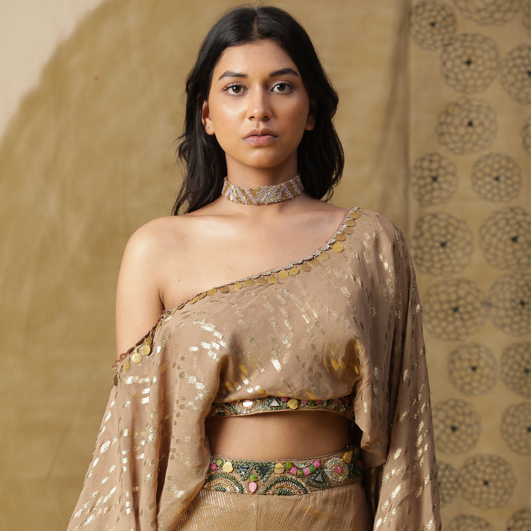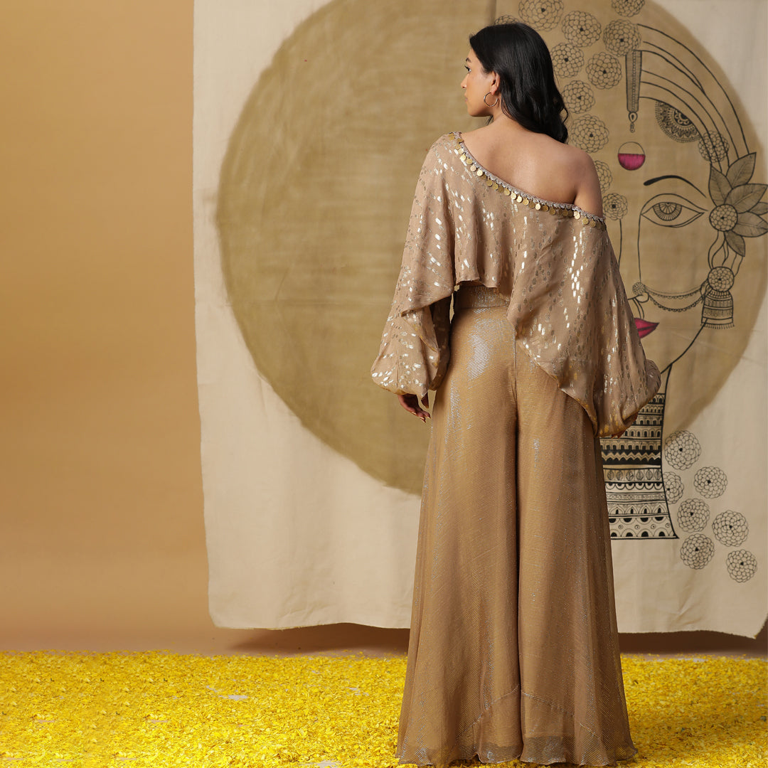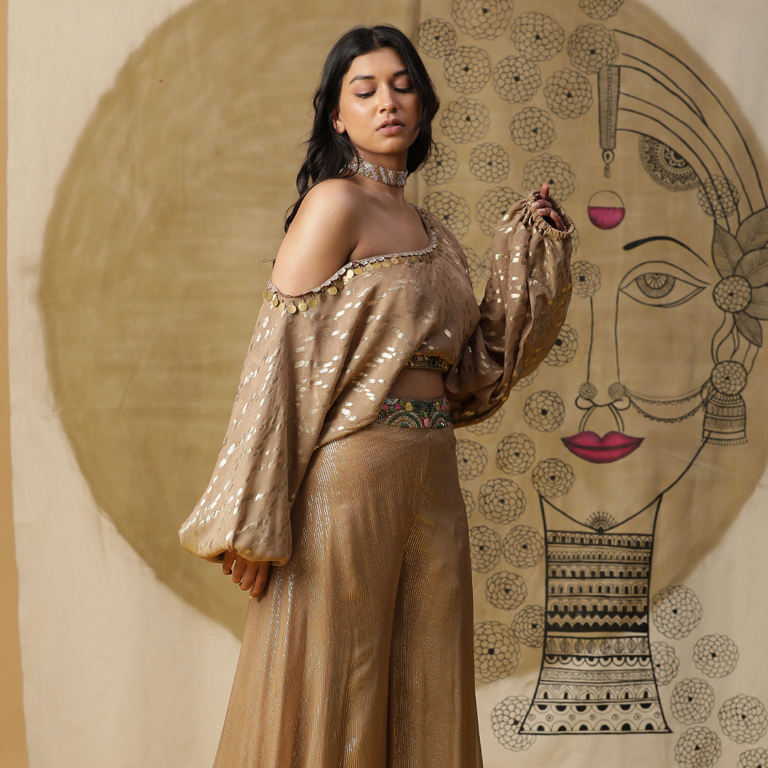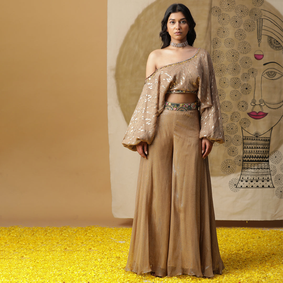 Description: OMG, that lehenga is stunning 😍! Golden colored one shoulder blouse with hand embroidery,comes with a palazzo.The golden palazoo set has a beautiful with intricate patterns and designs in silver/gold. It's paired with a matching golden blouse that's got some bling with silver/gold detailing. Golden blouse with palazoo pants. The whole outfit looks super festive and perfect for a special occasion like a wedding or Diwali function.