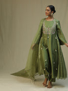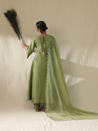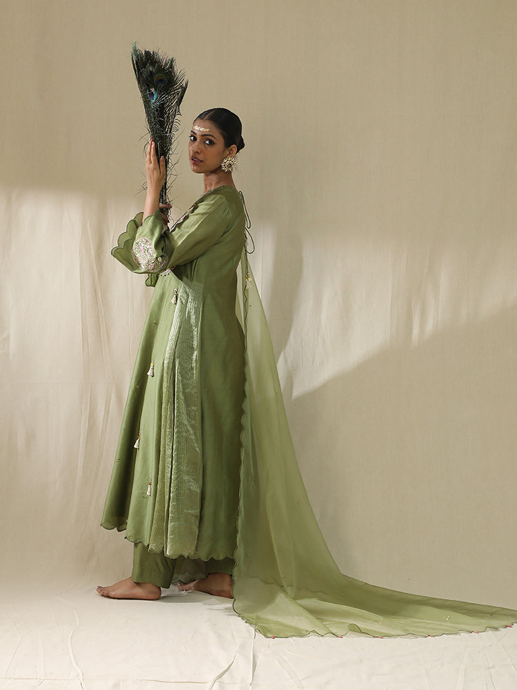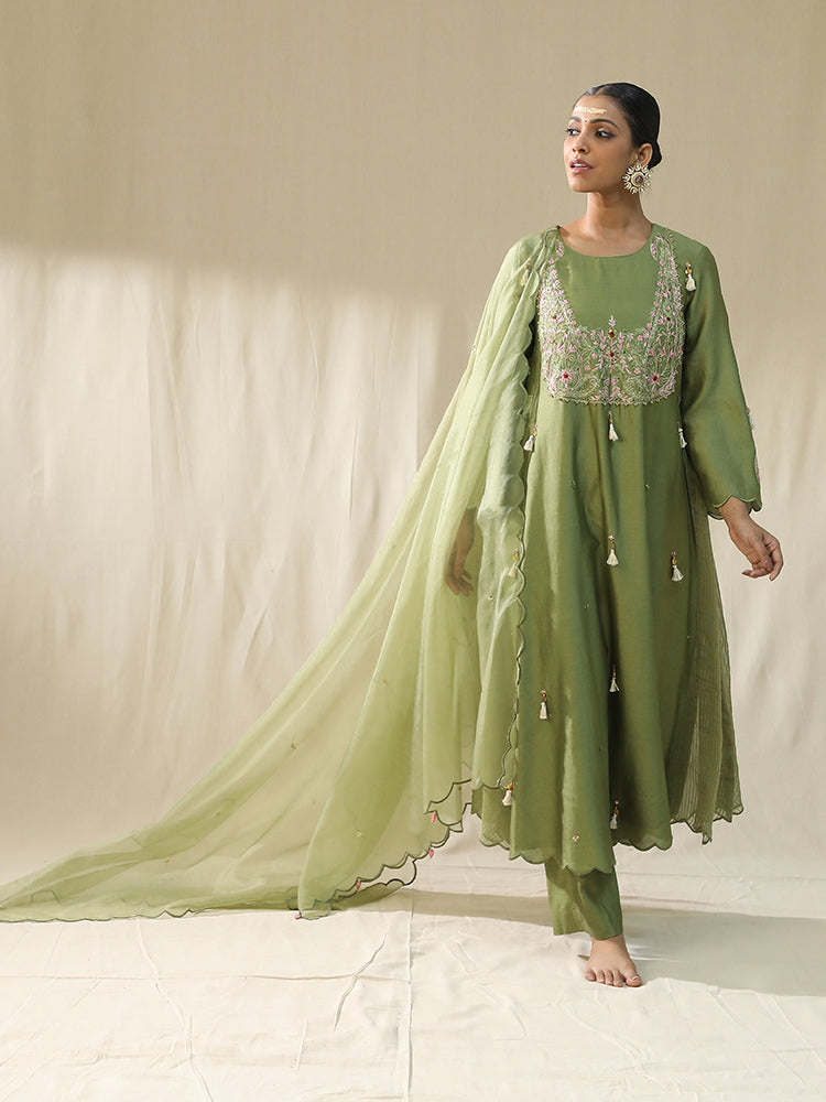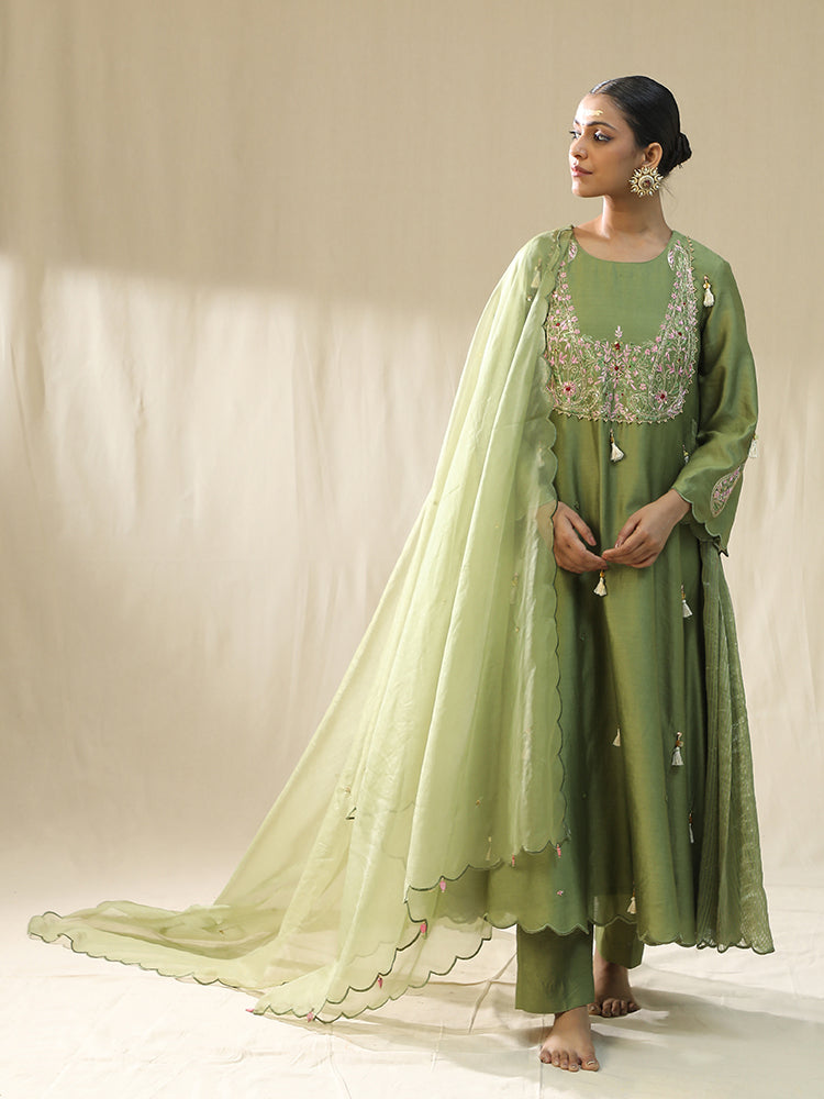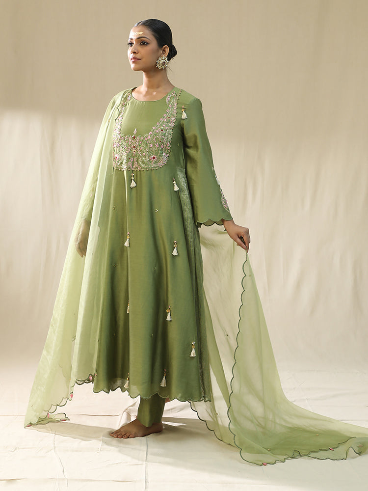 Description: Pista Green A line Chanderi silk kurta set. Comes with scalloped organza dupatta and scalloped bell sleeves.The wok is embroidered with thread work. The image depicts a woman wearing a light green embroidered suit, it is a traditional Indian or Pakistani outfit. The suit is adorned with intricate silver embroidery on the chest and sleeves, adding a touch of elegance to the overall design.