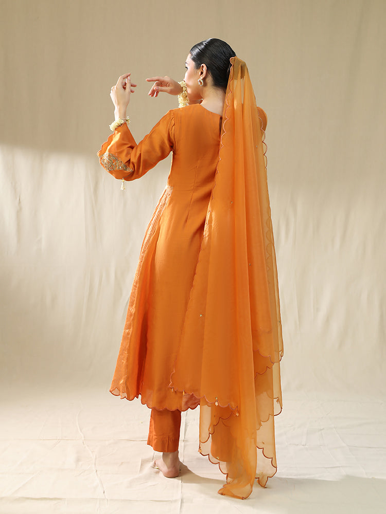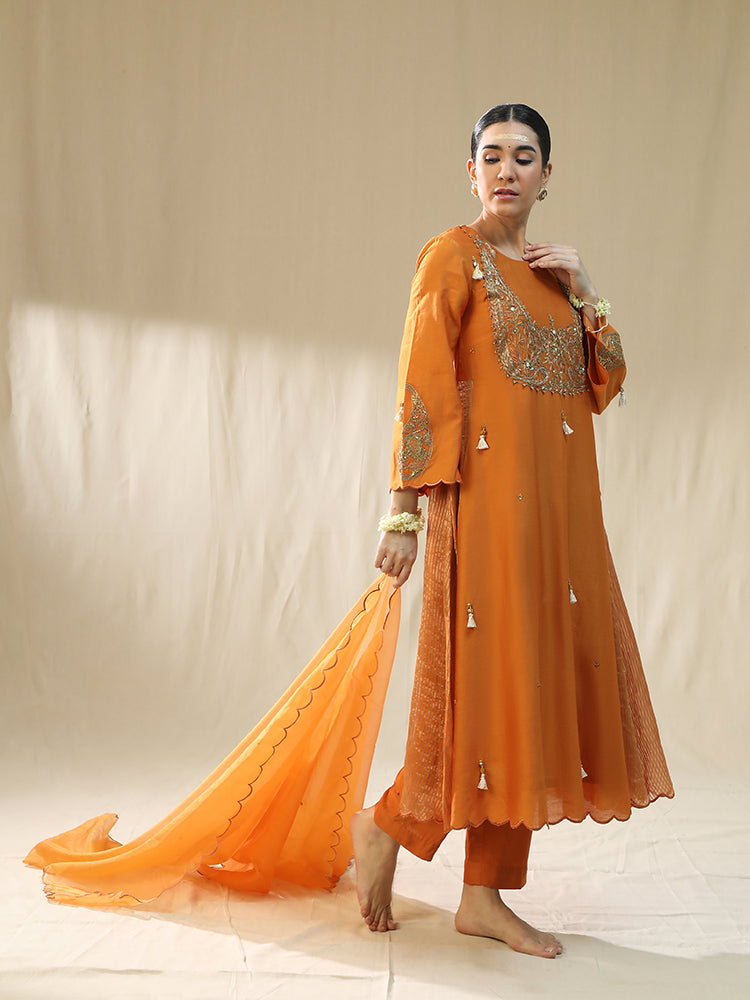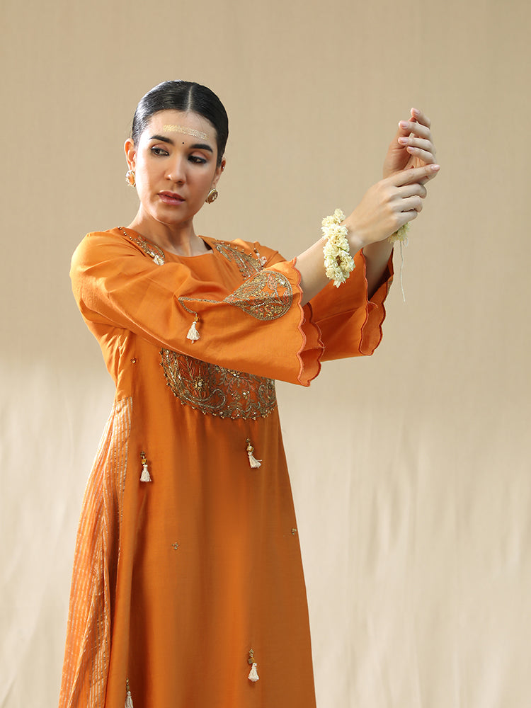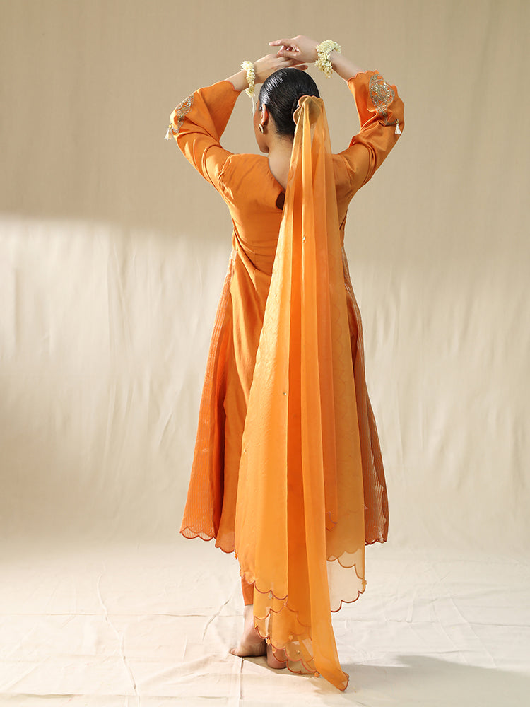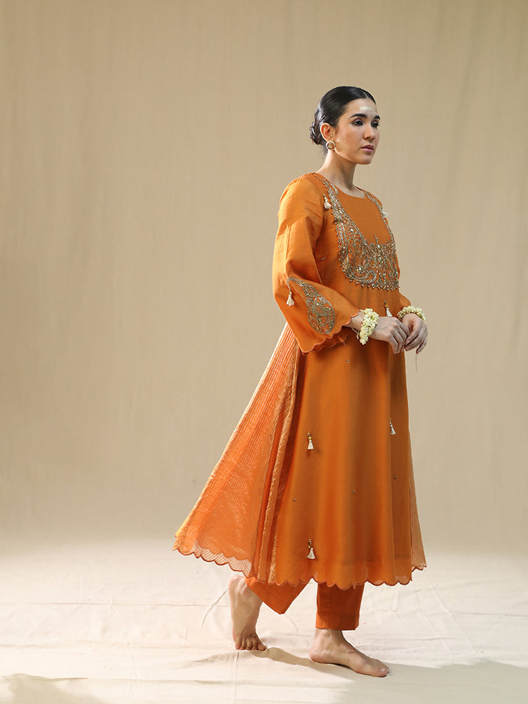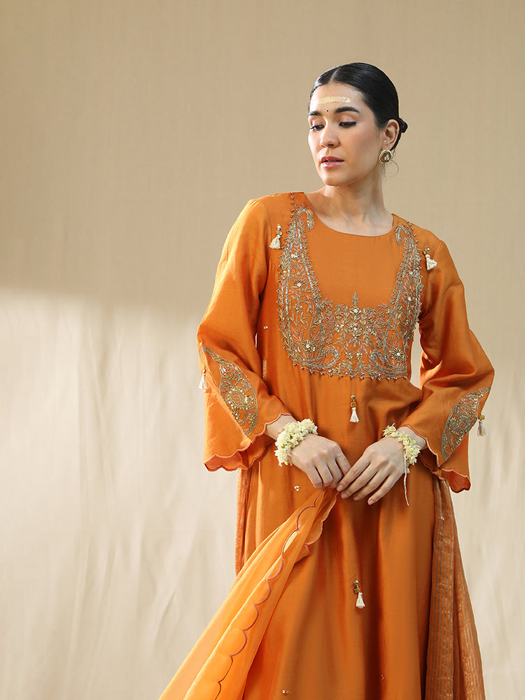 Description: Orange Ambi A Line Suit Set,Dori Zardozi Sitara Resham.The image shows a woman wearing an orange embroidered suit. The suit is a long tunic with matching pants, and it features intricate silver embroidery on the chest and sleeves.The embroidery is delicate and detailed, adding a touch of elegance to the overall look. Overall, the image presents a stylish and sophisticated outfit that would be suitable for occasions such as weddings or parties.