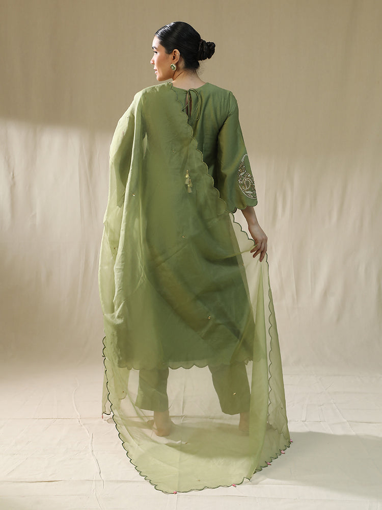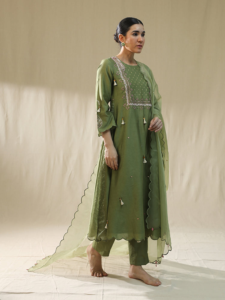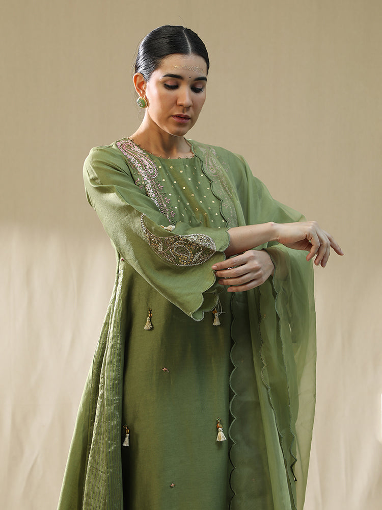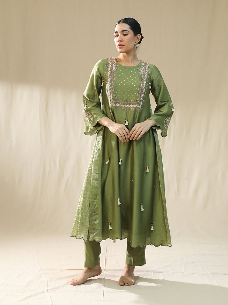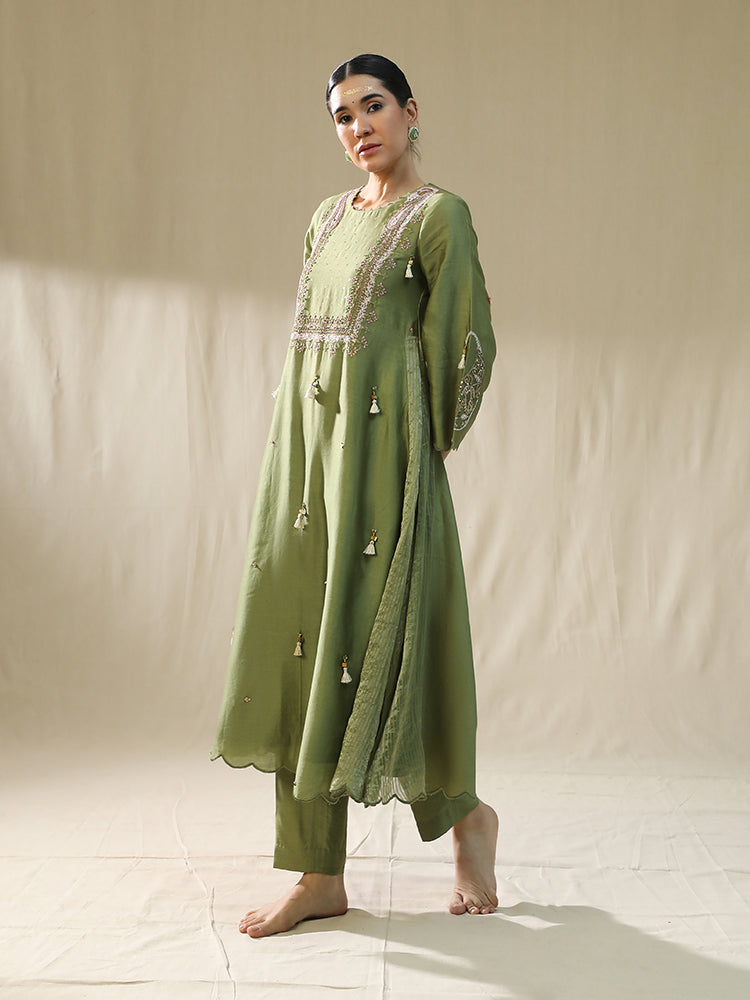 Description: Pista Green A Line Suit Set is Dori zardozi Sitara Resham,is a green suit with intricate embroidery. The suit is a, flowing garment that reaches down to her ankles, featuring a round neckline and three-quarter length sleeves. The suit is primarily green, with a lighter shade of green used for the embroidery on the chest and down the front.Overall, the image presents a beautiful and stylish dress that would be suitable for a variety of occasions, from formal events to everyday wear.