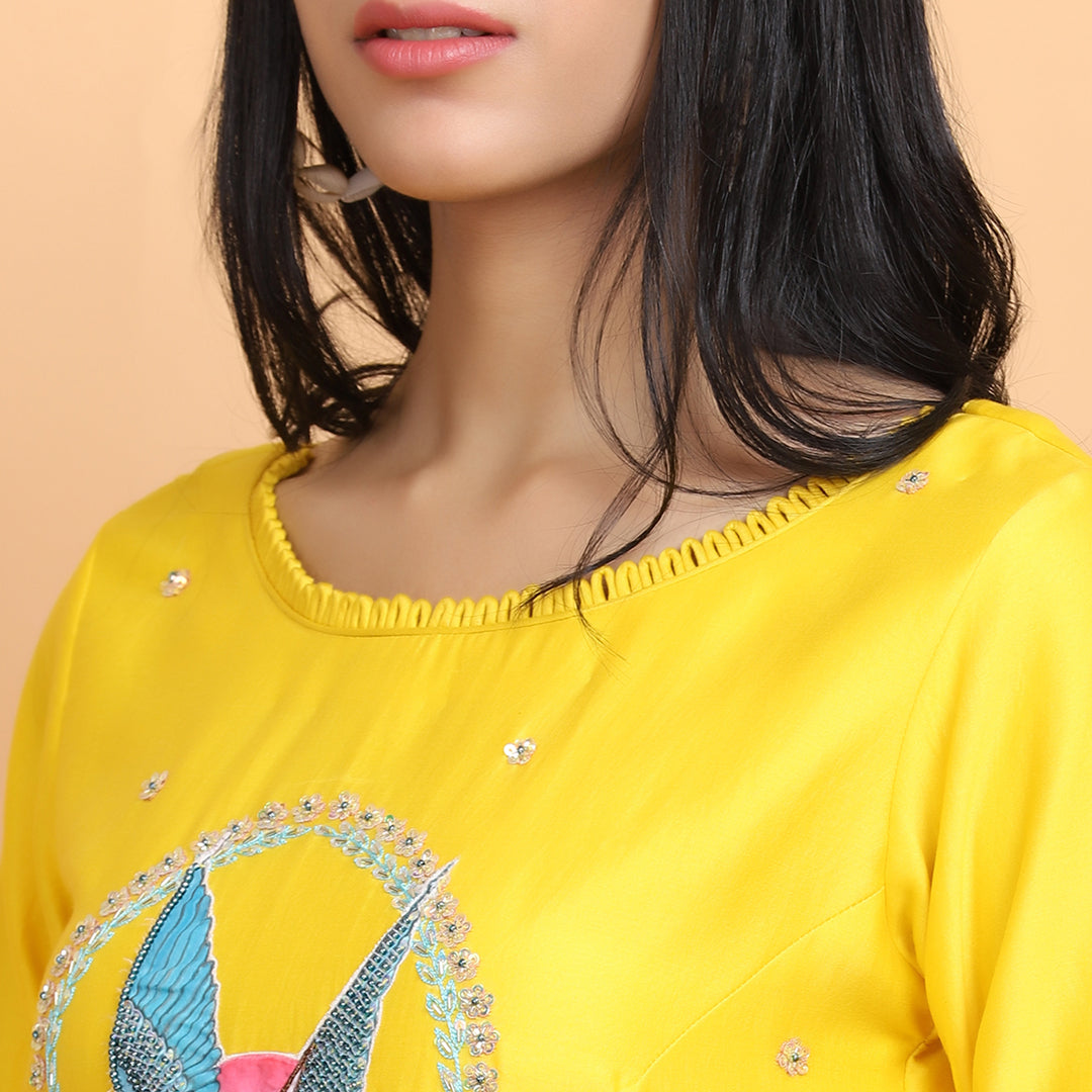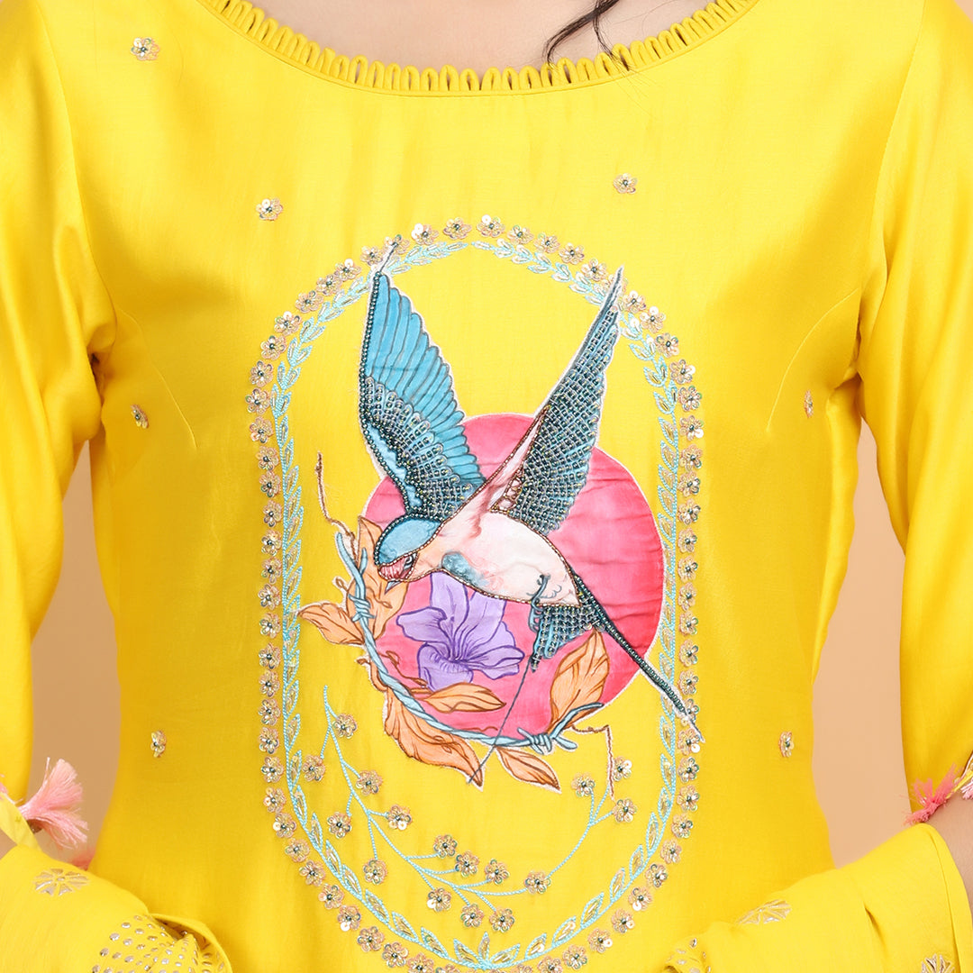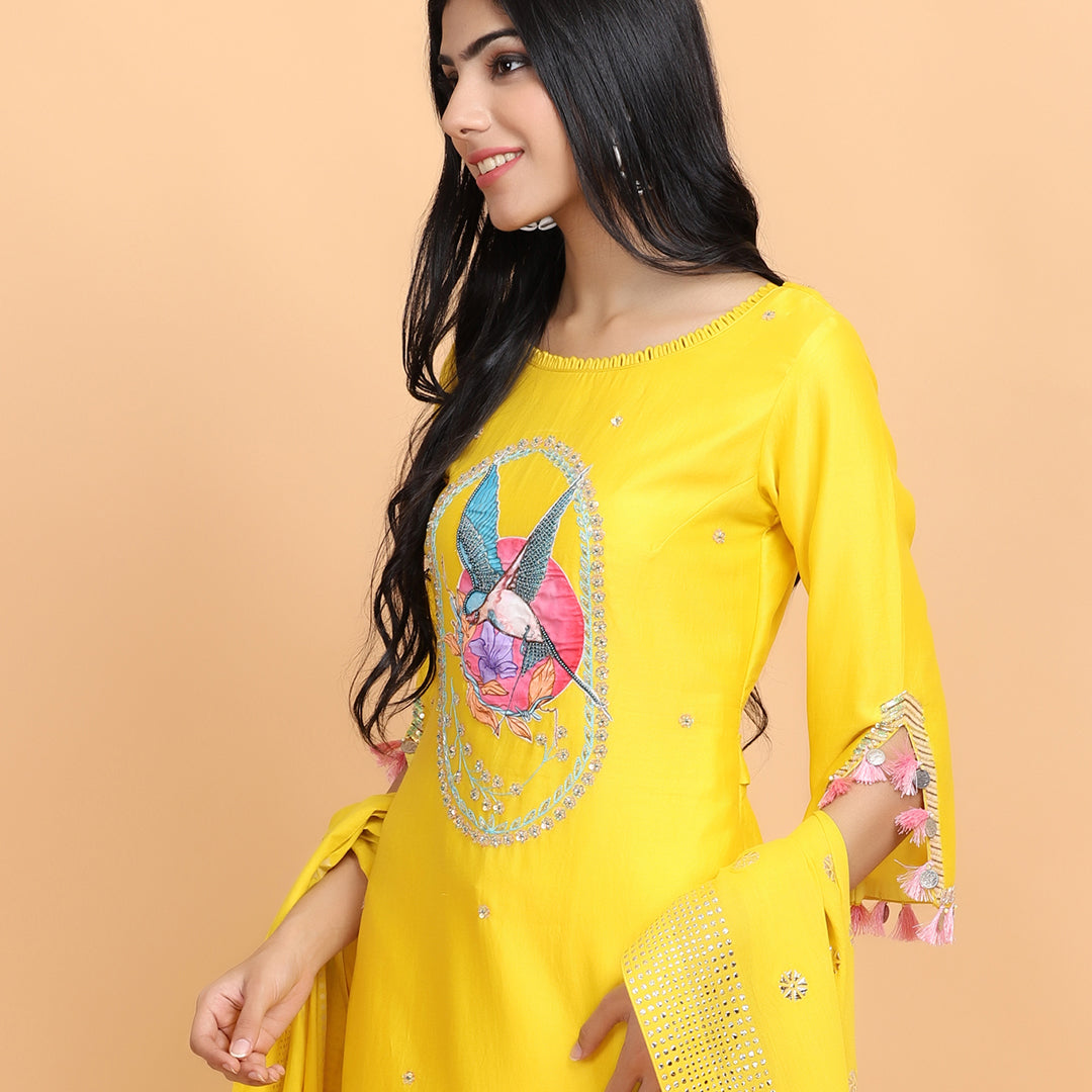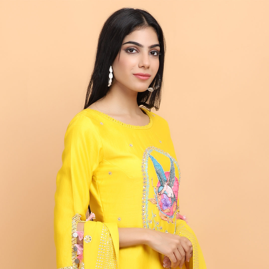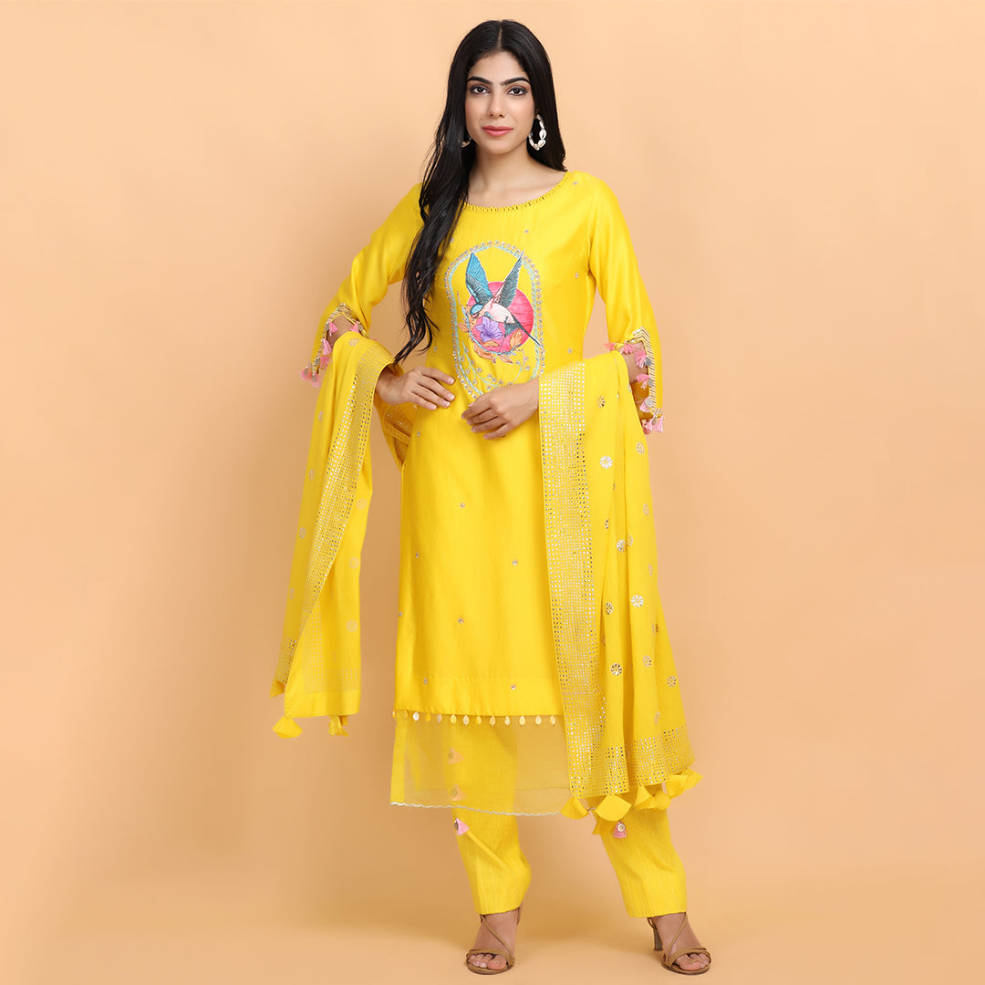 Description : The suit is a vibrant yellow Chanderi suit set with a parrot design. A parrot motif is prominently featured on the front of the kurti (top), with blue, pink, and white hues. The suit includes a kurti with long sleeves and matching pants.The overall look is ethnic yet contemporary, perfect for a festive or casual ethnic wear occasion.Yellow kurta in chanderi silk with an intricate parrot design on the front. Comes with cotton pants and a patra dupatta.