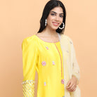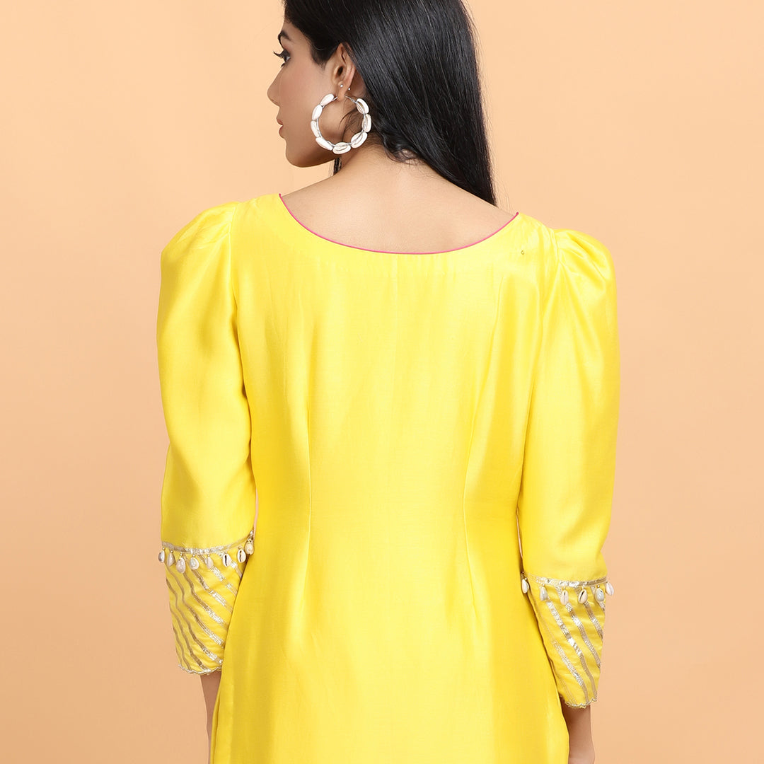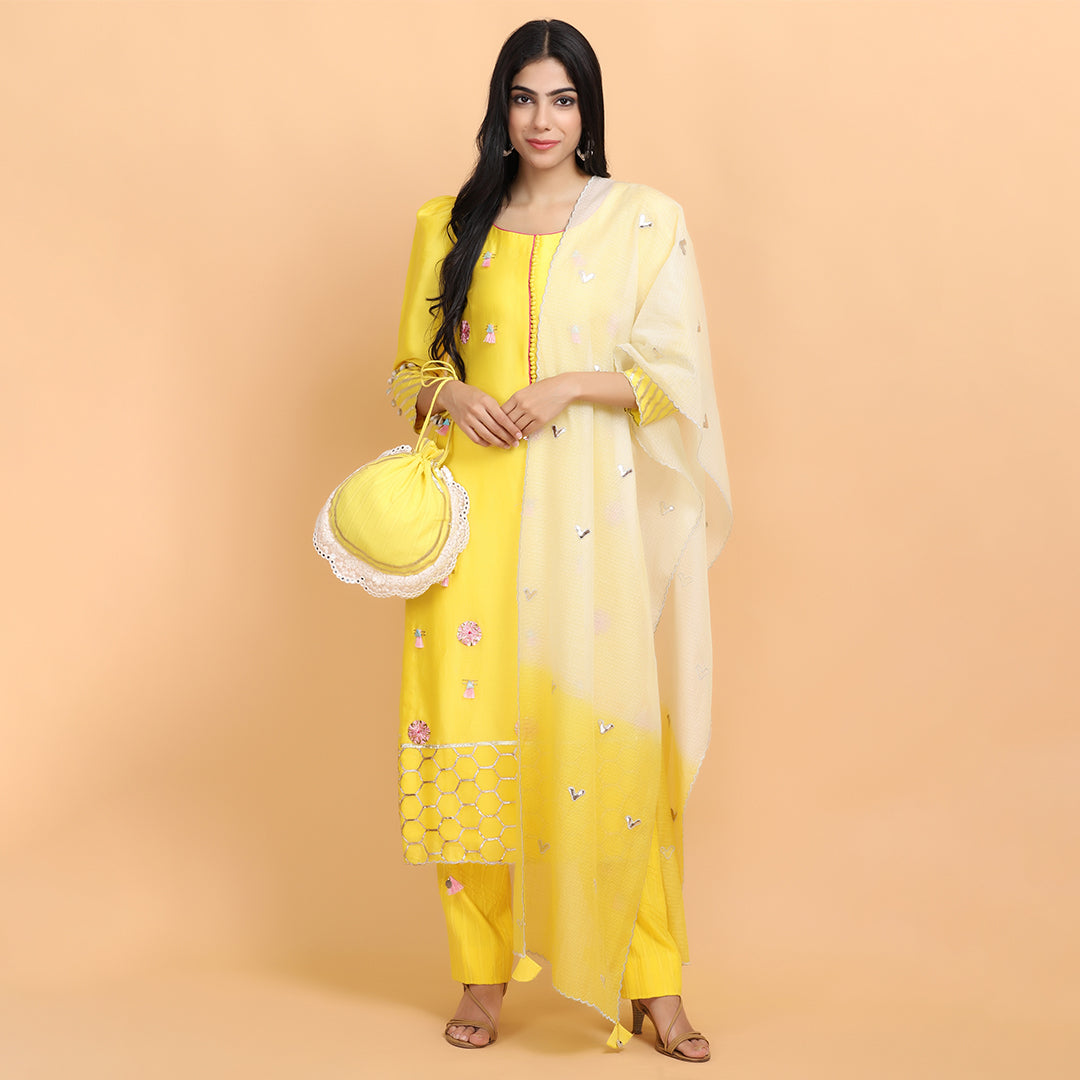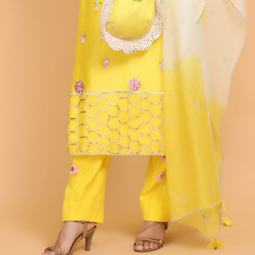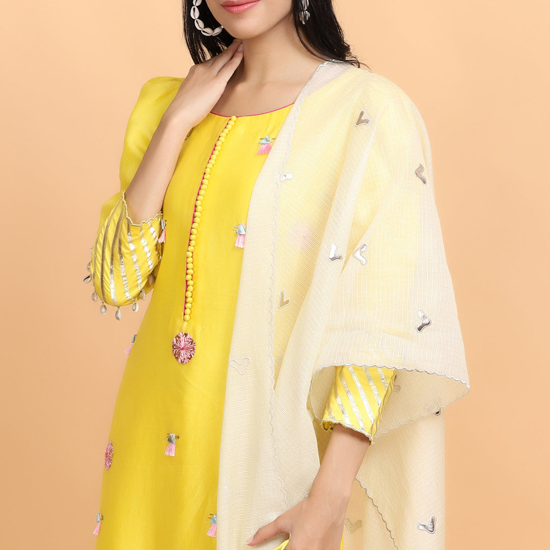 Yellow chanderi kurta with gota work. Comes with cotton pants and a kota dupatta.