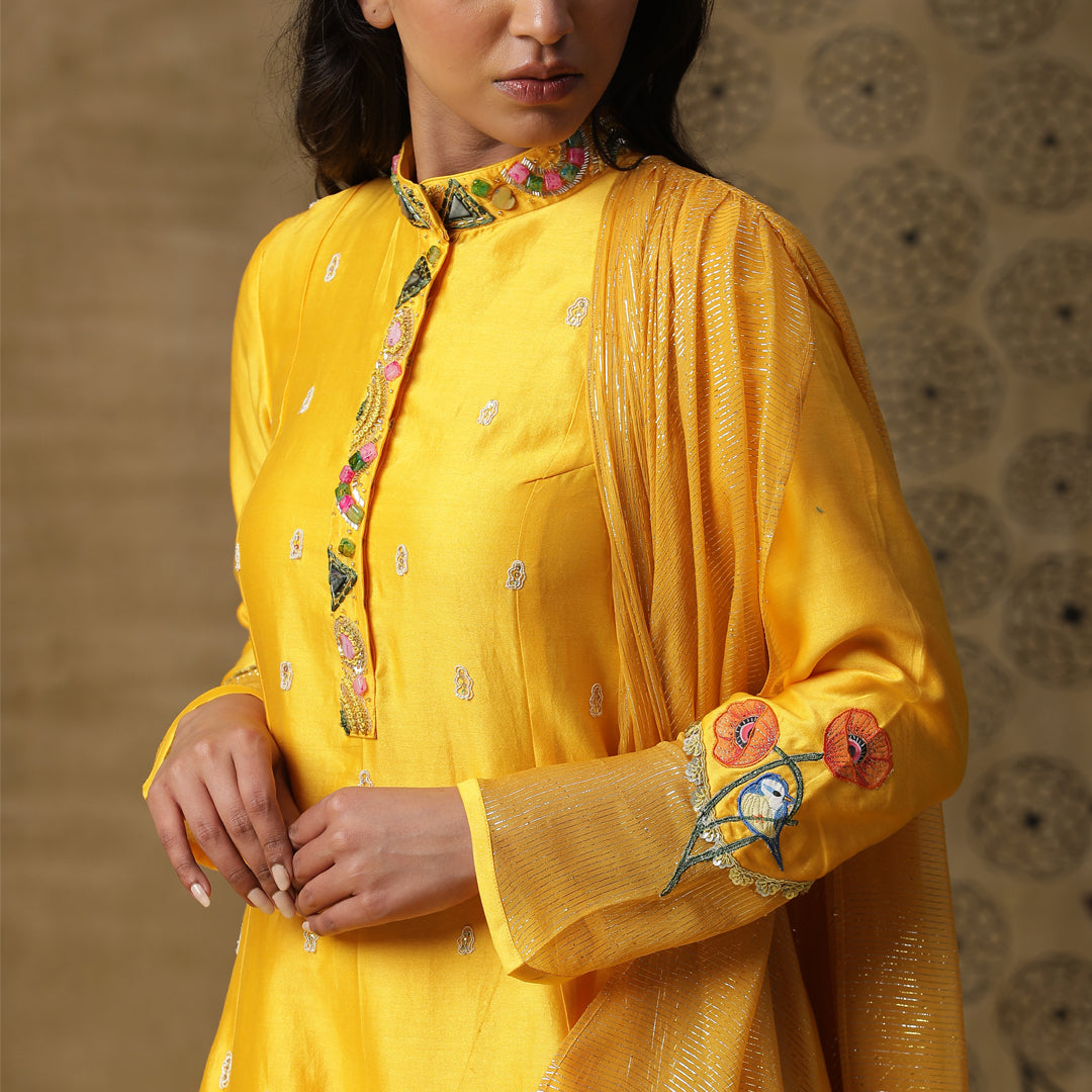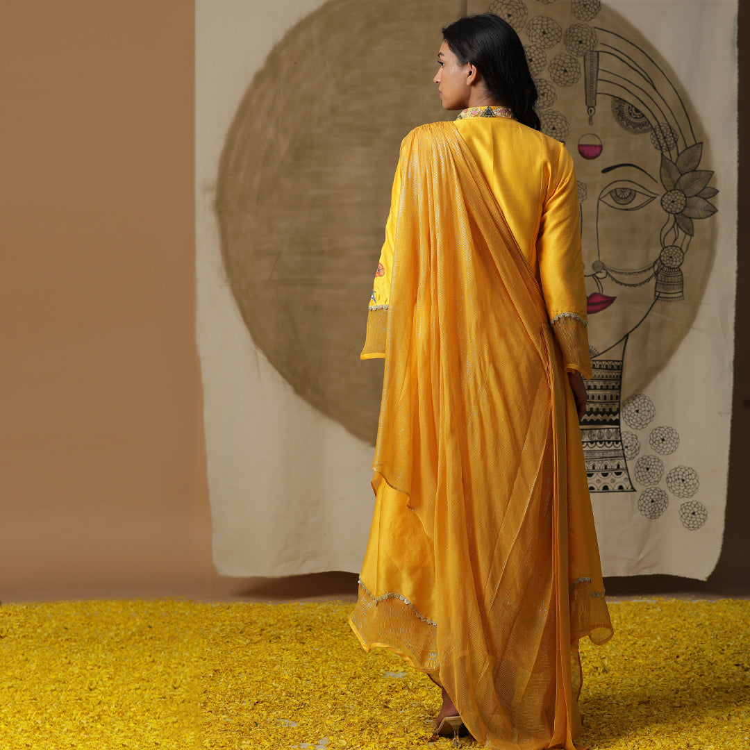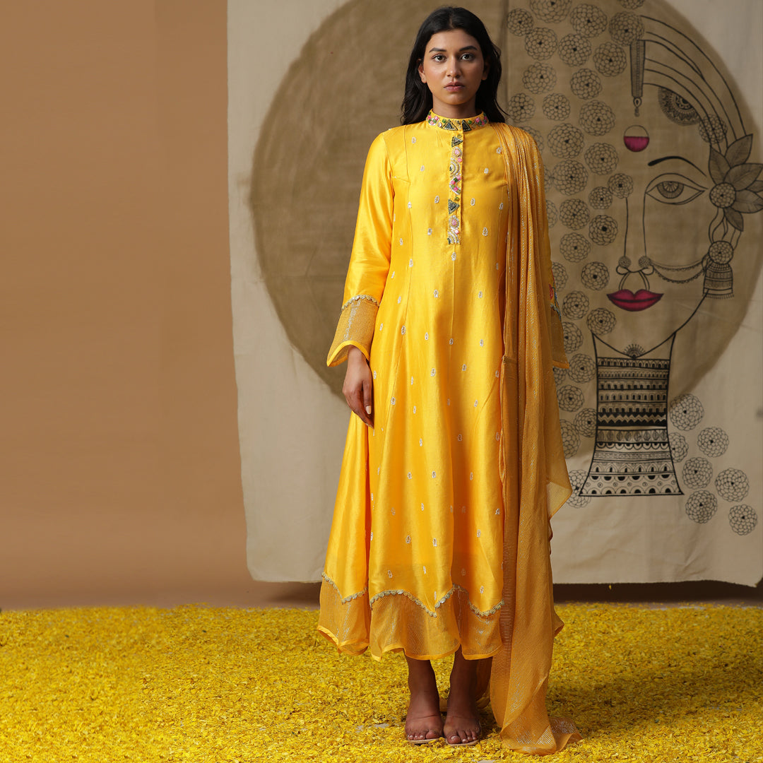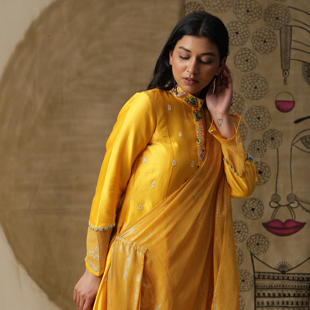 Description: Lemon Yellow cowl drape with handpainted flowers on the cuffs. Comes with handwork on collar.The suit in the image is a vibrant yellow outfit with, A long dress or anarkali-style top with white dots and lace trim details. A matching dupatta draped over the left shoulder. Floral embroidery on the neckline and placket. Long sleeves with lace trim at the cuffs.