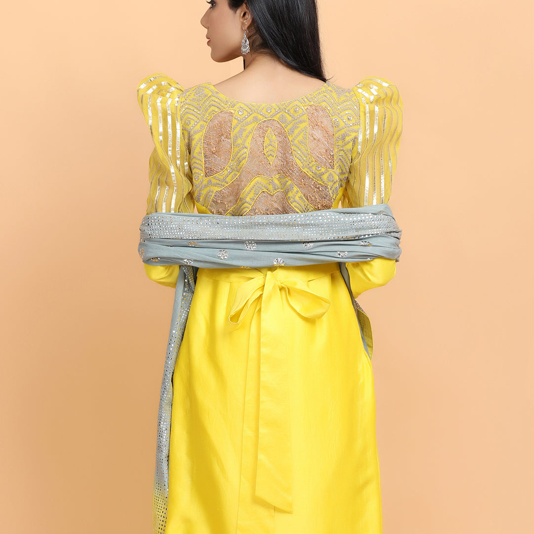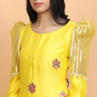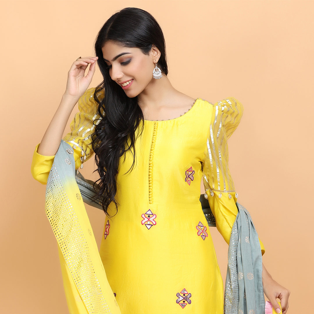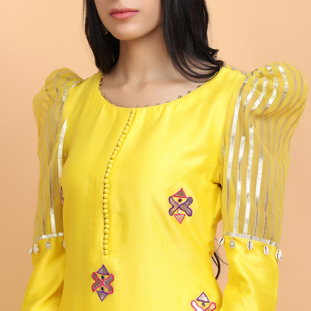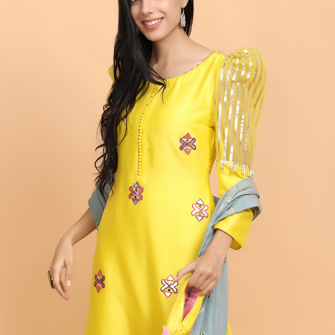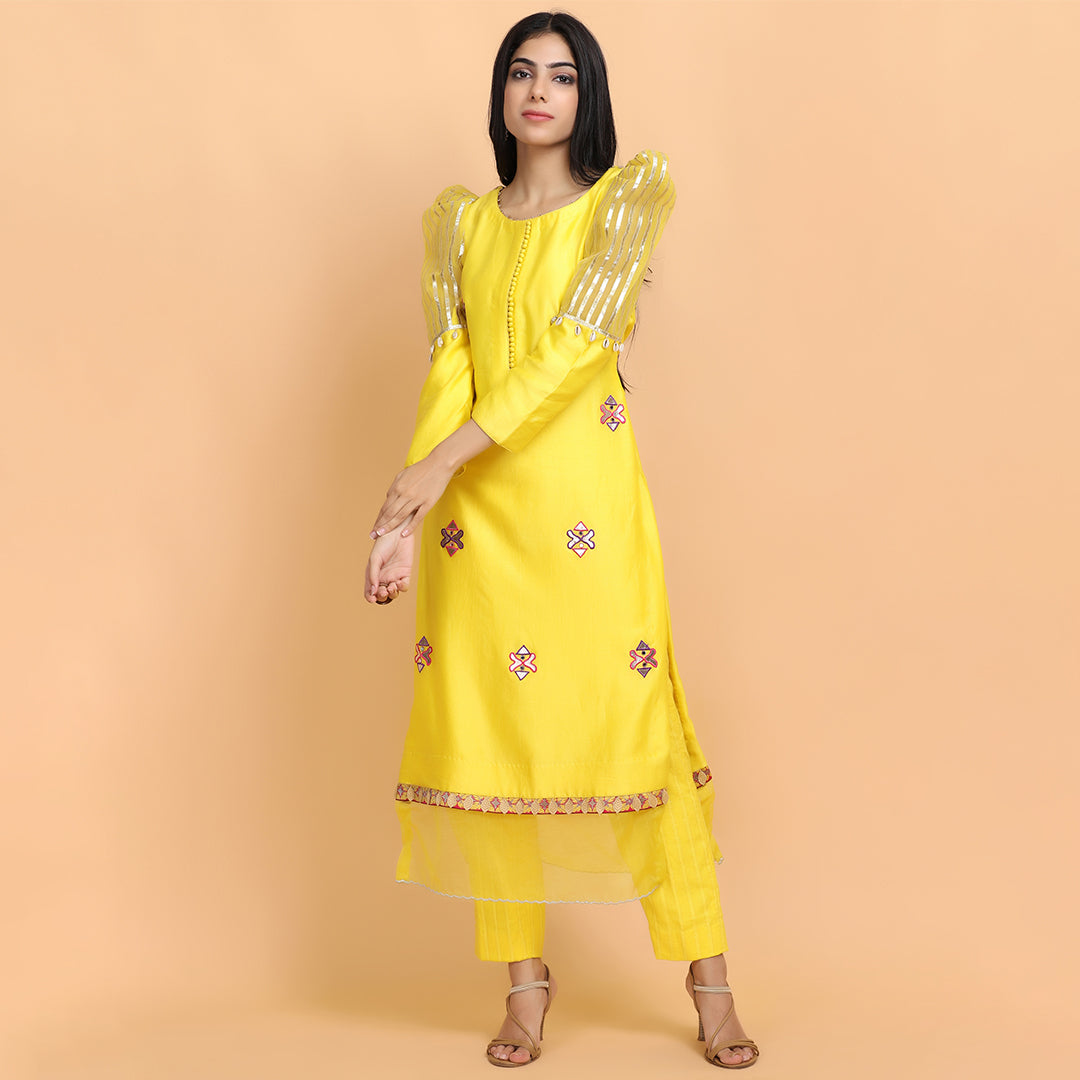 Yellow kurta in chanderi silk base with gota work and a resham embroidery, and a detailed puff design on the sleeves. Comes with cotton pants, and a patra dupatta