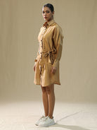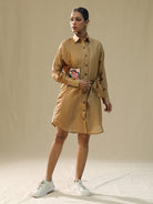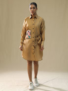 Description: The shirt is a light-brown, long-sleeved, collared dress with buttons down the front and a pocket on the left side of the chest. The overall style of the shirt suggests a casual, bohemian look, and the hand-painted design adds a unique touch to the garment.