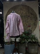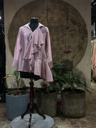 Description: That shirt's got some major style vibes! It's a baby pink shirt with a collared neck and long sleeves. The front's got a super cute ruffled detail that's kinda like a pop of drama, giving it that "pop the heart" kinda charm 💖.