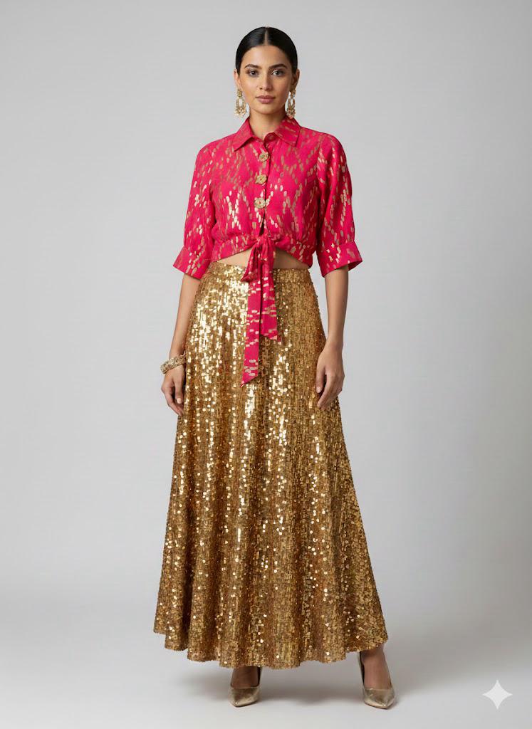 Pink Brocade Crop-Shirt with Gold Sequin Skirt