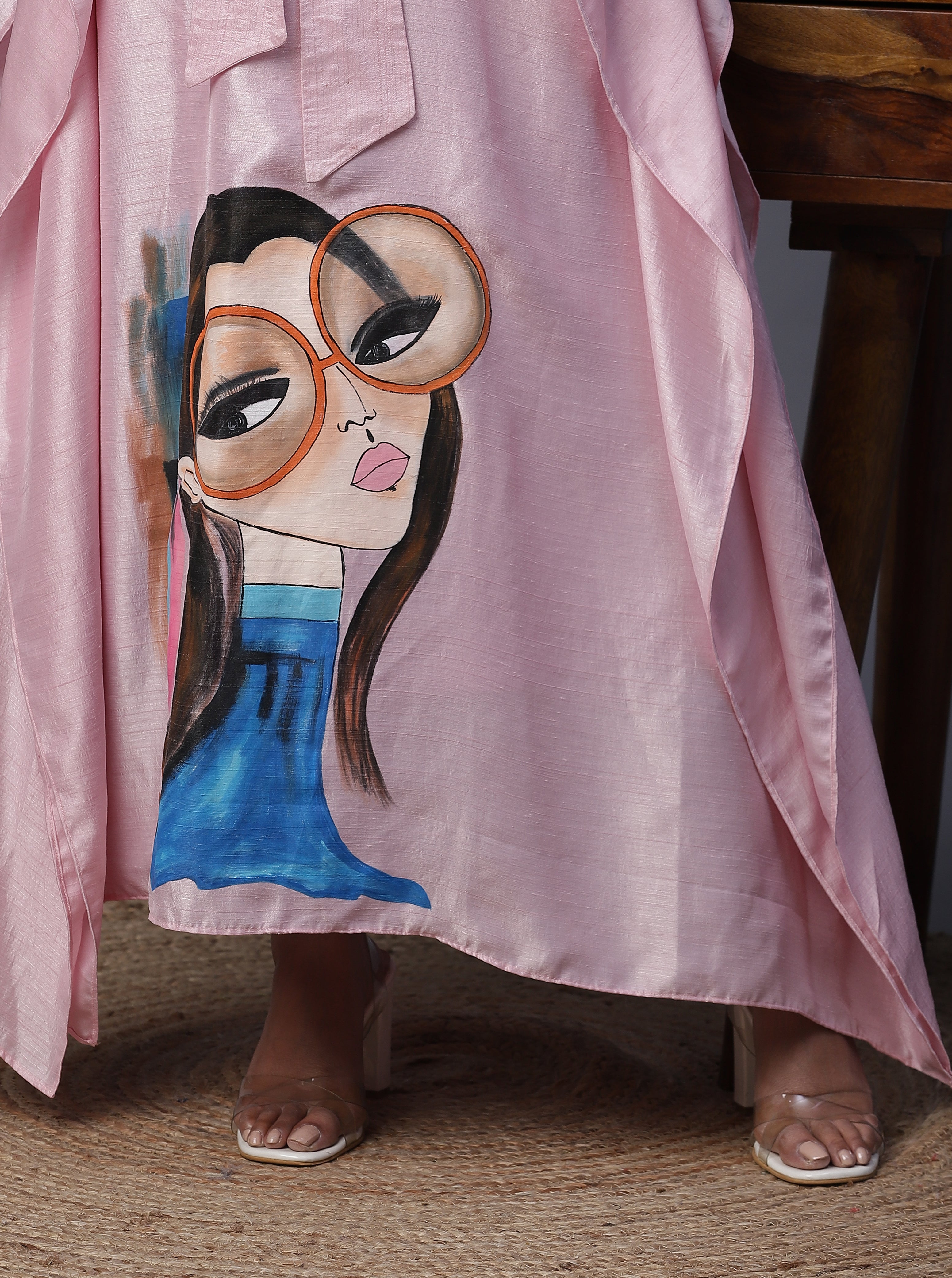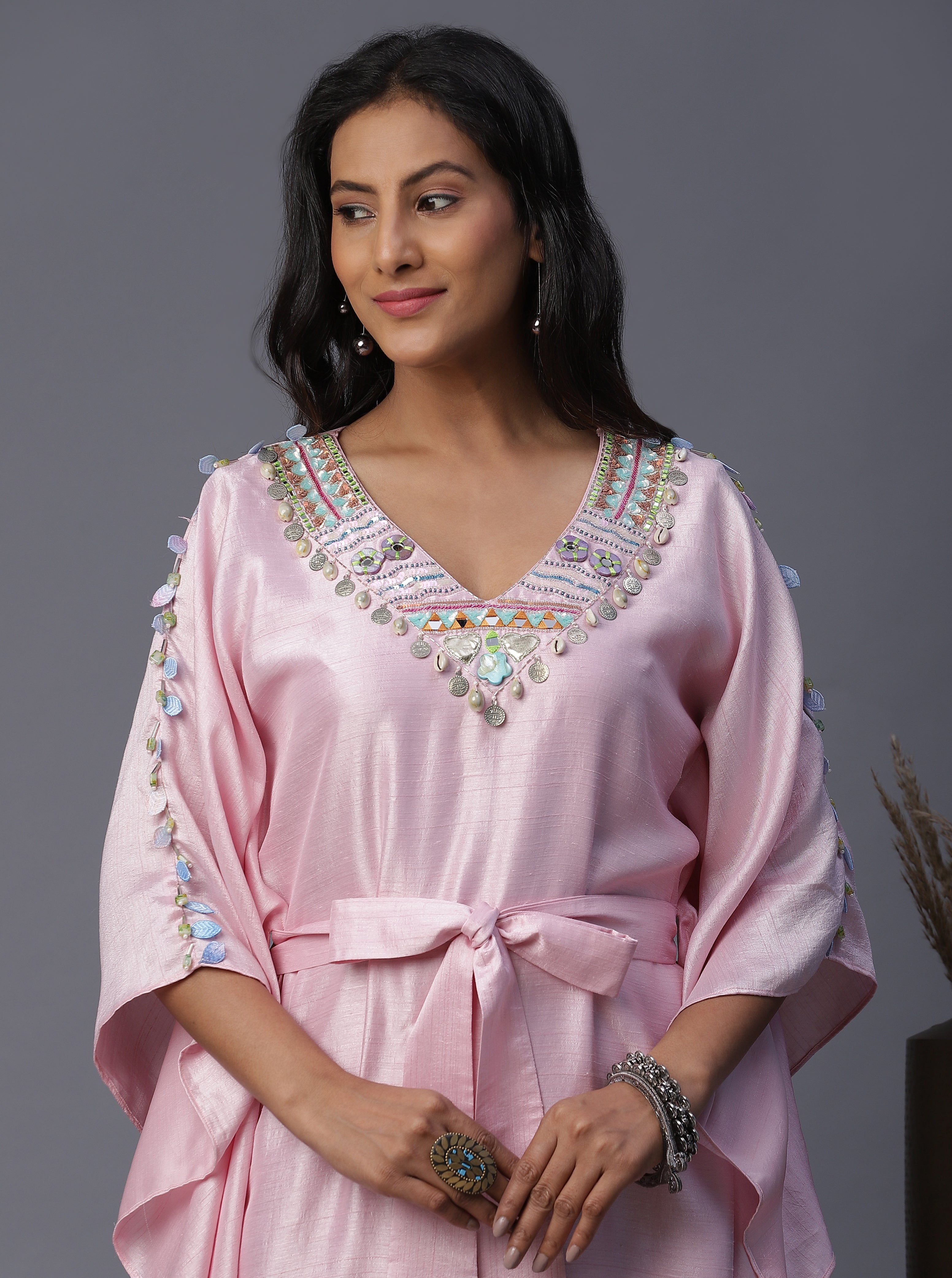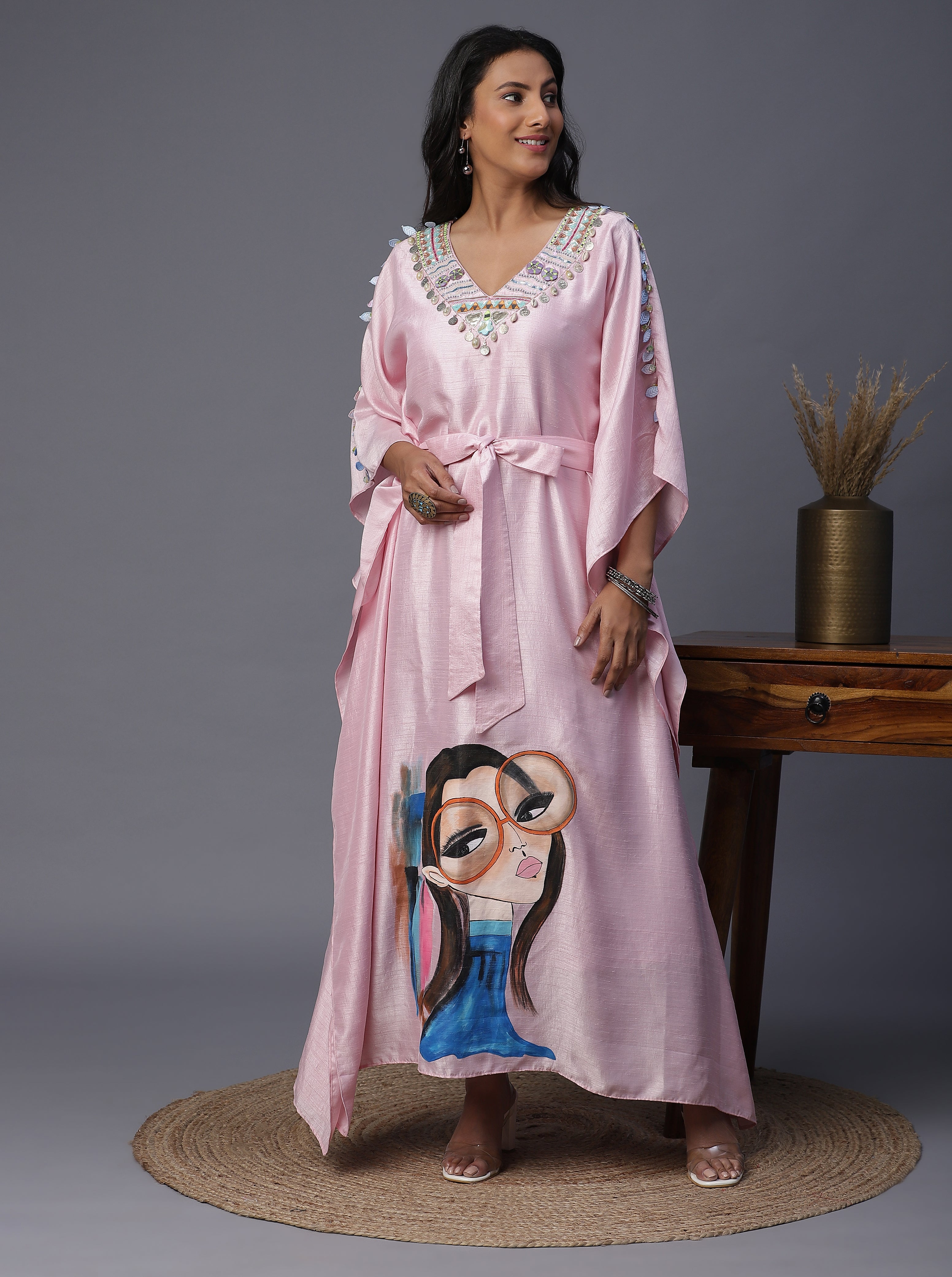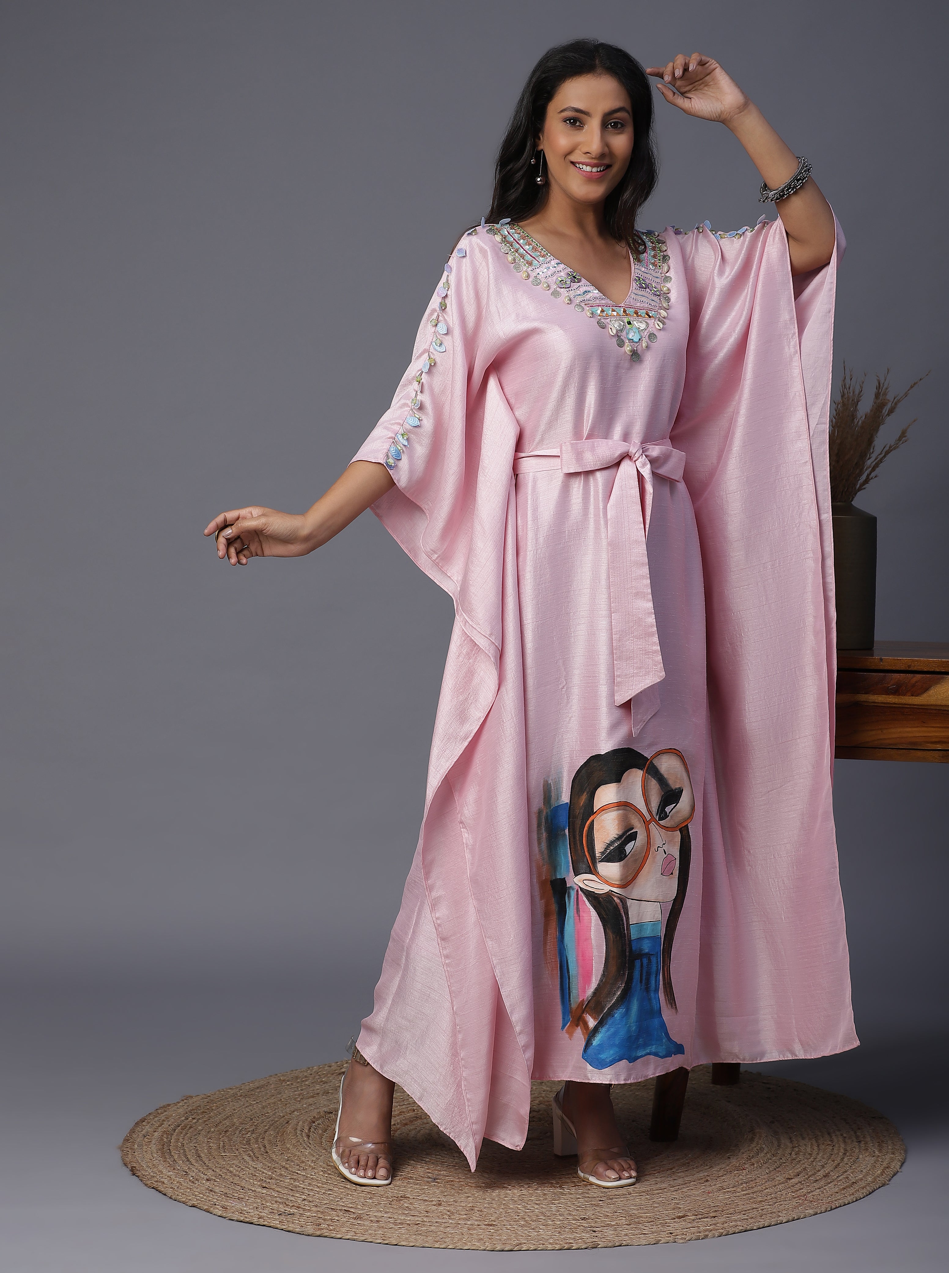 Description: Lilac handpainted kaftan in silk fabric. Comes with a boho hand-embroidered neckline. It's a stunning lilac embroidery kaftan set. The kaftan itself is a beautiful light pink colour with intricate embroidery details on the V-neckline and sleeves. There's a belt tied around the waist, giving it a chic silhouette.