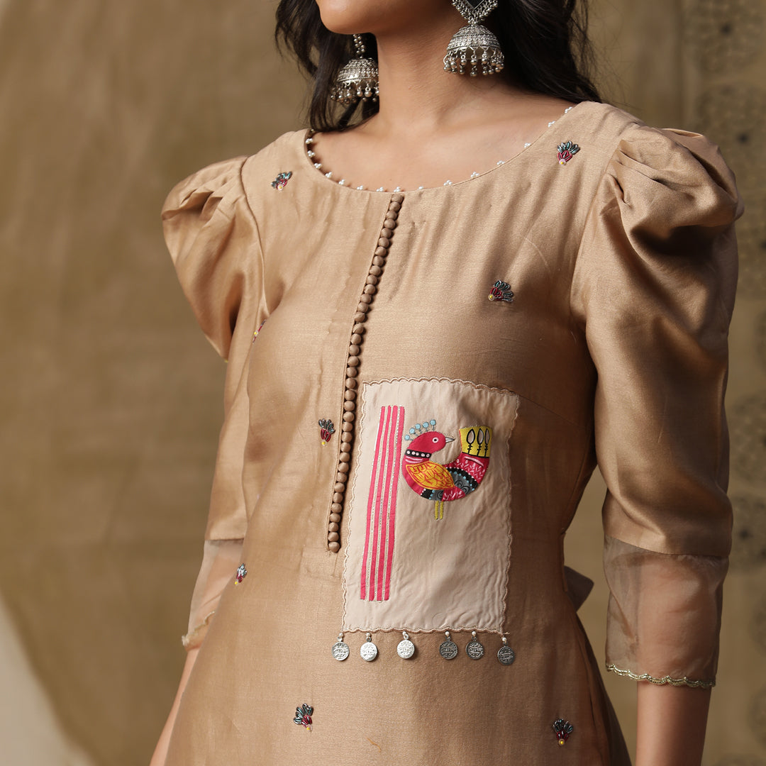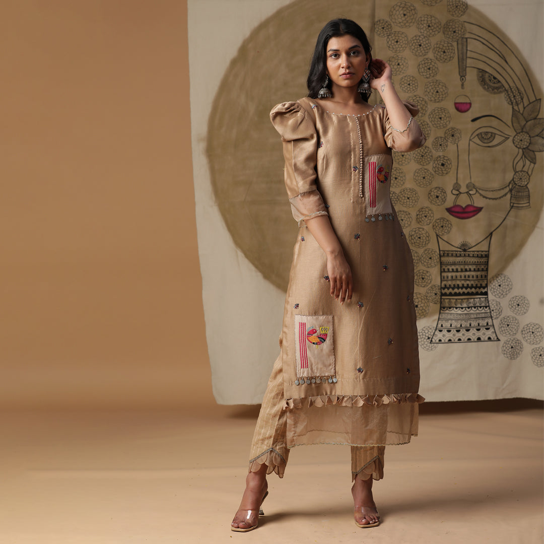 Handpainted kurta in golden. Comes with ankle length pants and dupatta.