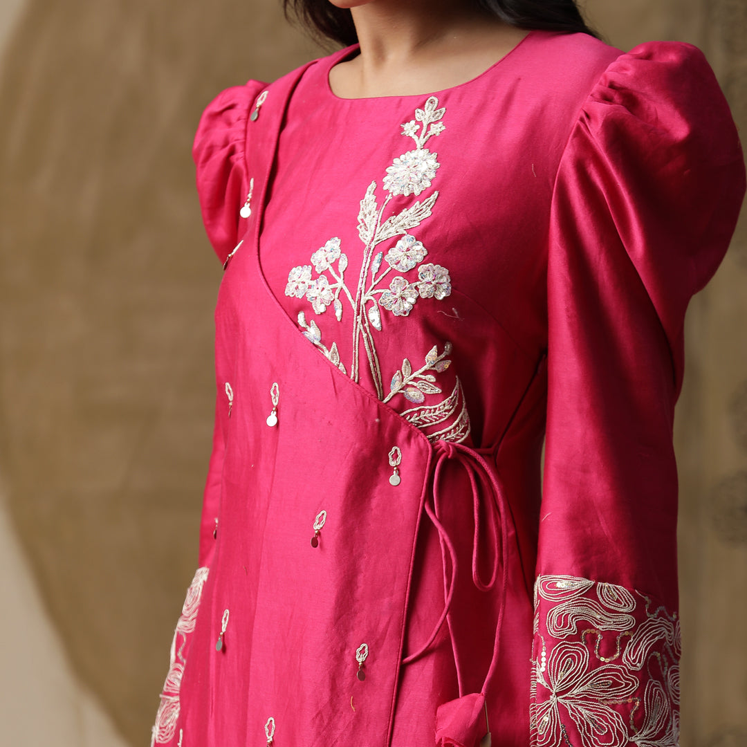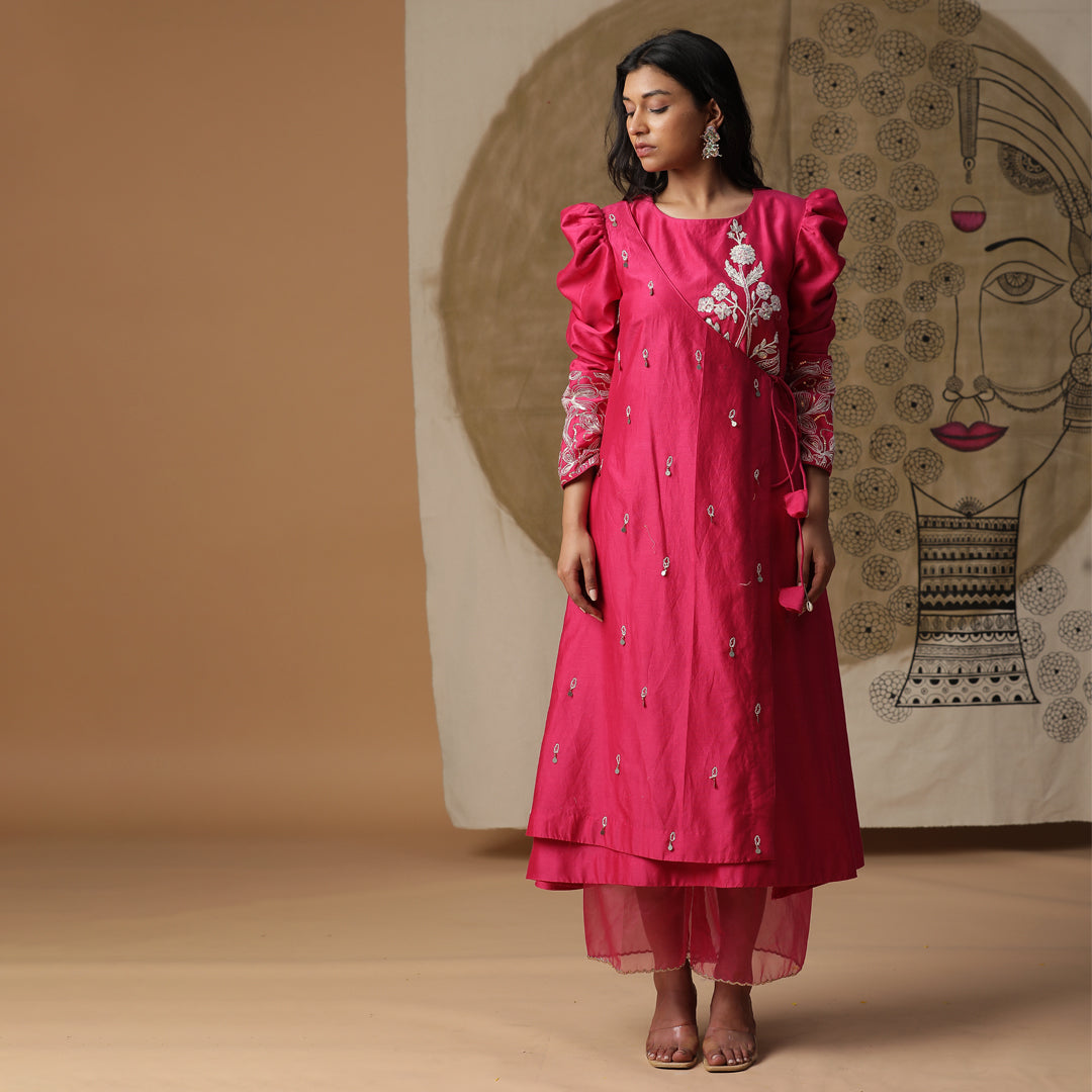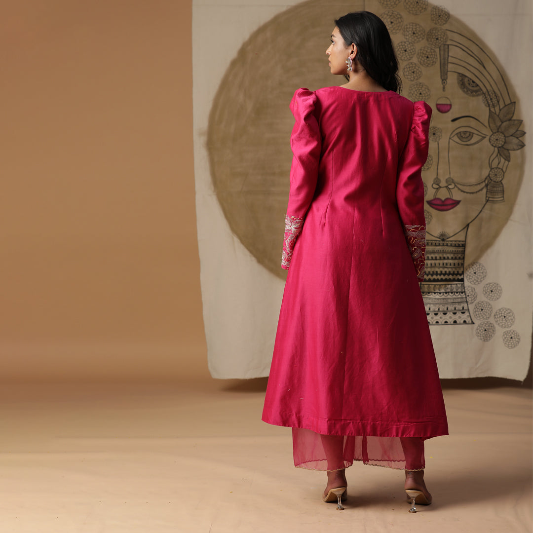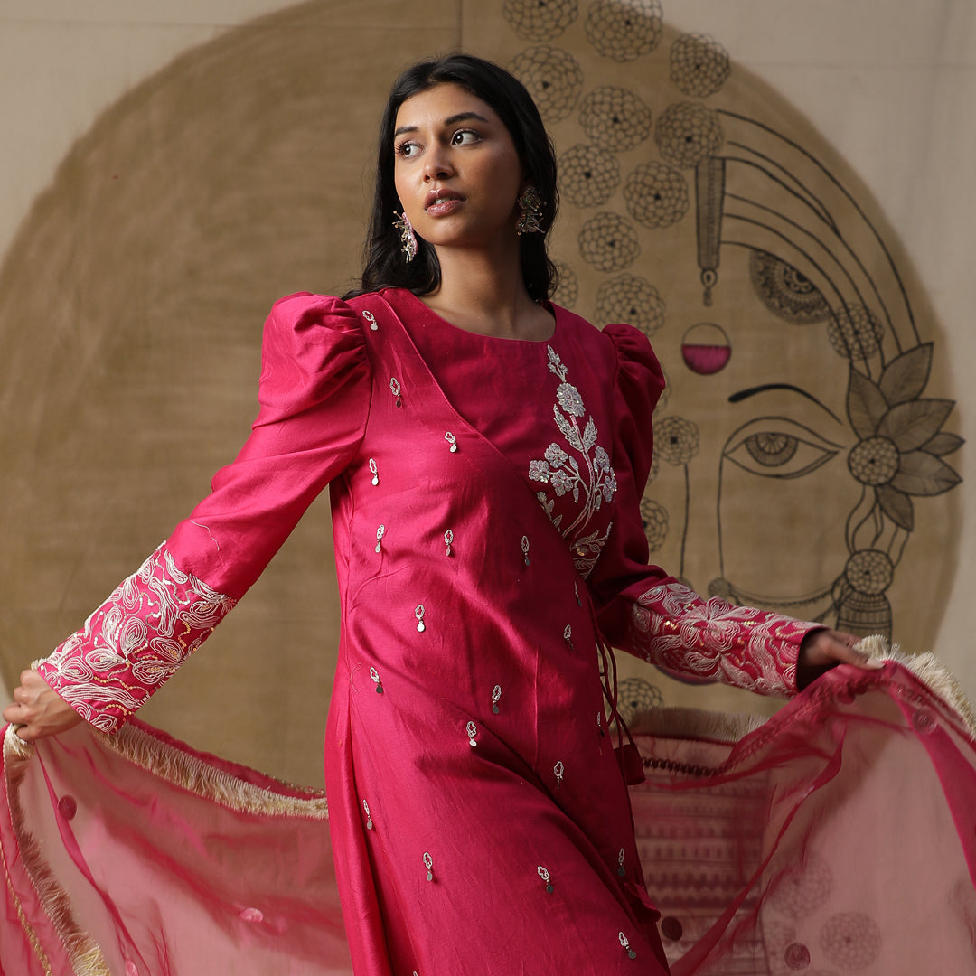 Description: Pink kurta with puff sleeves and dori work. Comes with ankle length pants and organza dupatta. The dress is a vibrant pink color with white embroidery. It has puffy sleeves with intricate white embroidery on the cuffs. There's a beautiful white embroidered design on the chest area.The dress seems to be paired with matching pink leggings or pants.The overall look is elegant and ethnic, perfect for a festive or traditional occasion in India.