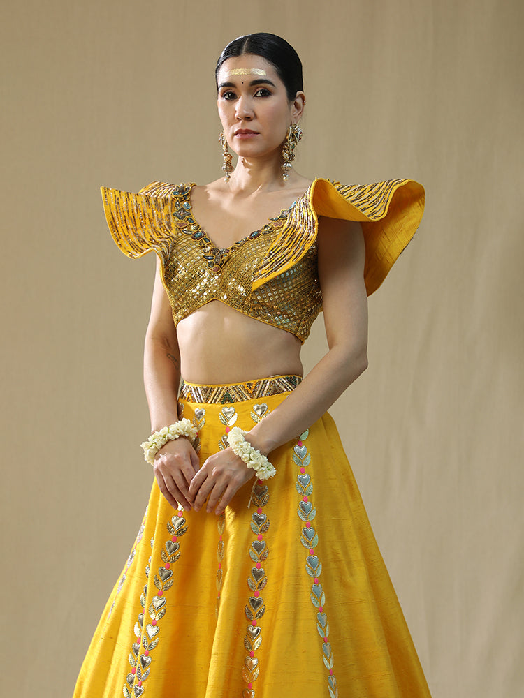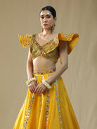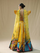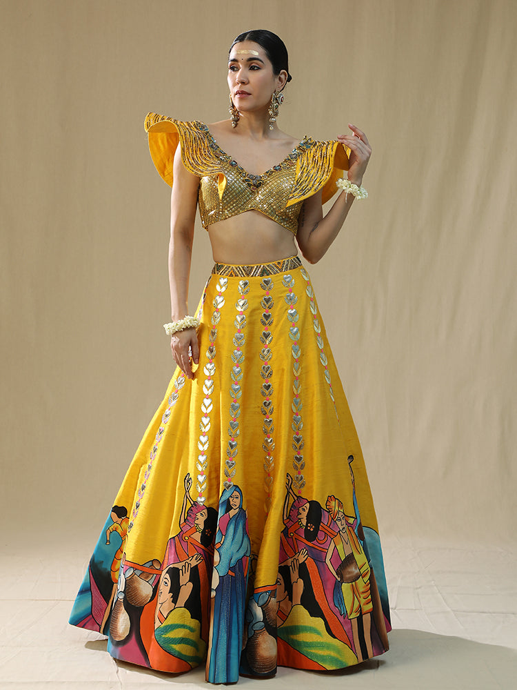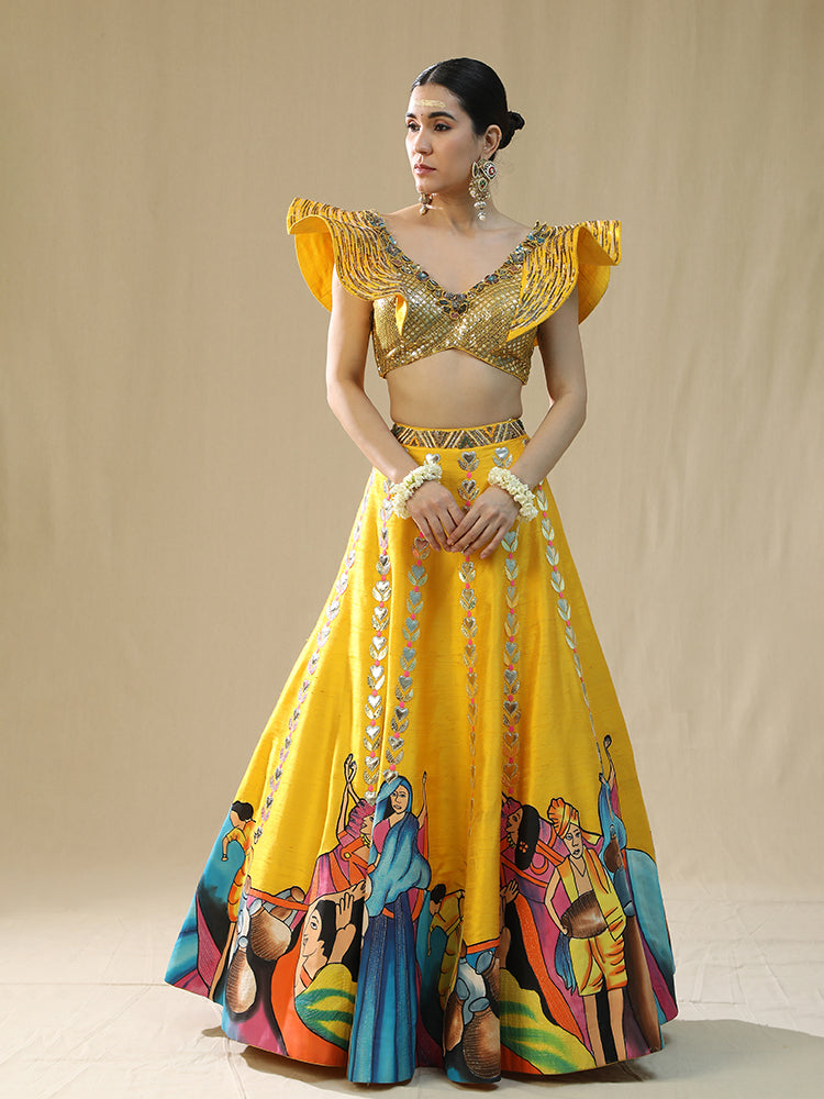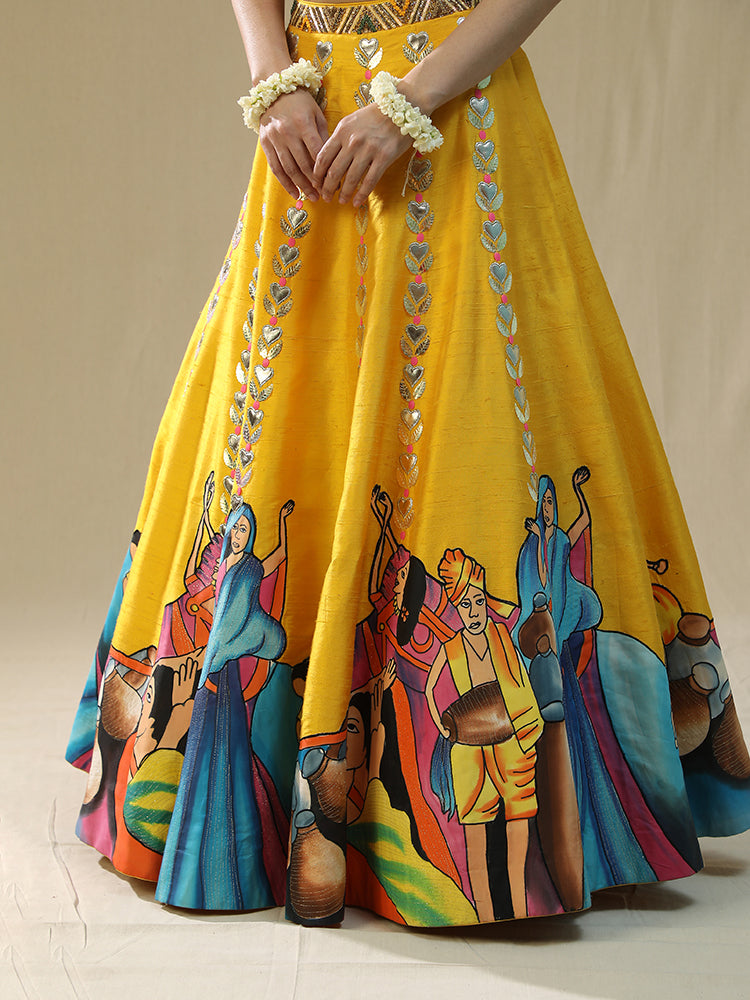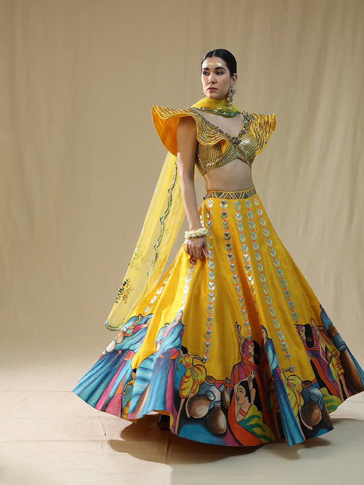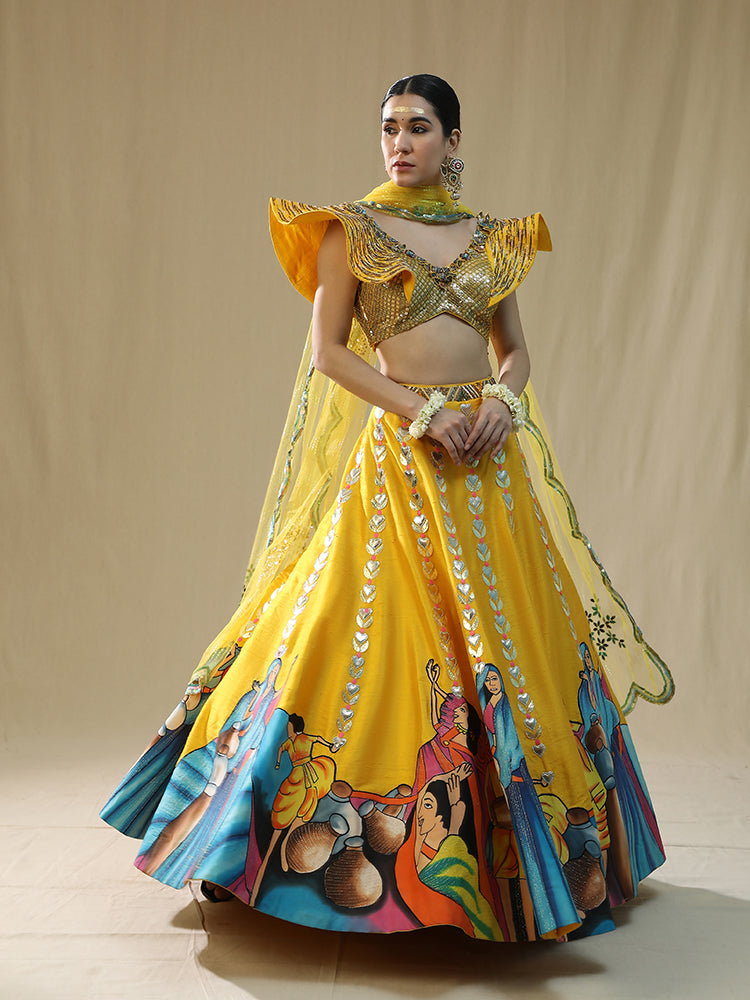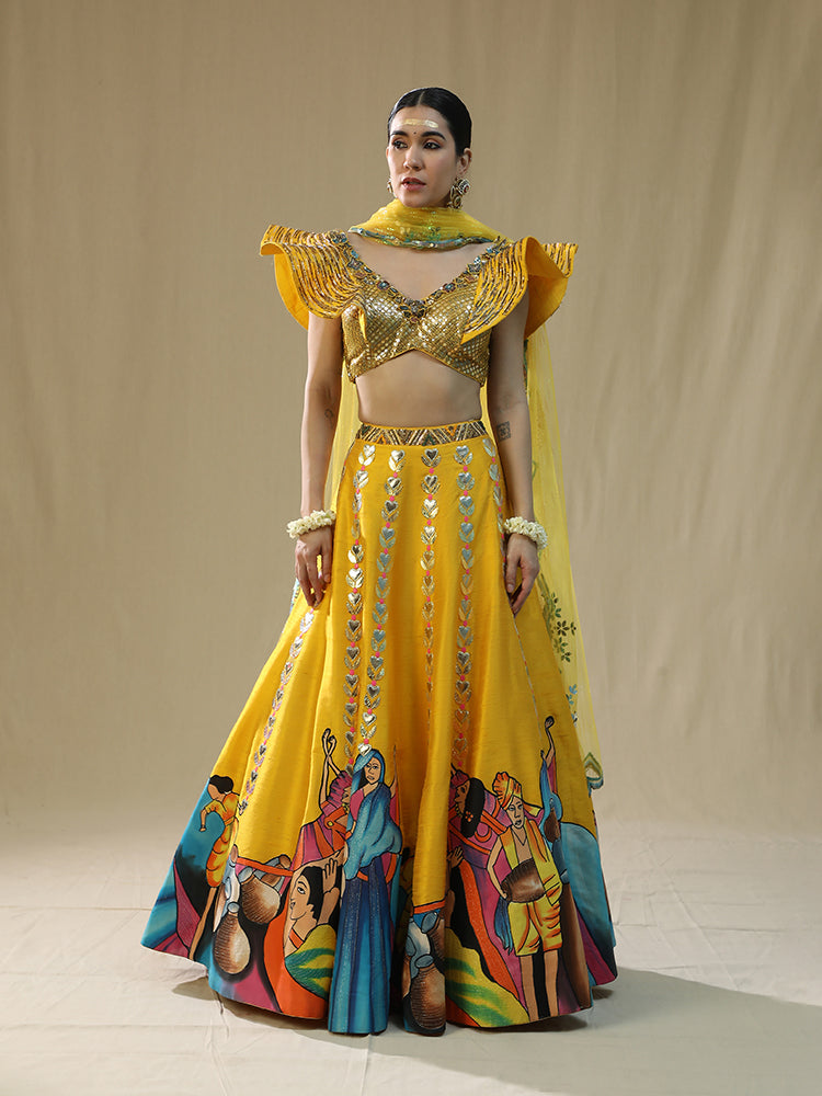 Description: Yellow Modern Barat Lehenga,Zari Zardozi Sitara Resham Handpainted lehenga. This hand-painted embroidery lehenga is totally stunning'! 🔥 The outfit's in a bright, sunny yellow hue that's super vibrant and festive. The lehenga itself has a beautiful design at the bottom with colorful figures of people in traditional attire - looks like some kinda folk scene or celebration. The blouse is gold with some intricate details, and there's a matching yellow dupatta ,around the neck kinda like a chic accessoryÂ