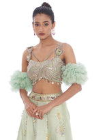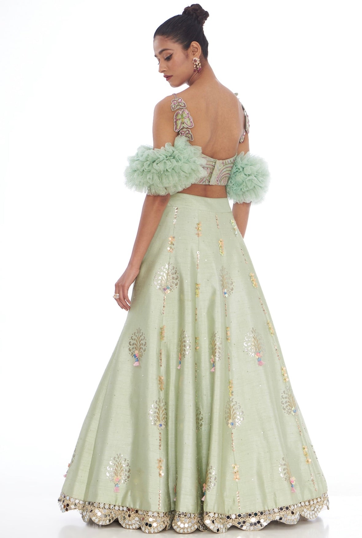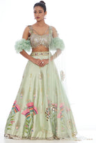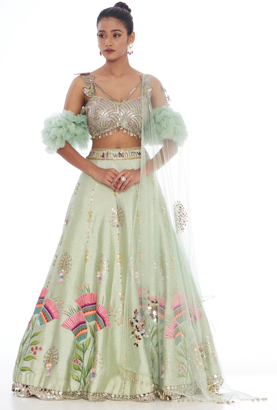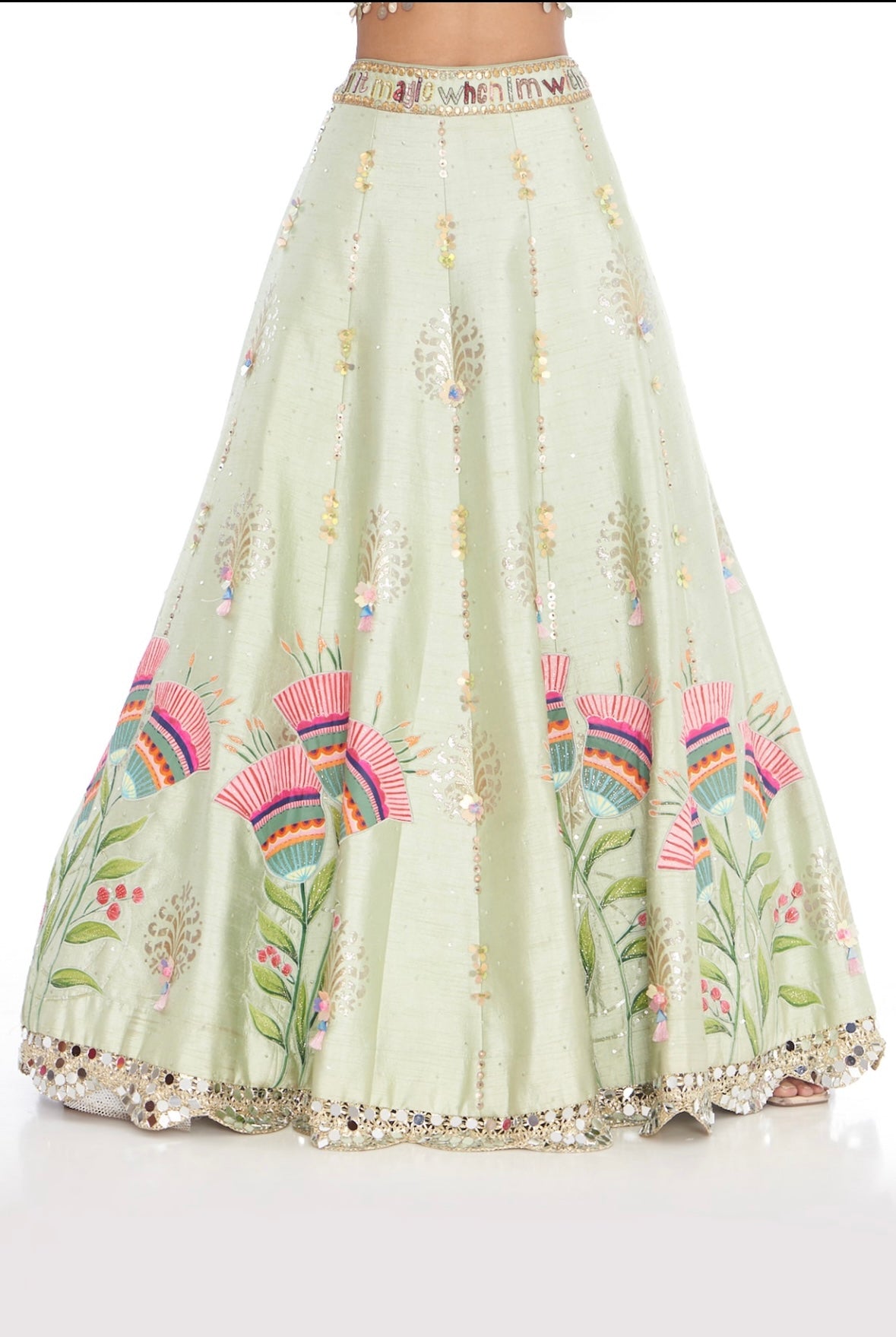 Description:Sea green bell Handpainted lehenga set,This lehenga is giving major festive vibes! The outfit's got a handpainted embroidery design that's totally on point. The lehenga is in a super pretty mint green shade.It's got some gorgeous handpainted embroidery with pink, blue, and some other pastel hues adding to the charm.Overall, this handpainted embroidery lehenga looks like a stunner for any festive occasion in India like weddings, Navratri, or Diwali.