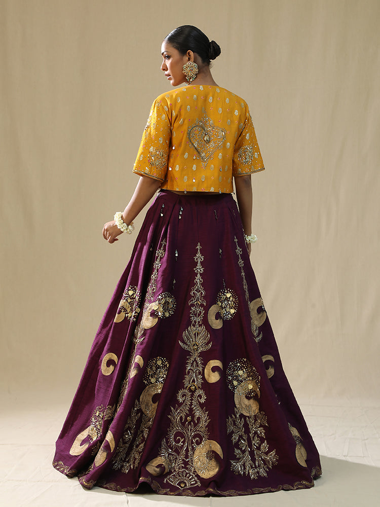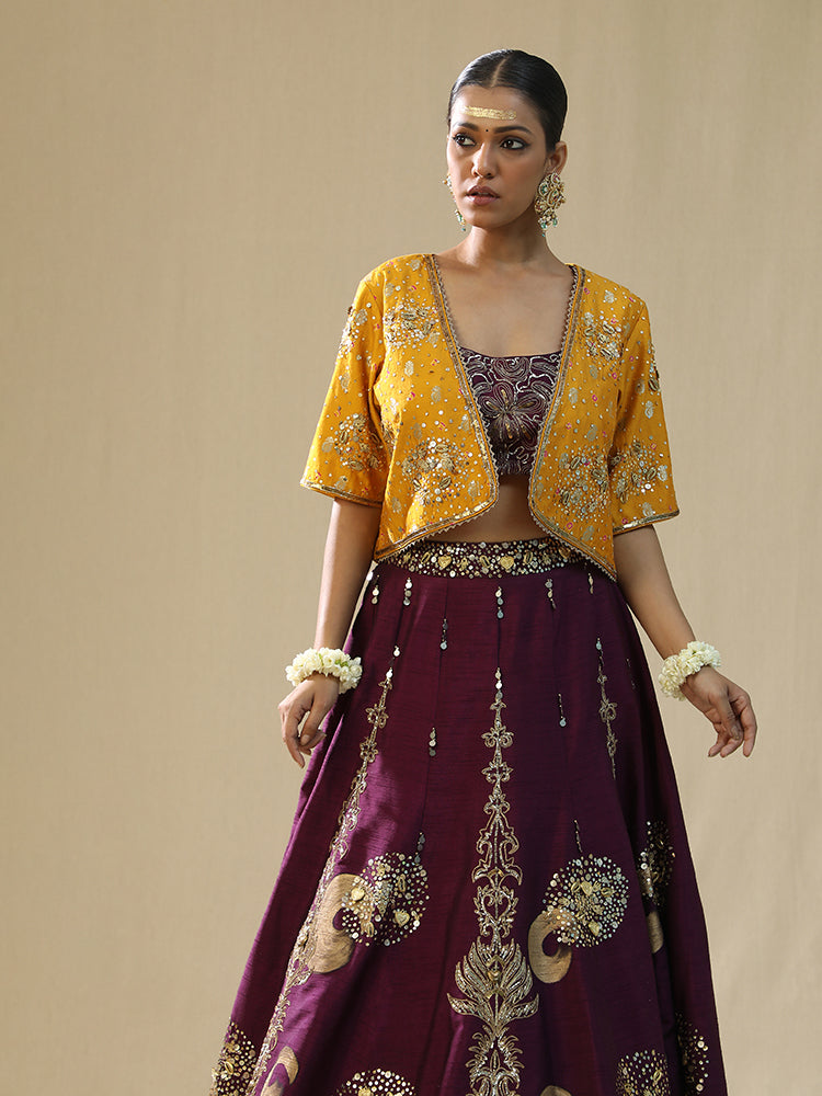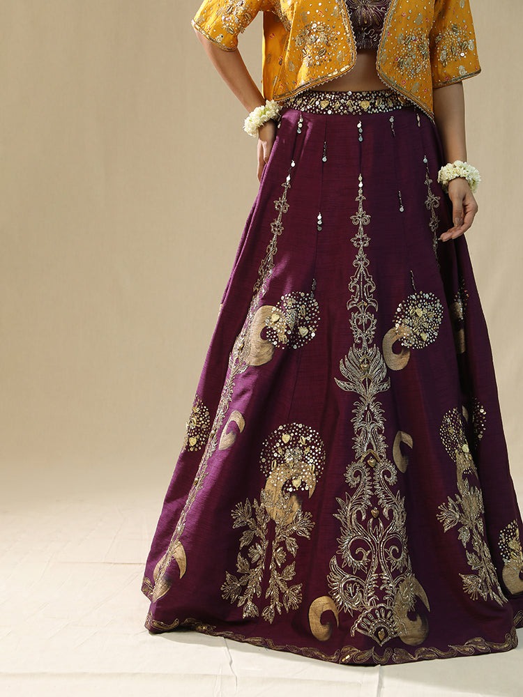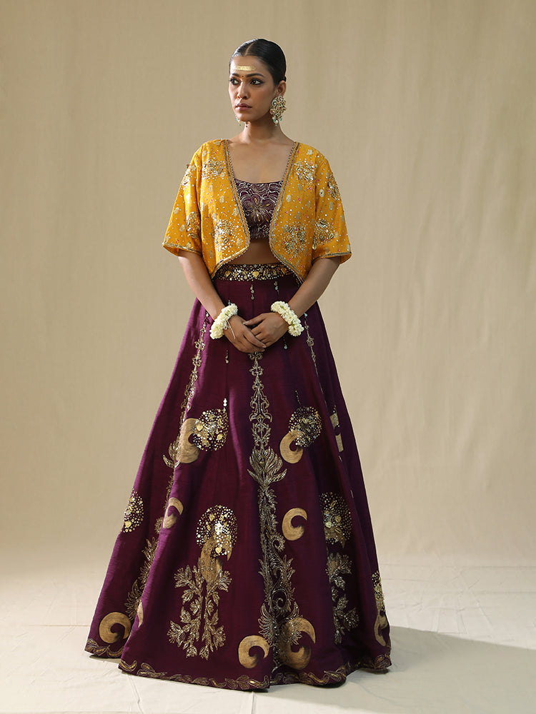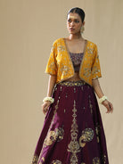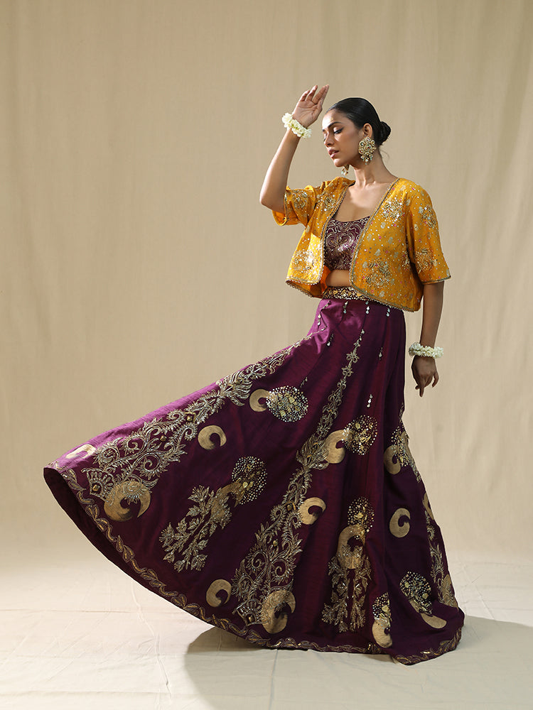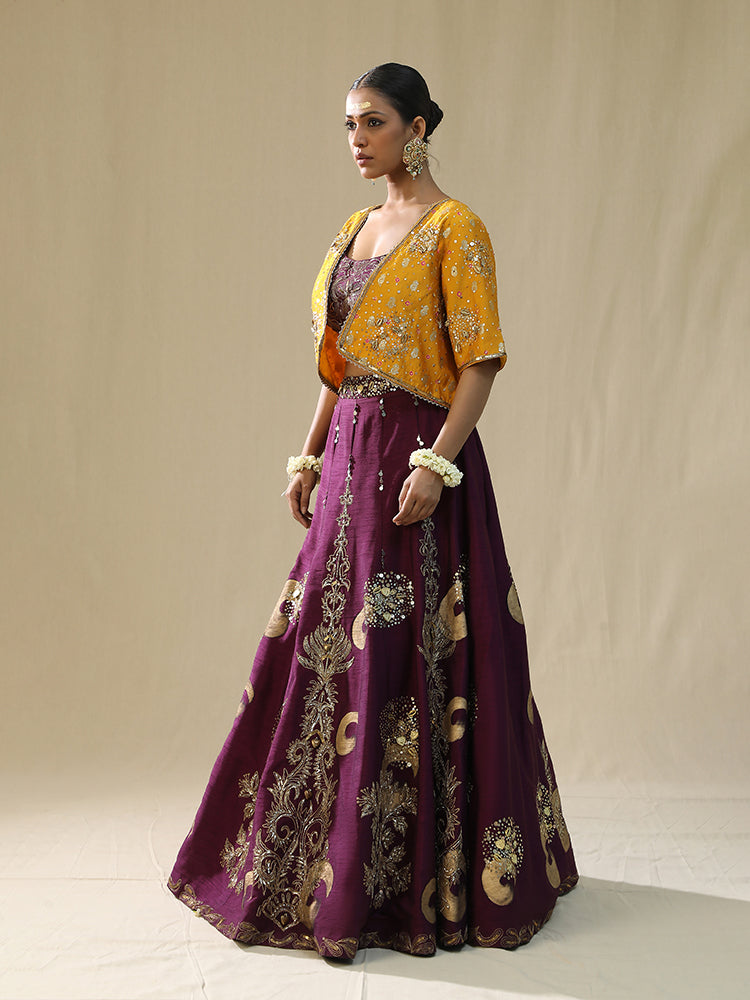 Description: Purple brushstroke lehenga set.The image depicts a woman wearing a traditional Indian outfit, specifically a lehenga choli, which is a popular attire for special occasions such as weddings and festivals. The lehenga is a long, flowing lehenga that is typically paired with a matching or contrasting blouse and often accompanied by a dupatta. The woman is wearing a purple lehenga adorned with intricate silver embroidery, complemented by a yellow jacket featuring similar embroidery.
