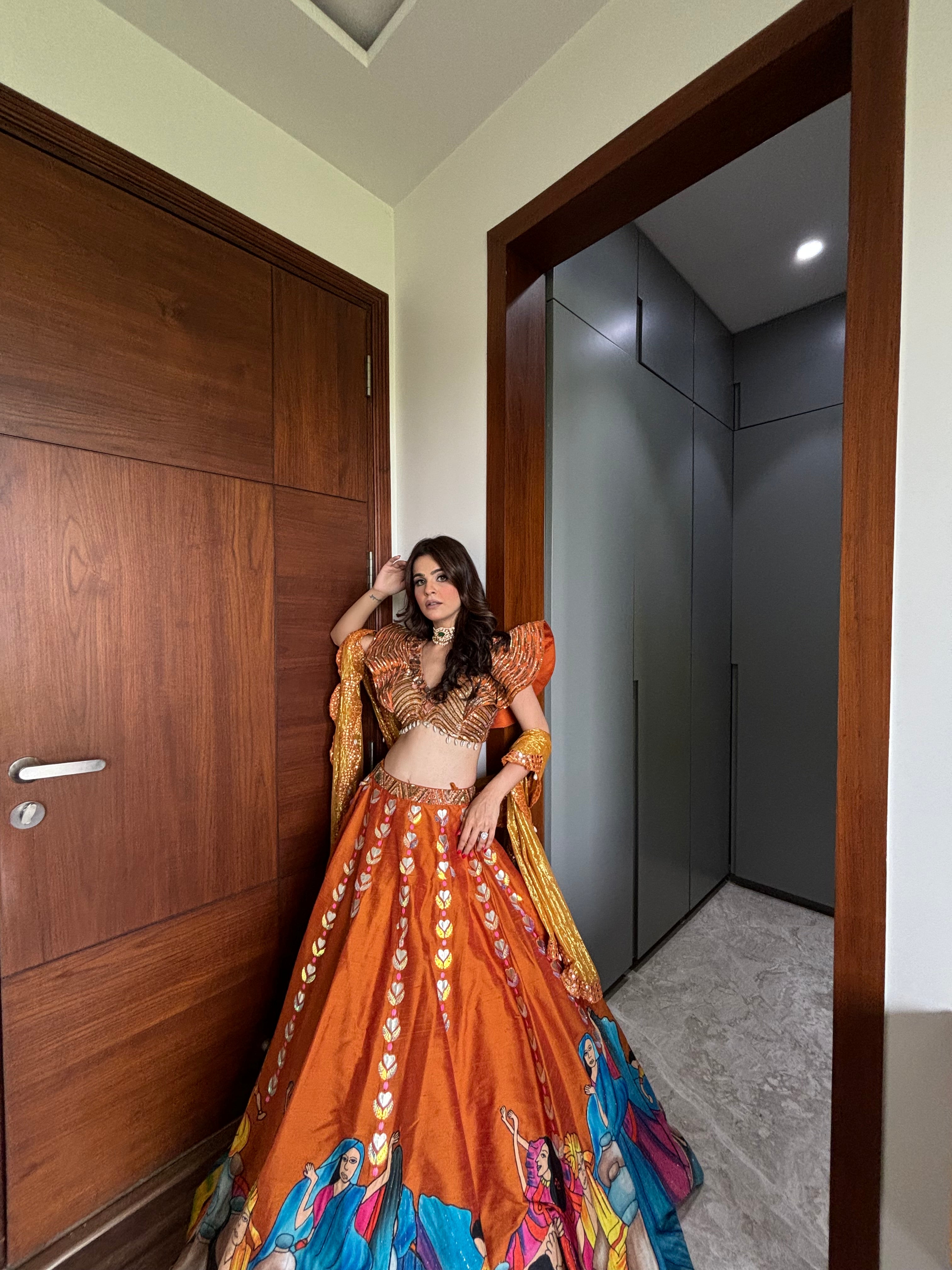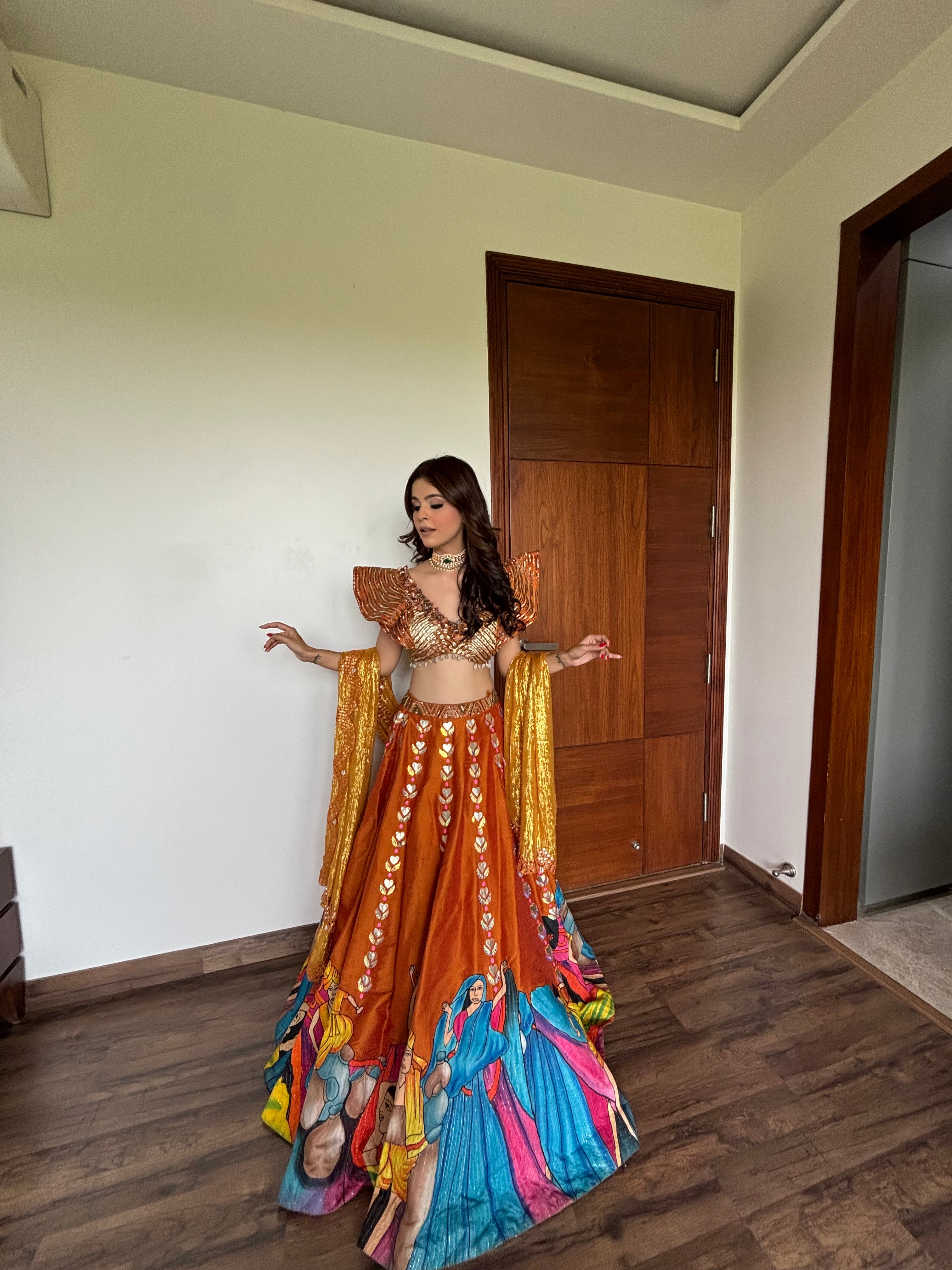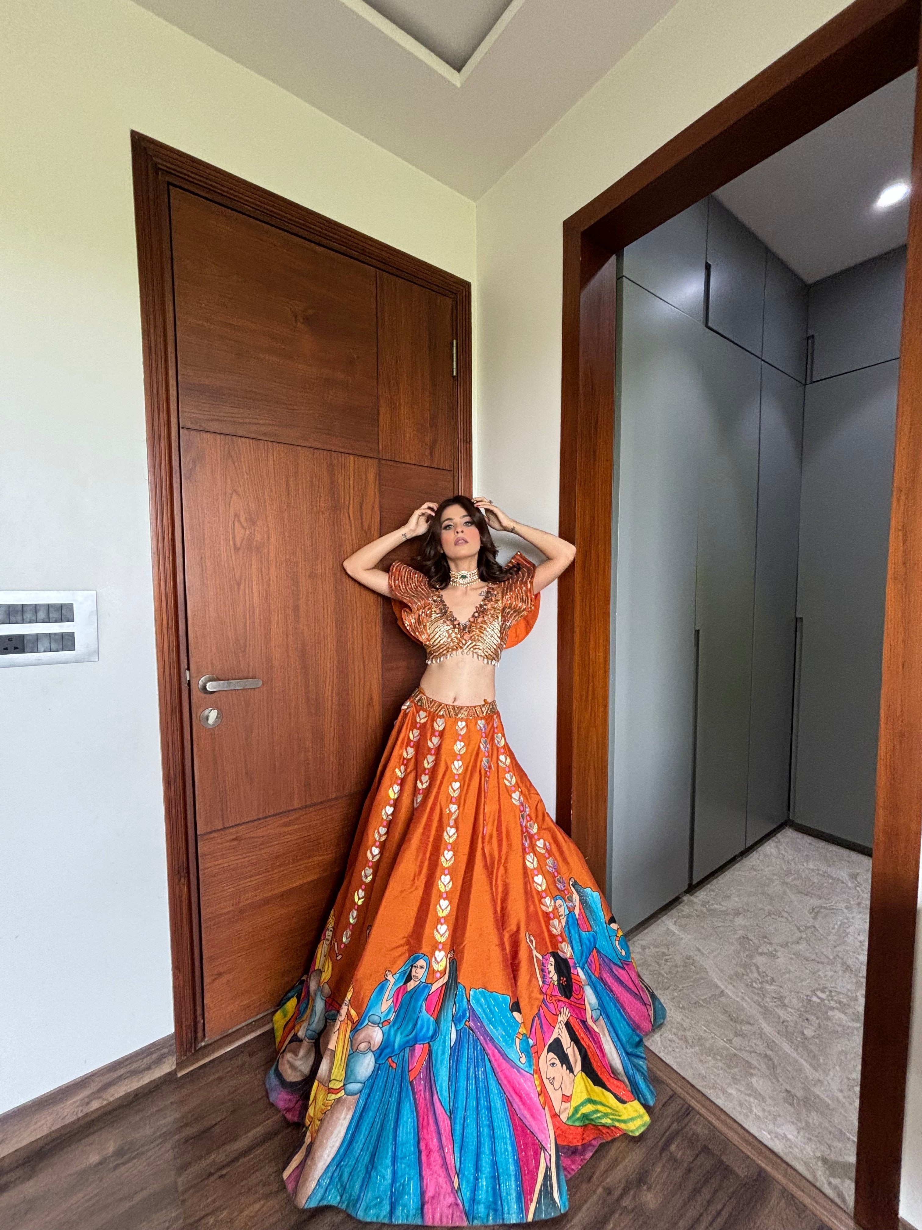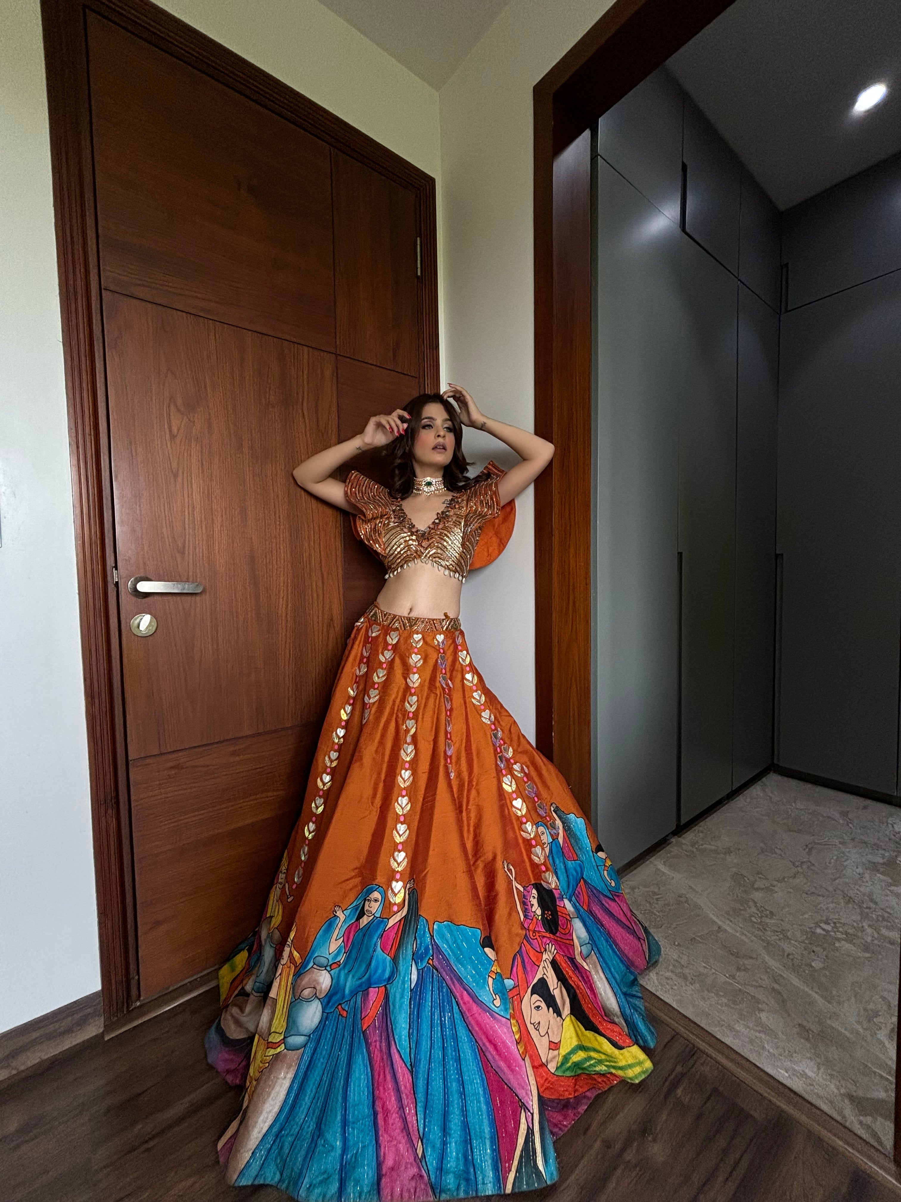 Description: WOW! 😍 This lehenga is totally on point! 💃 The modern barat hand-painted embroidery lehenga is a stunner! 🔥 It's got a vibrant orange base with gorgeous gold embroidery on the blouse and intricate details on the lehenga. The lehenga is a super cool village motifs hand-painted design at the bottom with shades of blue, pink, and yellow- looks like a total fusion of traditional and modern vibes! 💫 The blouse is a gold sparkly number with ruffles, and the outfit's completed with those dramatic orange sequined sleeves. 🔮 Overall, this lehenga's a showstopper.