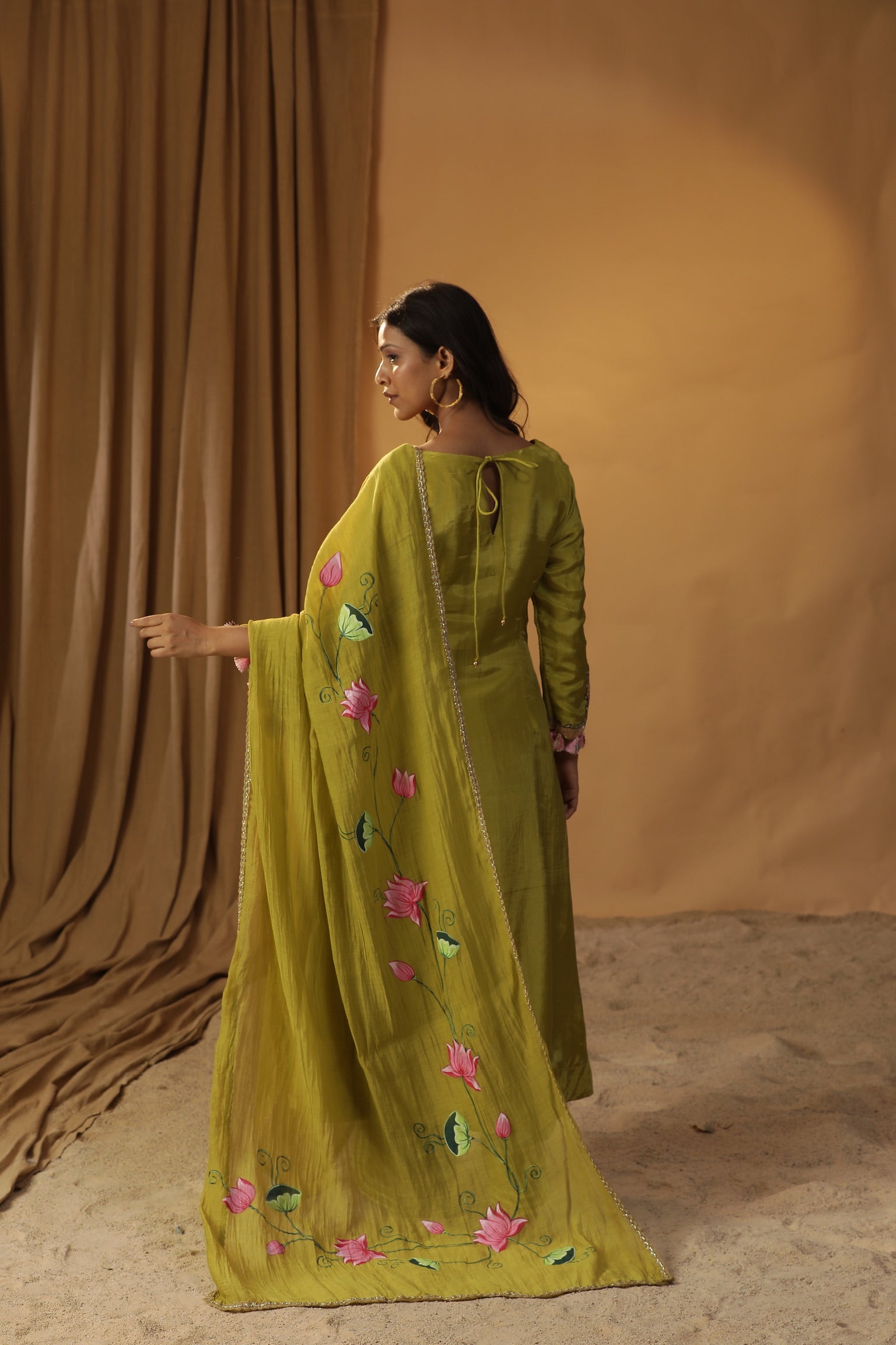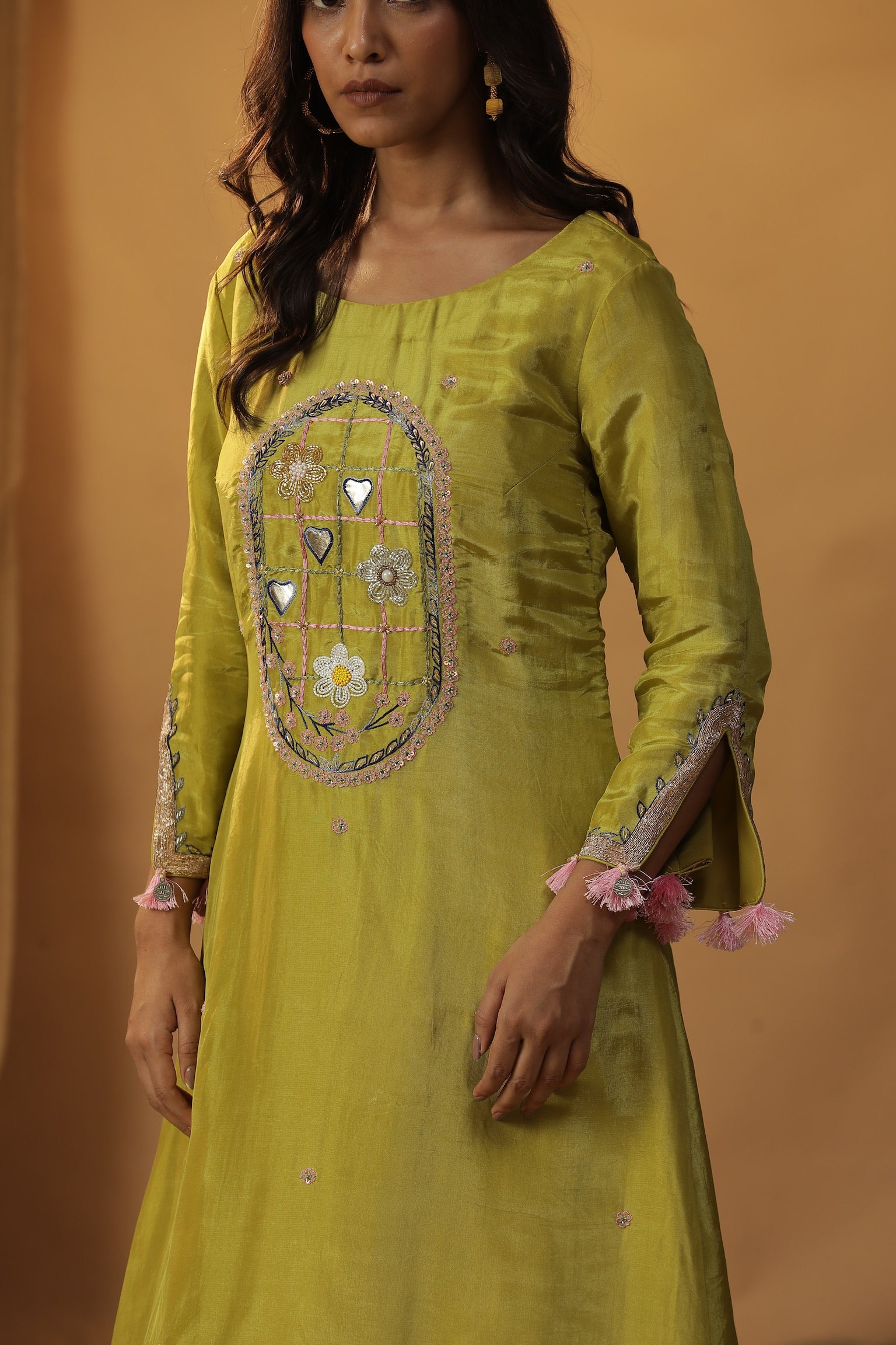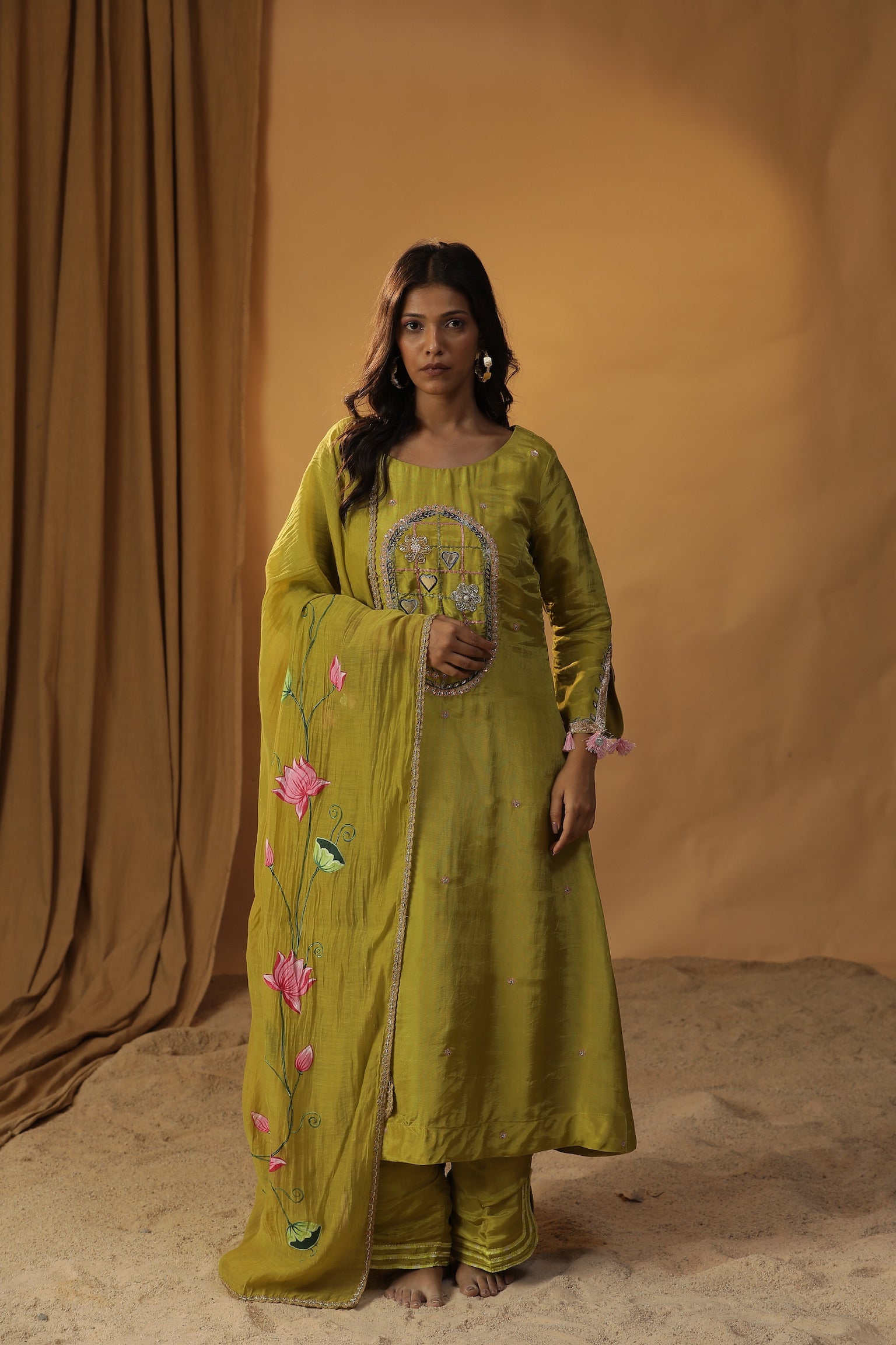 Description: Featuring our herbal garden embroidered suit set with leather work and cut dana work on the Kurta. Comes with pants and handpainted. The handpainted embroidery suit in the image is a stunning lime green outfit.The woman in the image is wearing the traditional Indian suit, likely a kurta-pyjama with a dupatta.