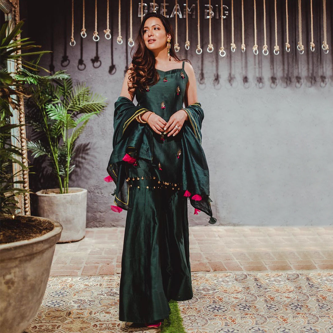 Description: Bottle green garara set in chanderi silk fabric.The kurti is hand embroidered with leaf motifs. Comes with a net dupatta.The outfit in the image is a stunning teal-colored ensemble with intricate details. A teal-colored top with floral embroidery and cut-out shoulders, adding a touch of elegance.Bottom: Matching teal-colored pants that complement the top perfectly.Dupatta: A teal dupatta with gold trim and pink tassels, adding a pop of color and texture. The outfit seems perfect for a festive or traditional occasion, blending modern cuts with ethnic detailing.