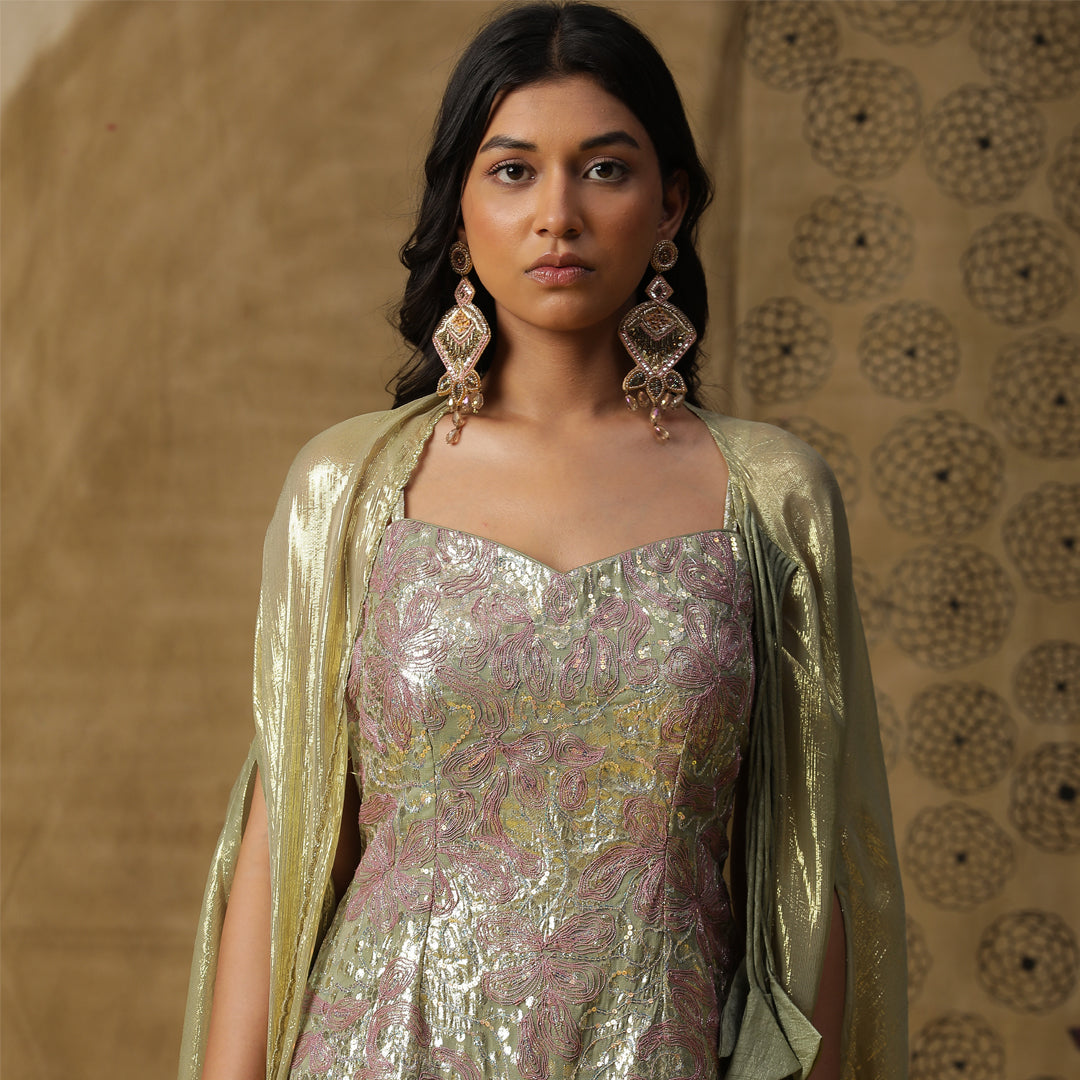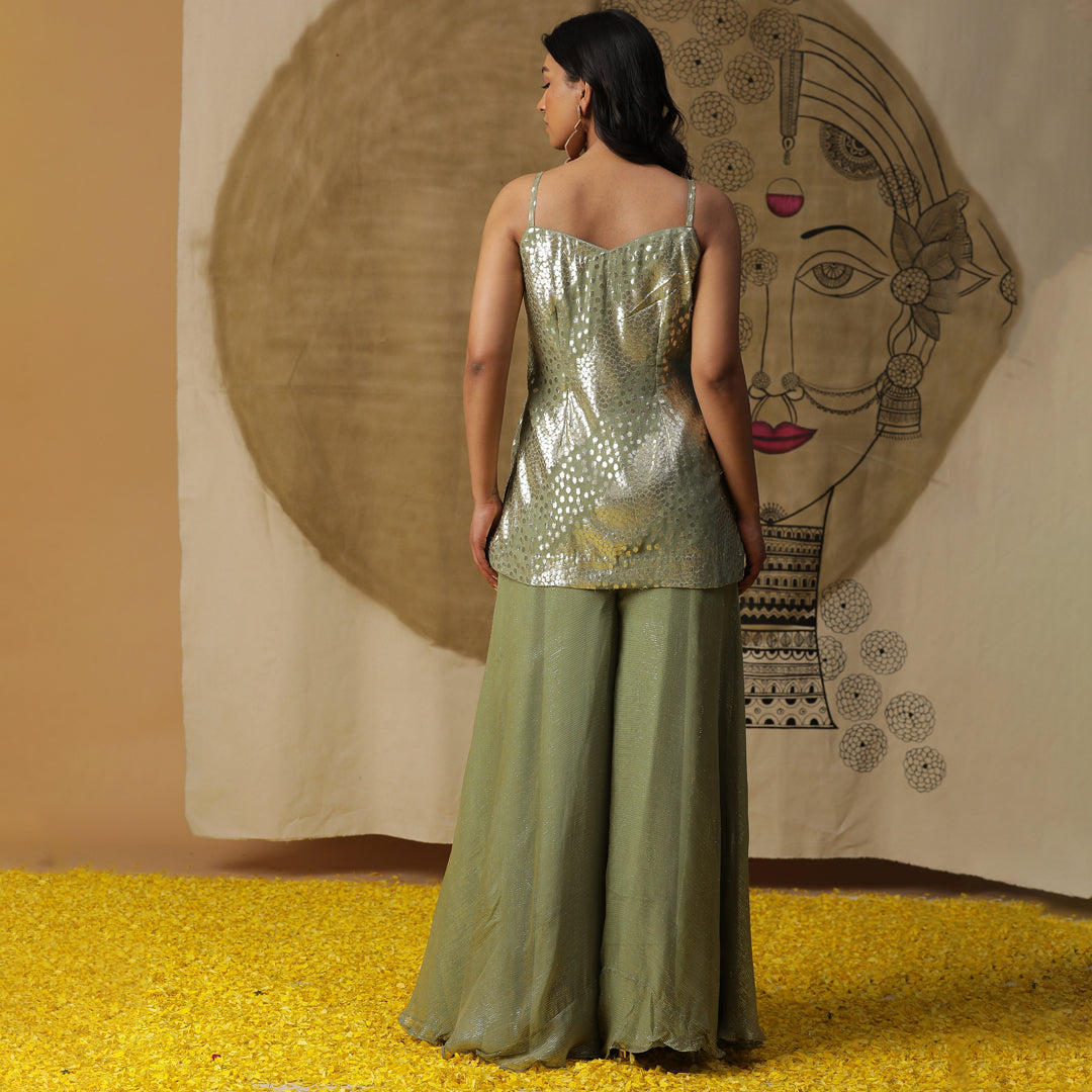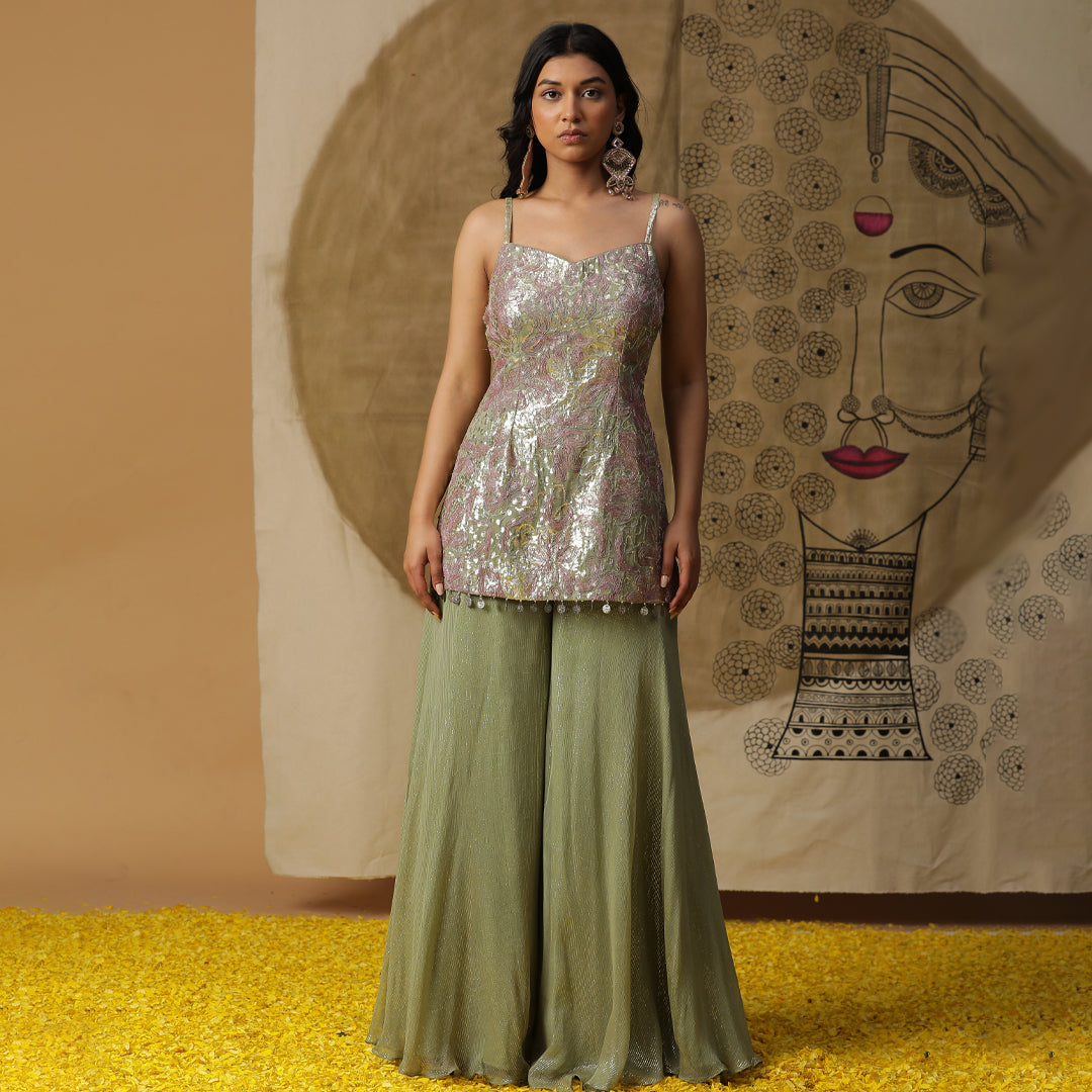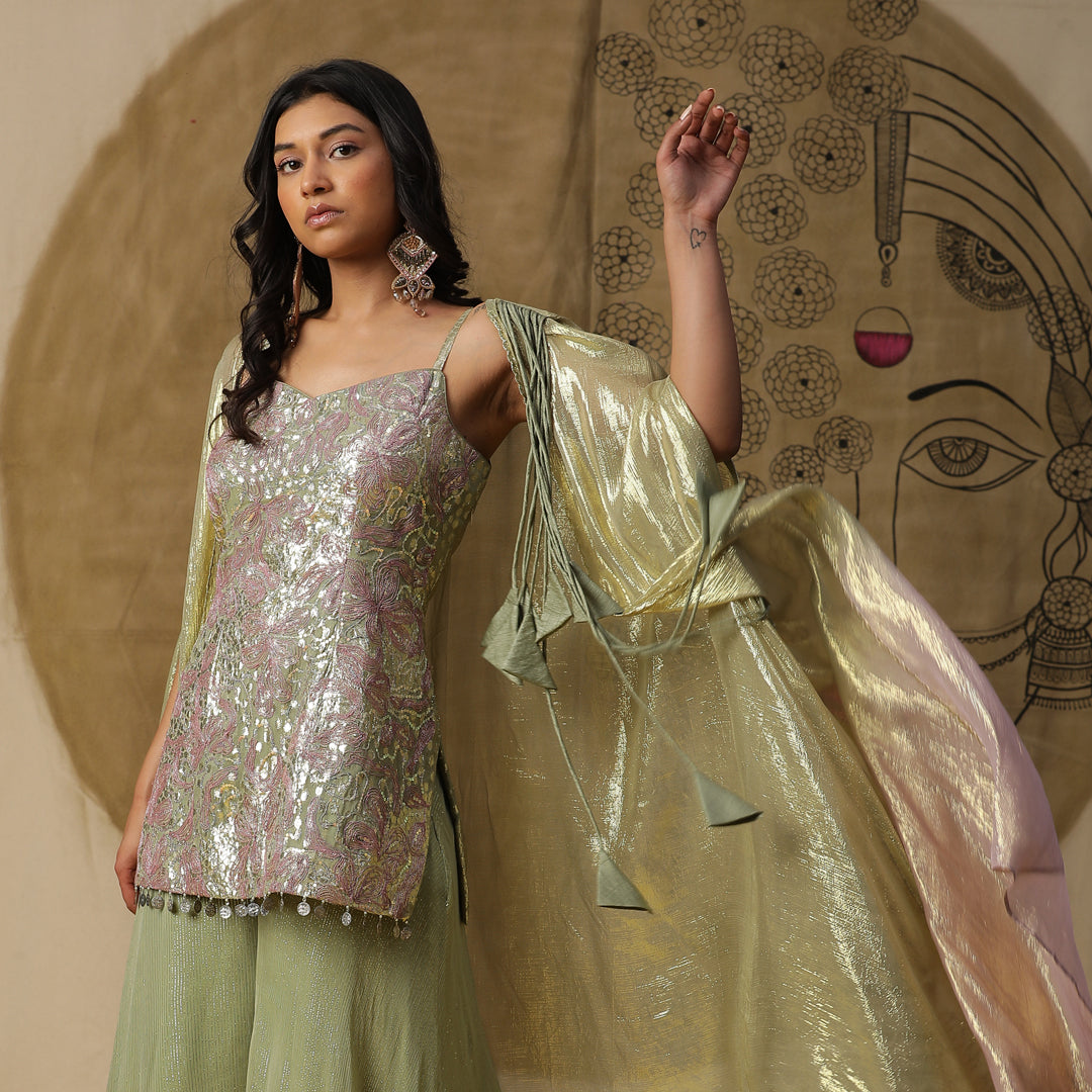 Description: The image shows a woman wearing a pista green sharara set, which is a type of Indian outfit. The top is a sleeveless, sequined camisole with thin straps and a sweetheart neckline. The bottom is a pair of kurta, plazoo pants that are also pista green in color. The overall effect is elegant and sophisticated, making it suitable for formal occasions such as weddings or parties. The outfit is made of high-quality materials and is well-tailored, suggesting that it may be a designer or luxury brand.Pista green kurti with palazzo. Comes with an ombre cape.
