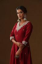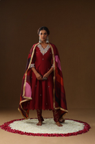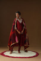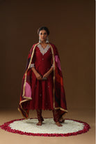 Description: The Mehroon Custom Hand-Painting Kurta Set from the Laal Ishq collection is a true work of art. Crafted in luxurious chanderi fabric, it features exquisite hand-painted motifs that bring timeless elegance to life. Paired with a soft patli chanderi dupatta and matching chanderi pants, this ensemble is perfect for festive occasions and intimate celebrations