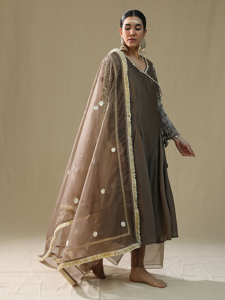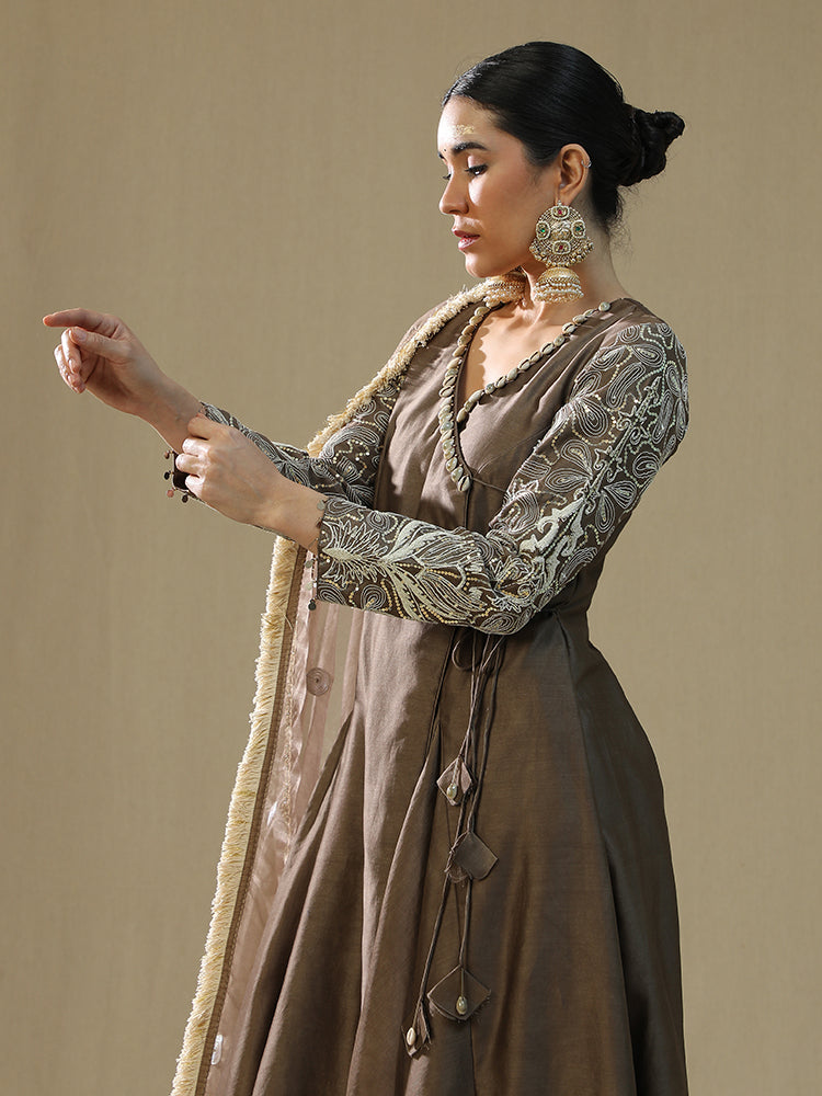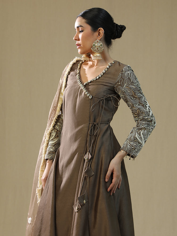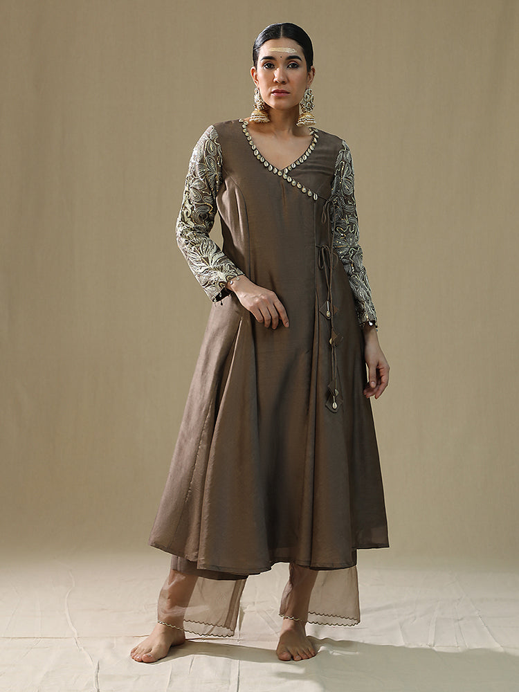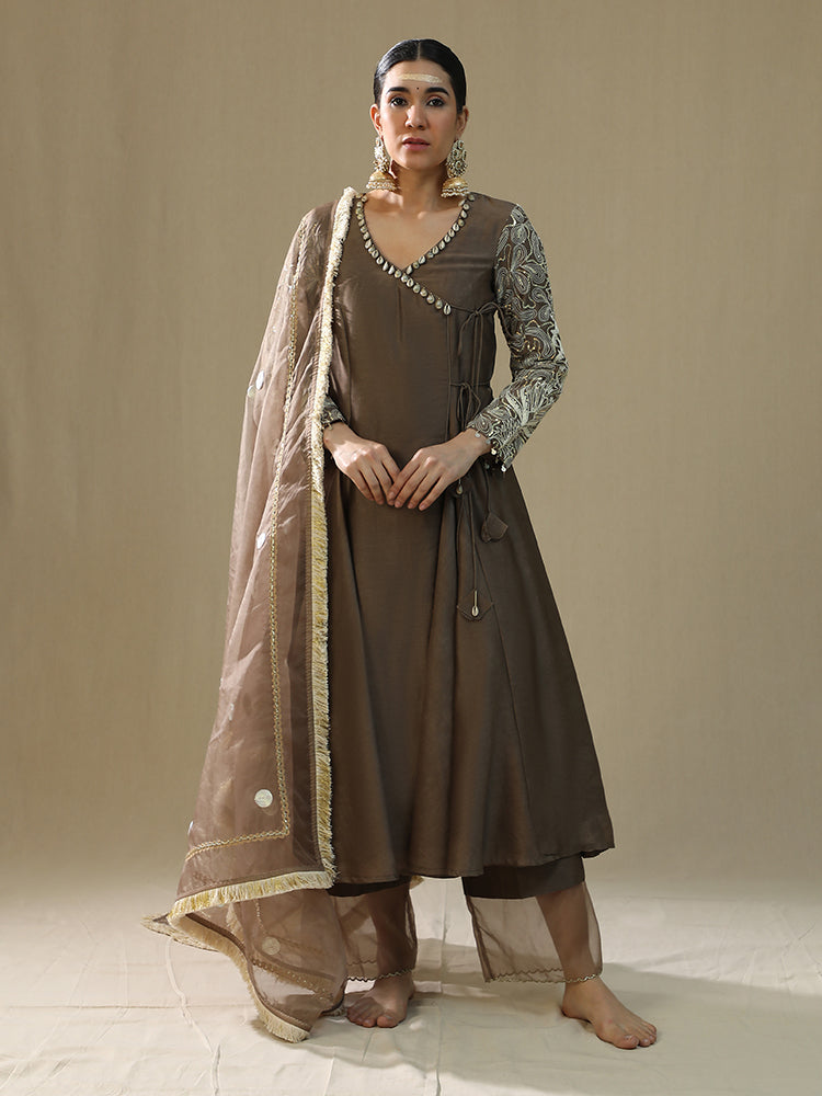 Description: Mocha Chanderi angrakha suit set is made in silk chanderi fabric. Comes with palazzo pants and organza polka dupatta. The image depicts a woman wearing an embroidered Angrakha suit, which is a traditional Indian garment. The suit is mocha with intricate embroidery on the sleeves and neckline. The woman's attire includes a kurta,pant or tunic paired with a matching dupatta.The image presents a stylish and culturally significant outfit, showcasing traditional Indian fashion with modern elements
