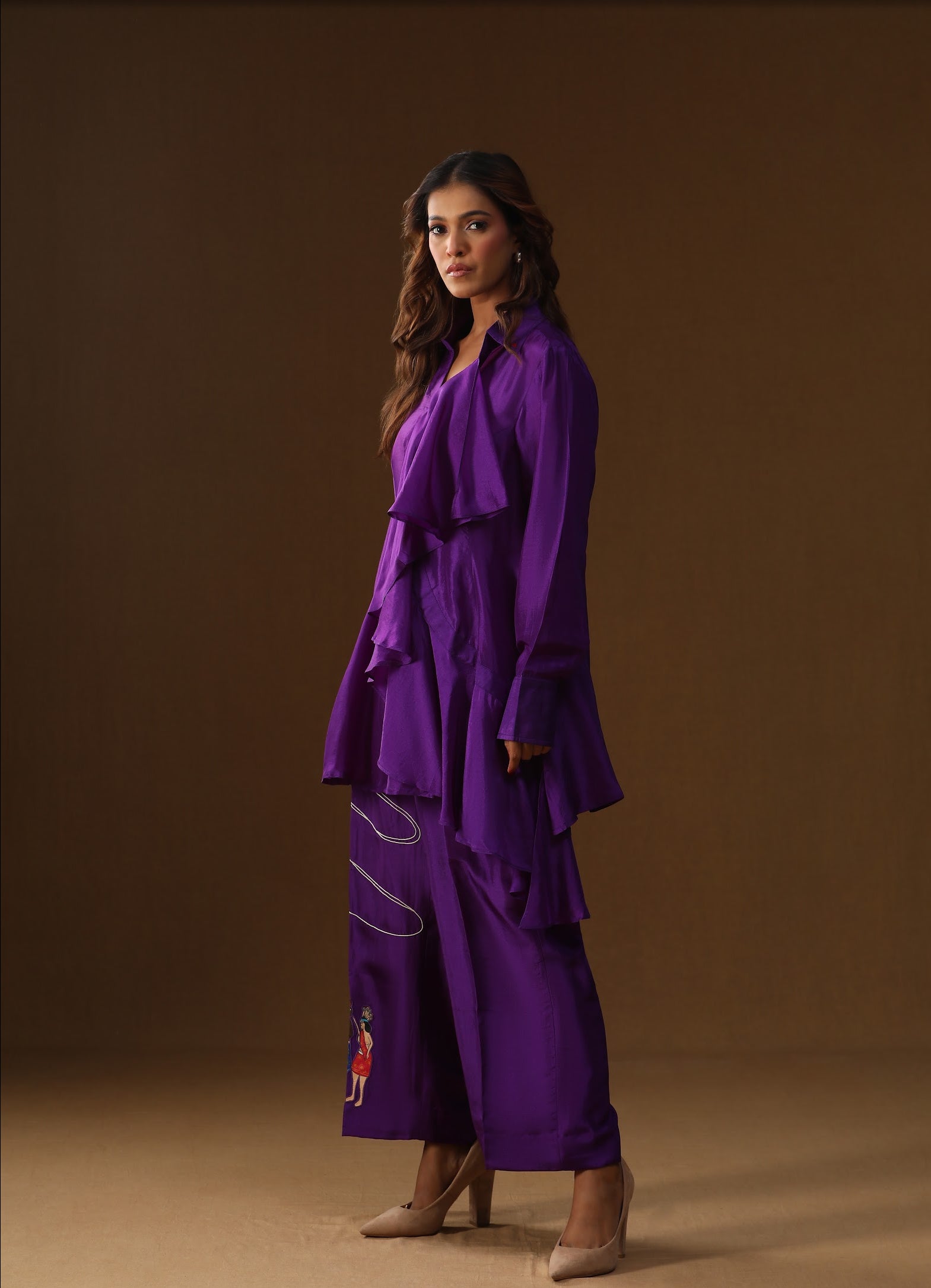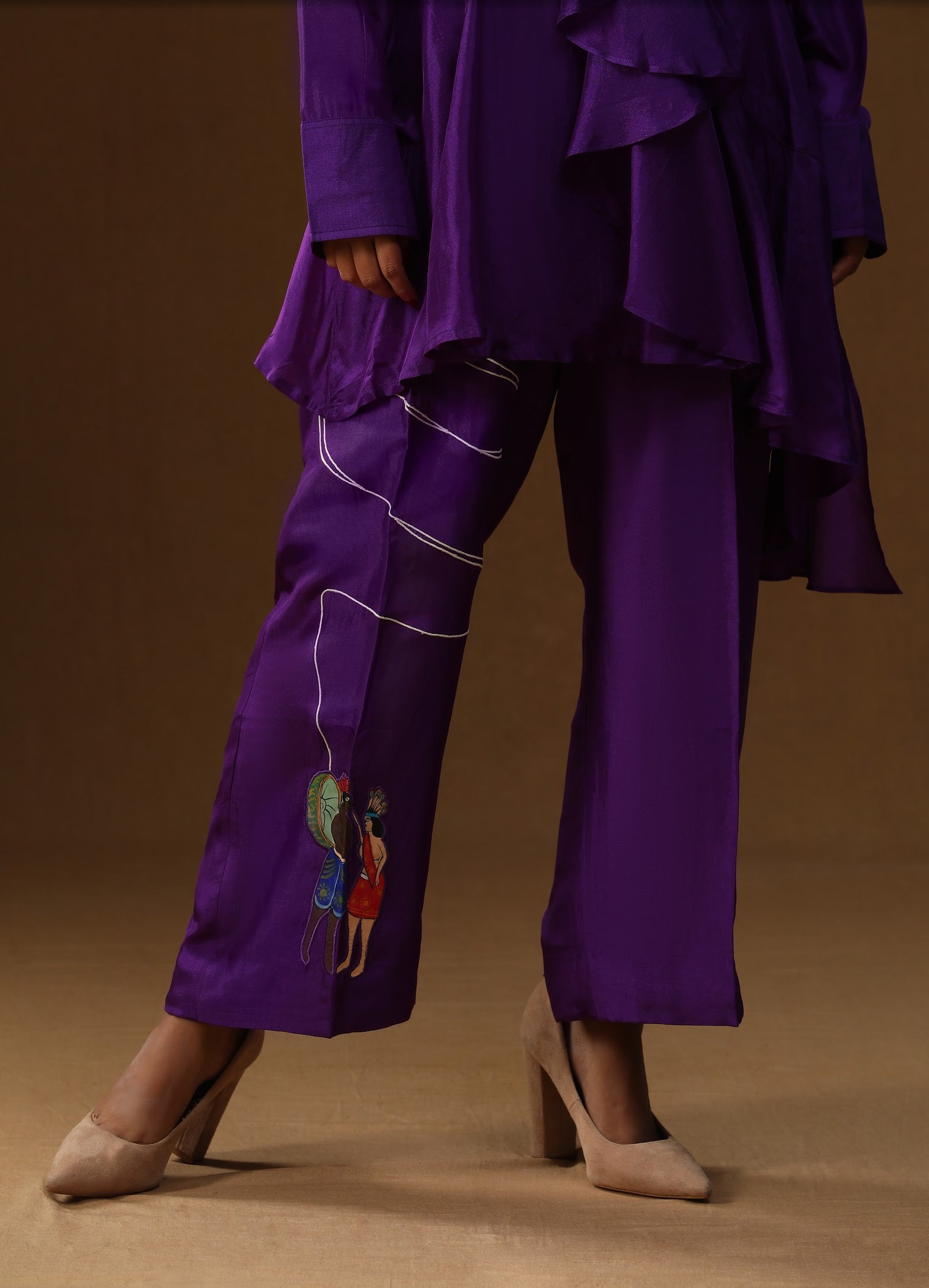 Description: This handpainted coord set is a stunning purple outfit! The top has a V-neck with ruffled layers,giving it a chic and stylish look. The pants are wide-legged and feature a unique handpainted design on one side-The pants have an intricate handpainted design on the lower leg, adding a touch of elegance to the overall look. The handpainted on the pants a colorful floral or abstract pattern, enhancing the visual of the coord set. The outfit is a purple coord set consisting of a long tunic and matching pants.