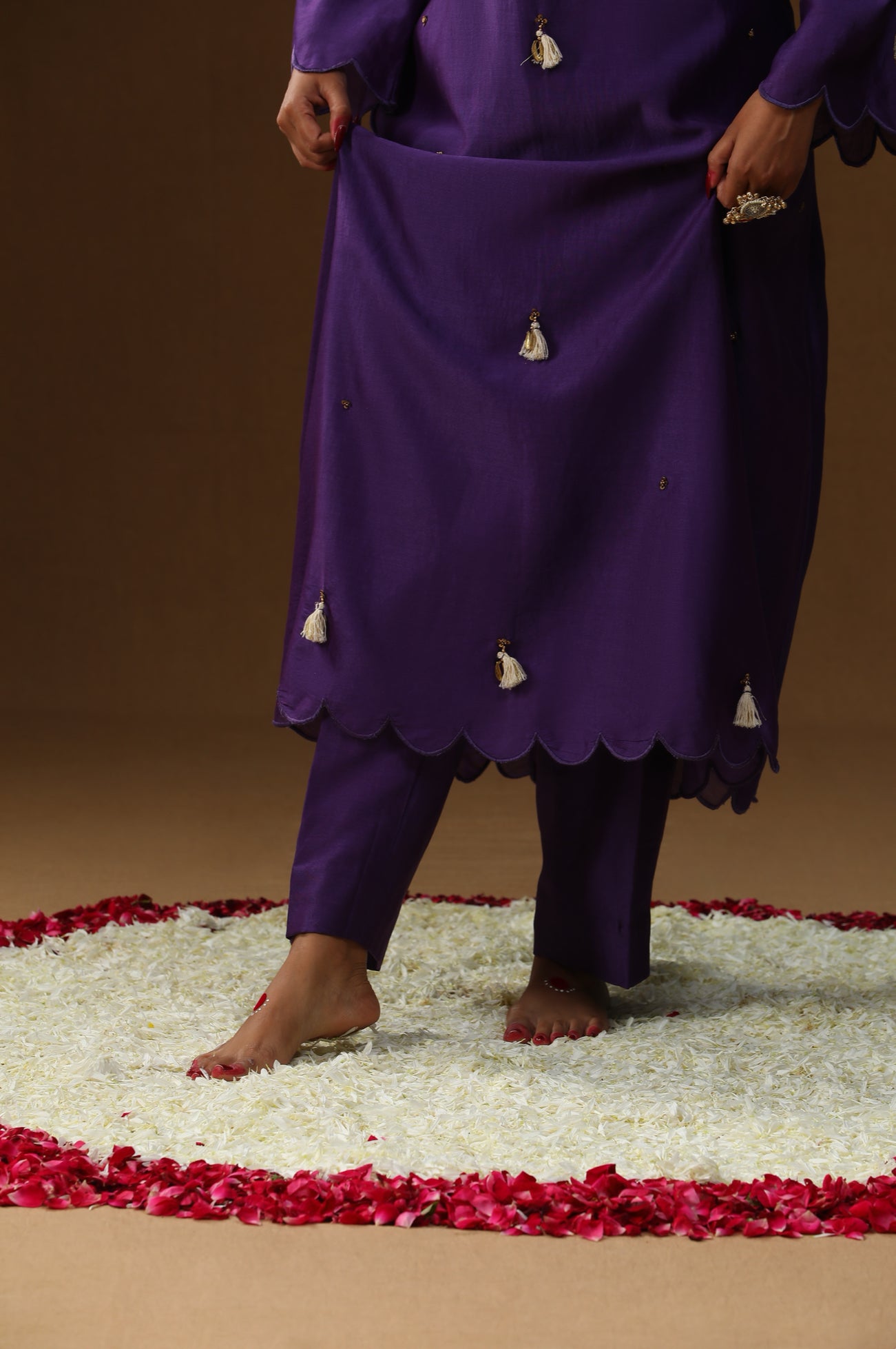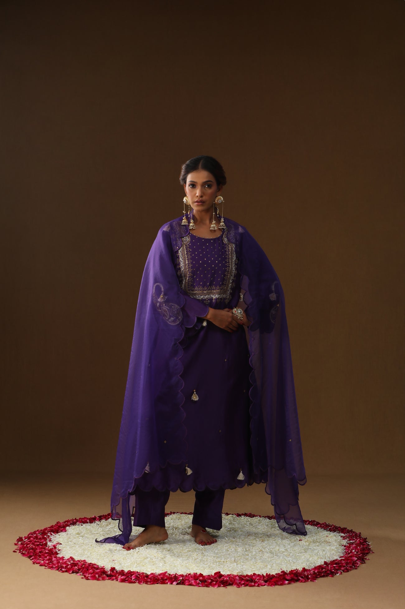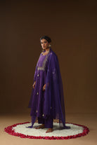 Description: Elegant and contemporary, the Purple Square Shape Suit Set from the Laal Ishq collection beautifully blends tradition with modern aesthetics. Crafted in luxurious chanderi stripes and chanderi fabric, this purple ensemble features subtle zari-thread detailing and a lightweight organza dupatta for a graceful finish. Perfect for festive gatherings and refined celebrations.