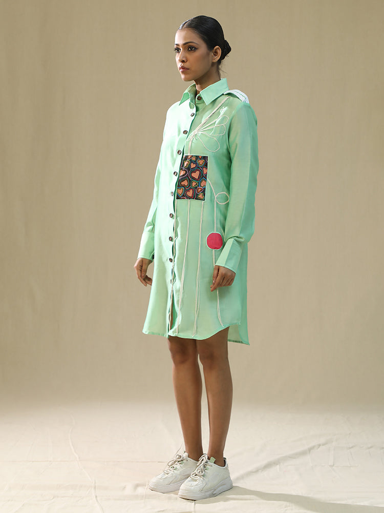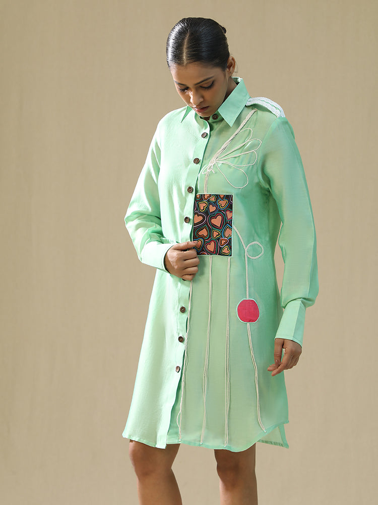 Description: The shirt is pista-green color, button-down shirt with a collar and long sleeves. It has a decorative patch on the front, featuring a floral pattern in shades. The shirt made of a chanderi silk material. The overall design suggests a casual, yet stylish piece of clothing suitable for everyday wear.