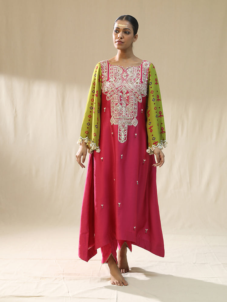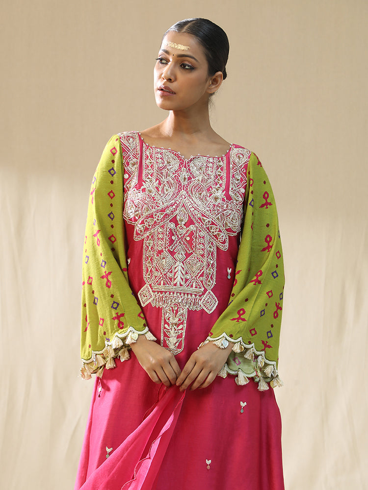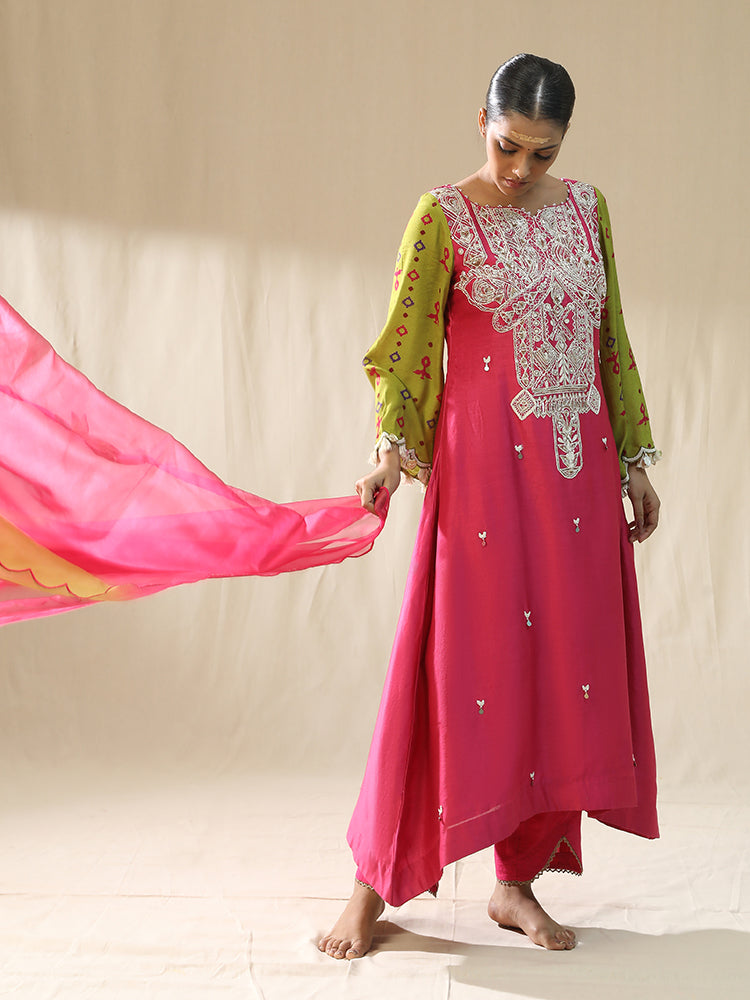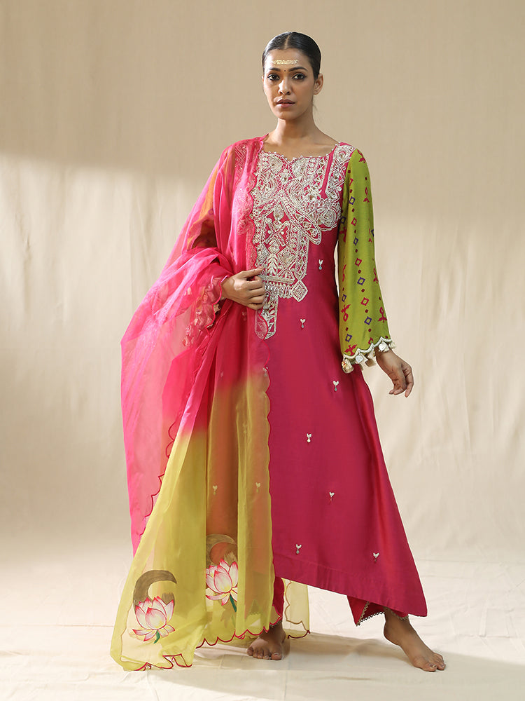Description:Taj Mahal Suit.The image depicts a woman wearing a vibrant, hand-painted embroidery suit. The suit is a stunning ensemble consisting of a long-sleeved kurta and a matching pant or duptta, accompanied by a flowing dupatta.The overall style of the suit is elegant and sophisticated, making it suitable for formal occasions or special events.