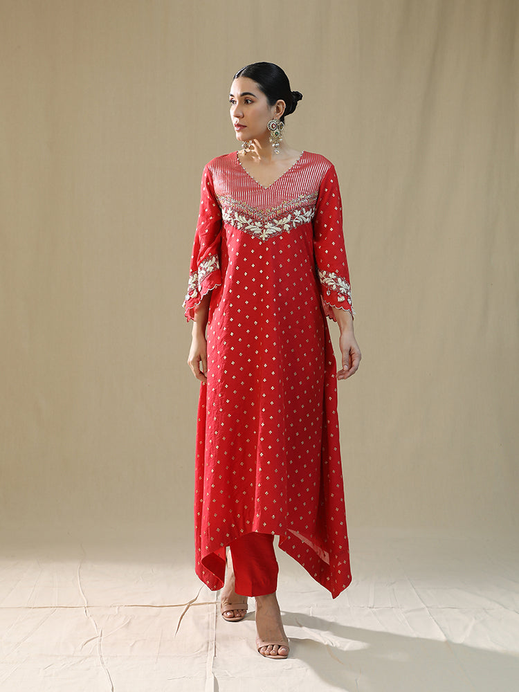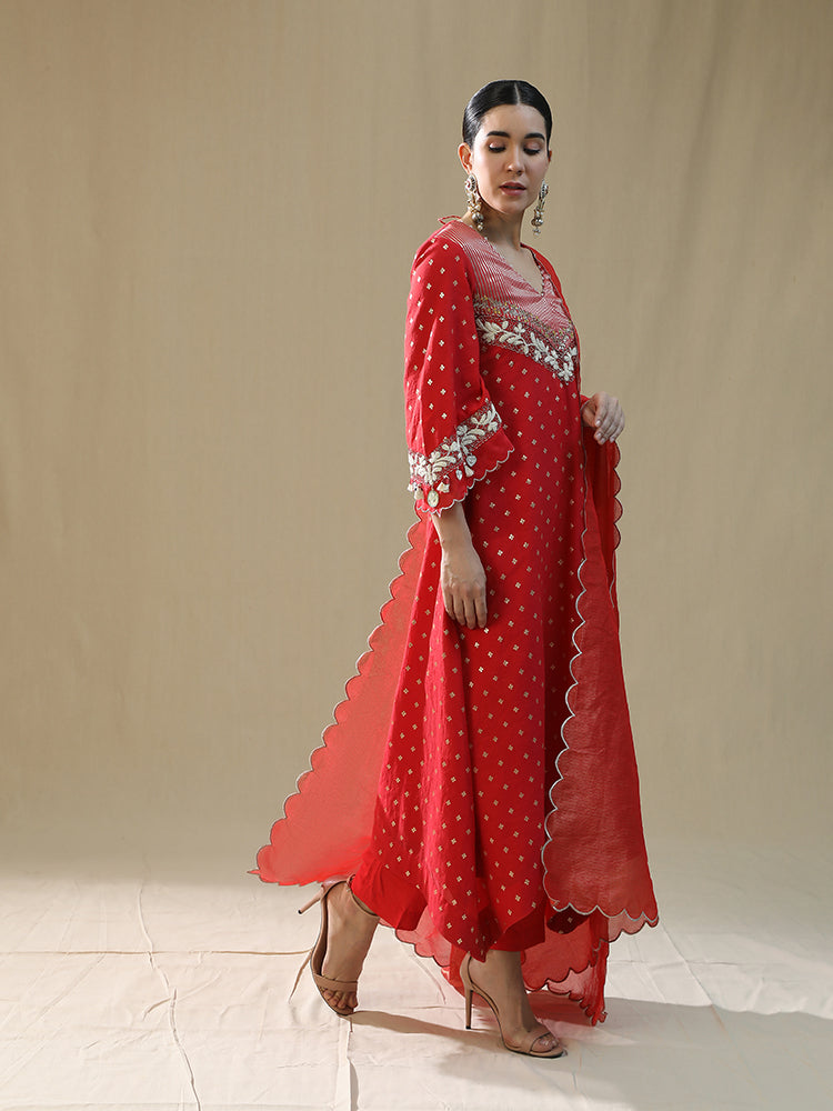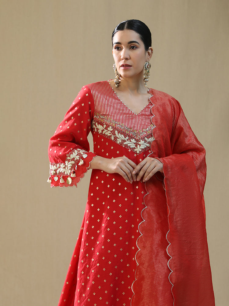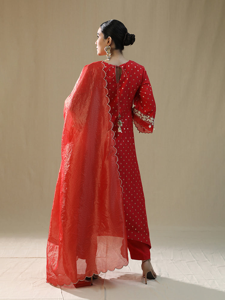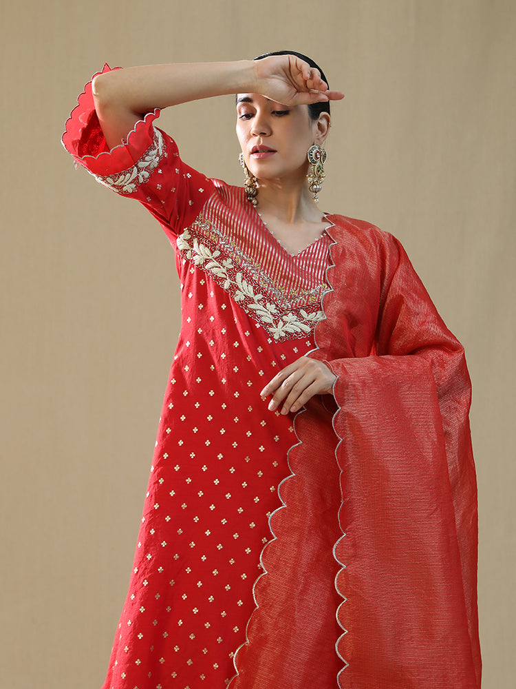 Description: The suit is adorned with intricate white embroidery on the neckline, sleeves, and front, featuring a mix of floral and geometric patterns. The fabric appears to be lightweight and possibly made of chanderi silk. The overall design exudes a sense of elegance and sophistication. The suit is paired with a matching dupatta, which adds to its traditional Indian charm.Red Self Chanderi Suit Set,Dori zardozi Sitara Resham