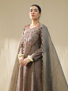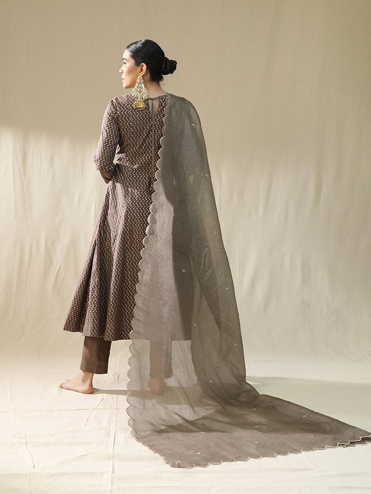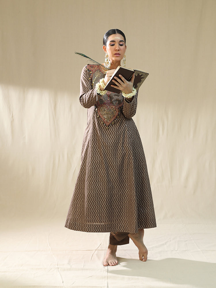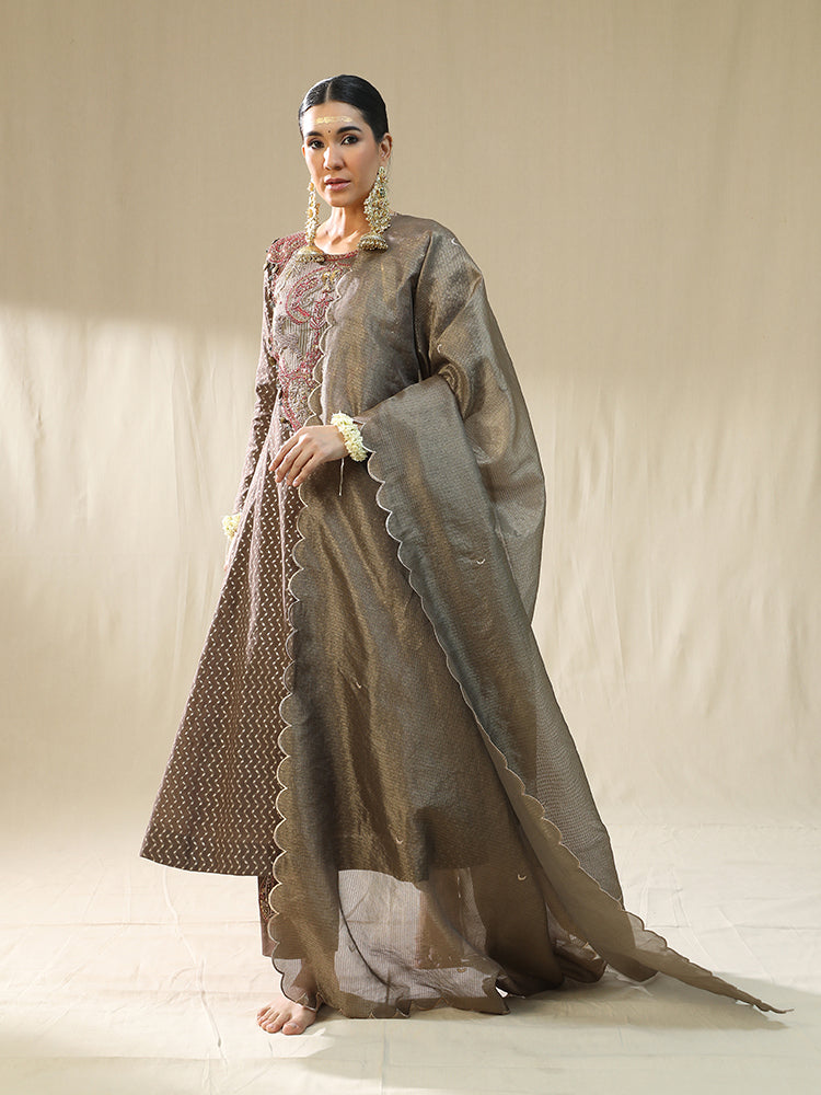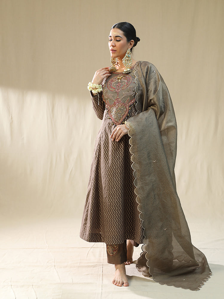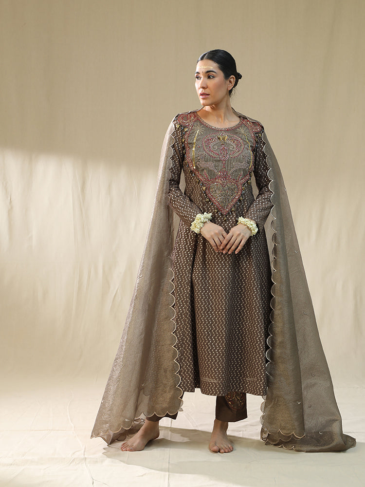 Description: This suit is a mocha chanderi silk fabric,Dori zardosi deer embroidered suit set. The image shows a woman wearing a long, embroidered suit with a matching dupatta. The suit is a mocha and features intricate deer embroidery red embroidery on the bodice and sleeves. The dupatta is also mocha color. The kastoori suit in the image is a stunning traditional outfit.  The suit is in shades of mocha with intricate embroidery on the chest area featuring red and gold patterns. The outfit is giving a touch of simplicity to the overall traditional attire.