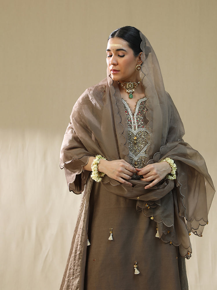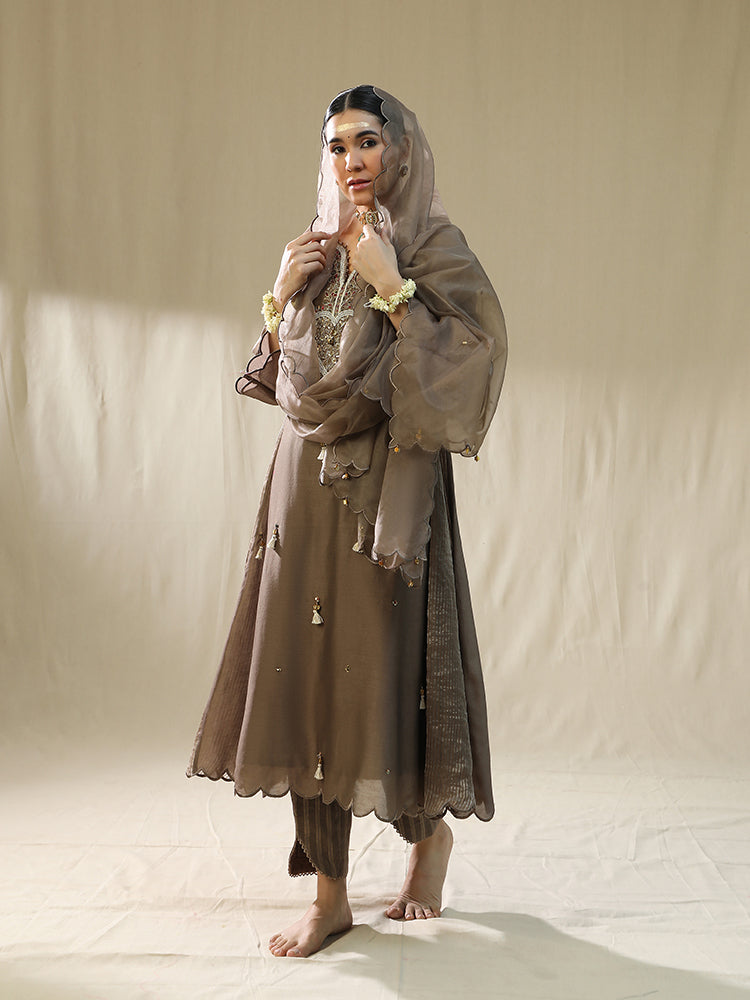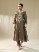 Description: Mocha Heart A Line Suit Set,Dori zardosi Sitara Resham. The image depicts a woman wearing an orange embroidered suit, which appears to be a traditional Indian outfit.The suit features intricate white embroidery on the front, including a heart-shaped design with tassels hanging from it. The embroidery is delicate and adds a touch of elegance to the overall look.