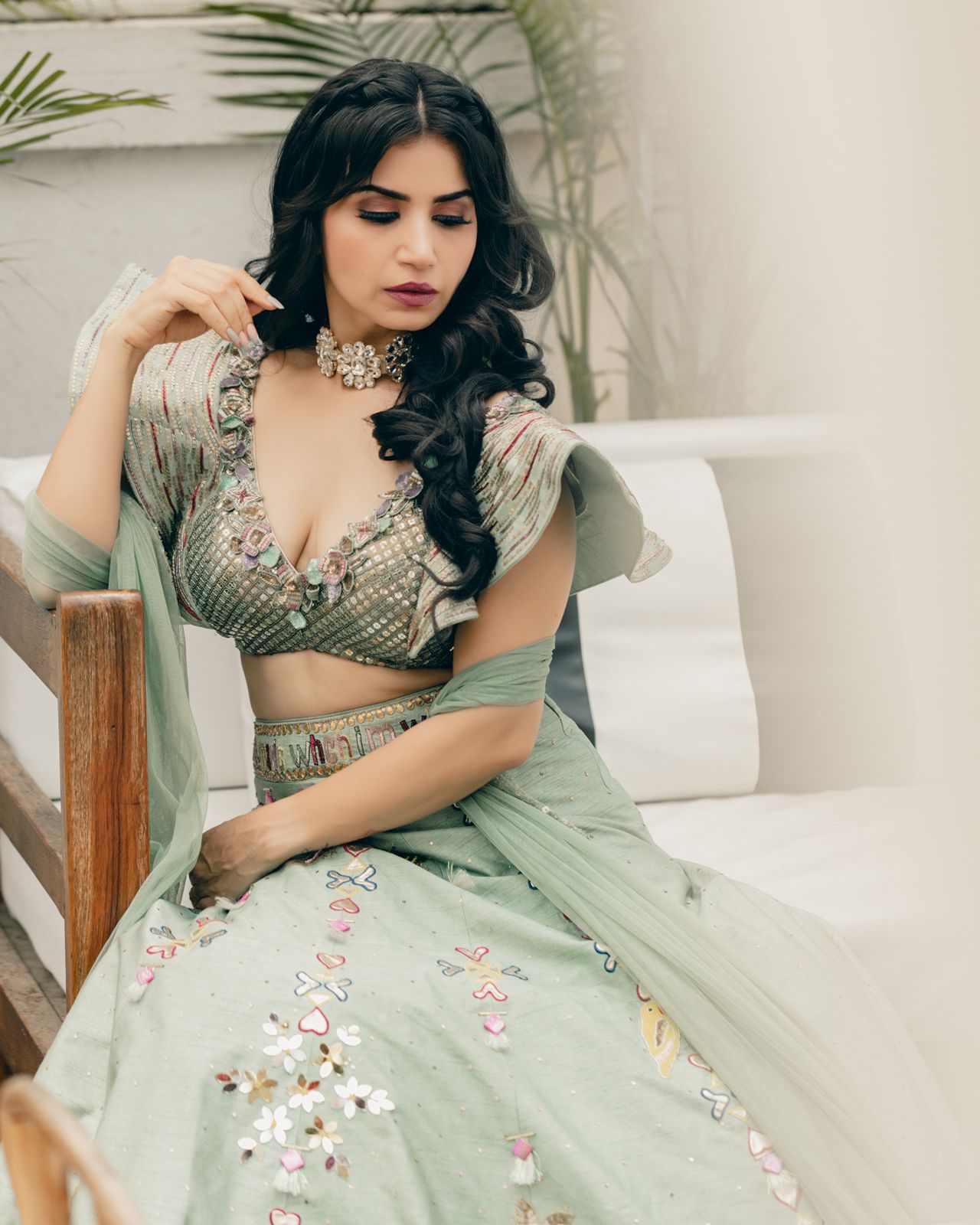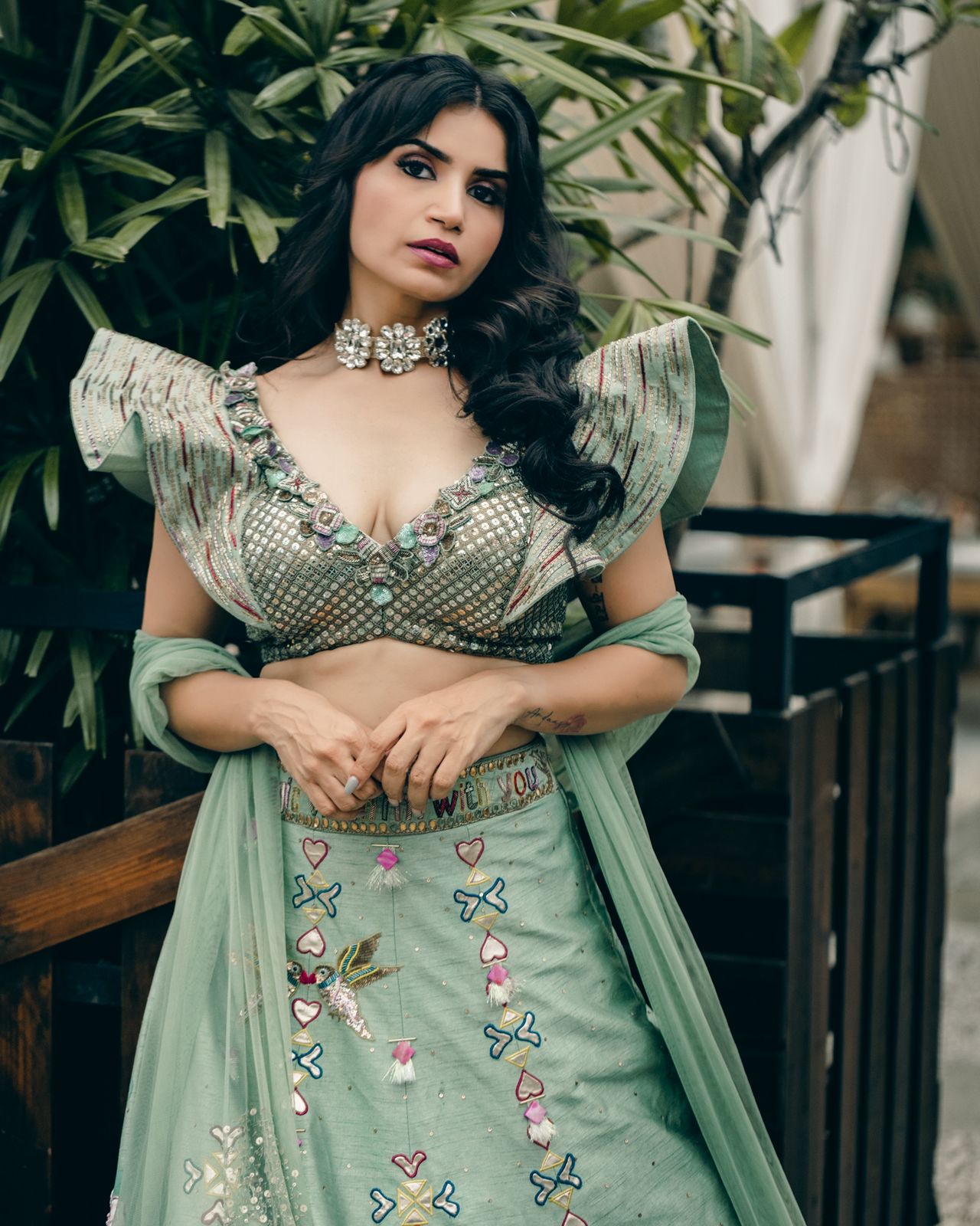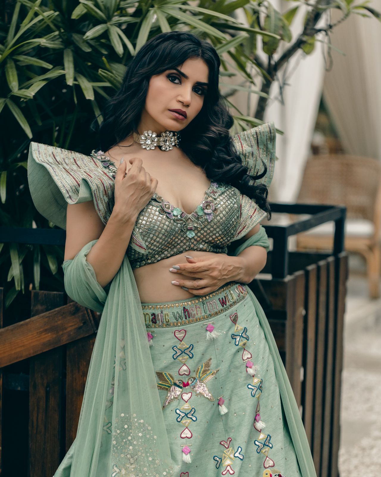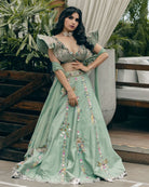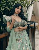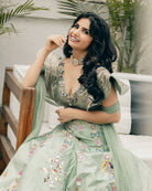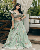 Description: Mint green lehenga in raw silk base with hand painting and mirror embroidery. Paired with a matching blouse. The woman's rocking a stunning mint green lehenga with intricate embroidery and a matching blouse that's totally on point. The blouse is a matching mint green with ruffled sleeves and heavy embellishments. The outfit's got a chic vibe going on with the embroidery and the way it's styled with a dupatta. The whole look's perfect for a festive occasion like a wedding or festivals.