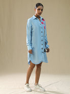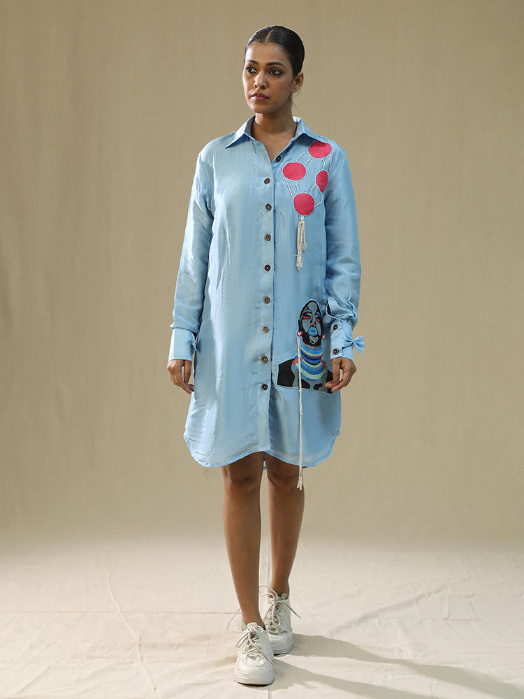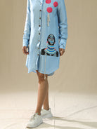 Description: This handpainted shirt is actually super cool, sky blue shirt-dress with some super cool artwork on it. It's got red circles kinda like polka dots on the upper part, near the collar. And then there's this awesome painted design of a person's face with a striped sweater on the lower front part of the shirt. The shirt has buttons down the front and looks like it's made of a comfy fabric summer silk.